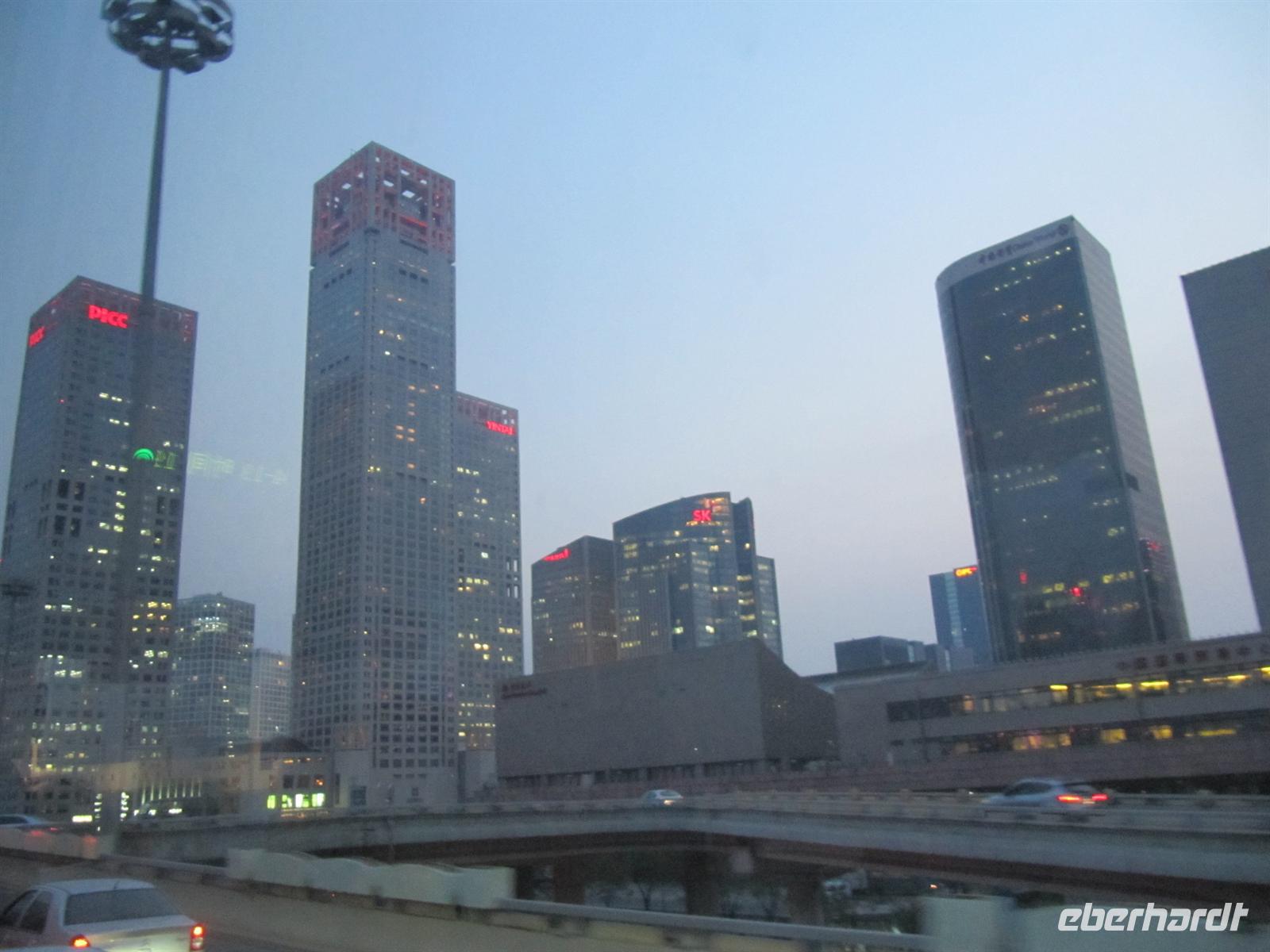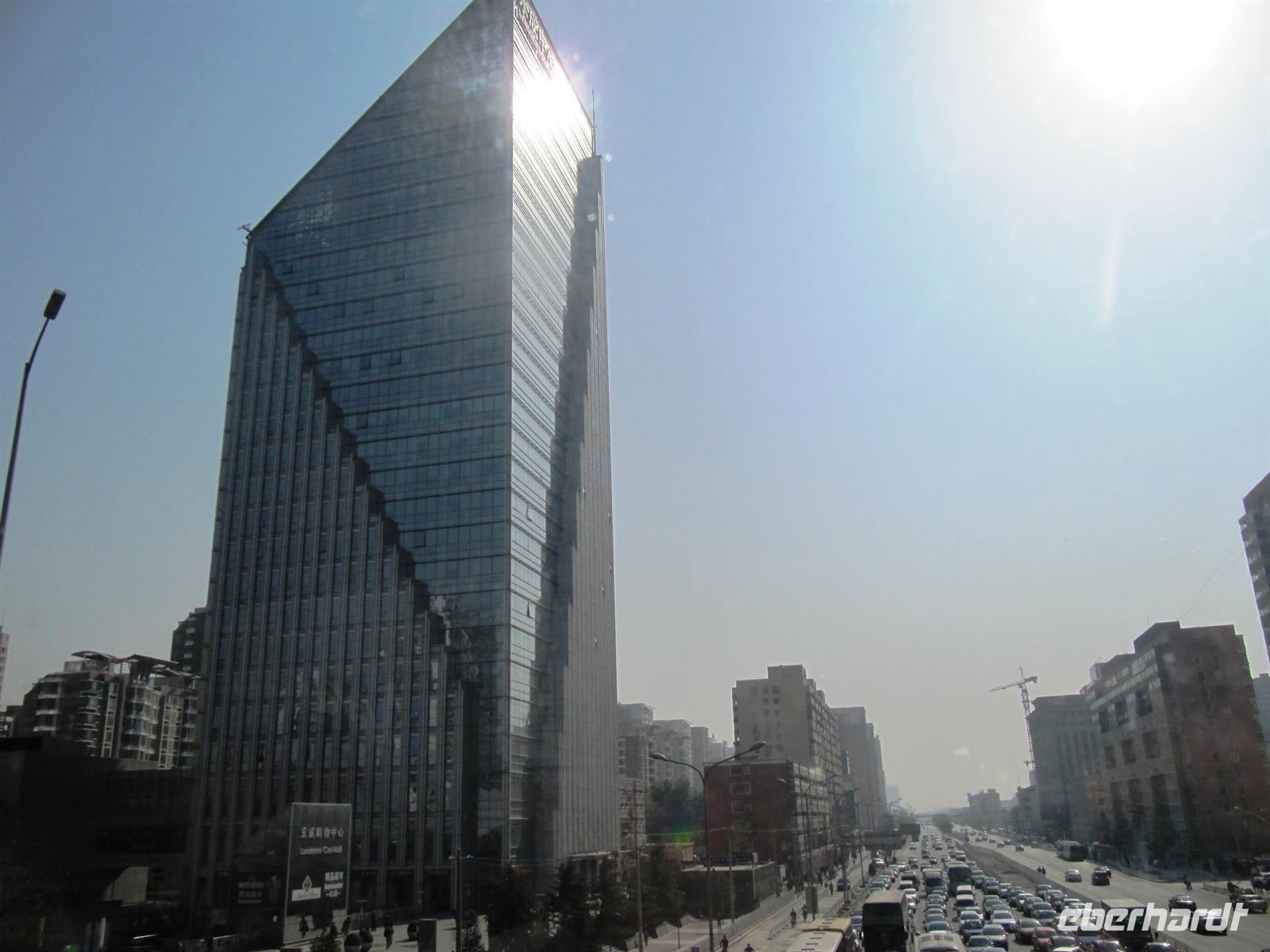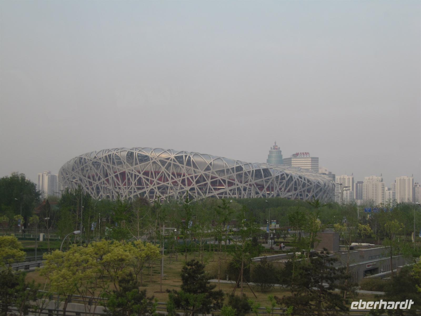 Auf der Rückfahrt nach Peking machten wir einen kleinen Abstecher zu einem Teil der Olympiaanlagen, auf welche wir im vorbeifahren einen kurzen Blick erhaschen konnten. Vor allem das architektonisch außergewöhnliche Olympiastadion, das “Schwalbennest“, bildete einen wunderbaren Kontrast zu den hoch aufragenden Bürotürmen der City.