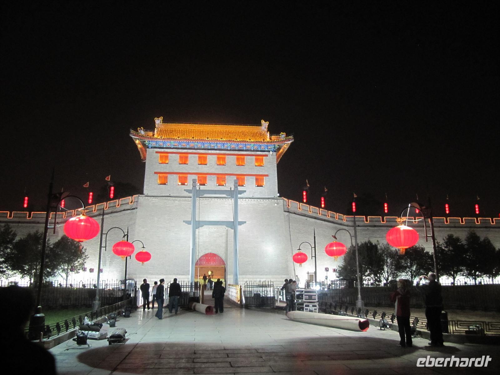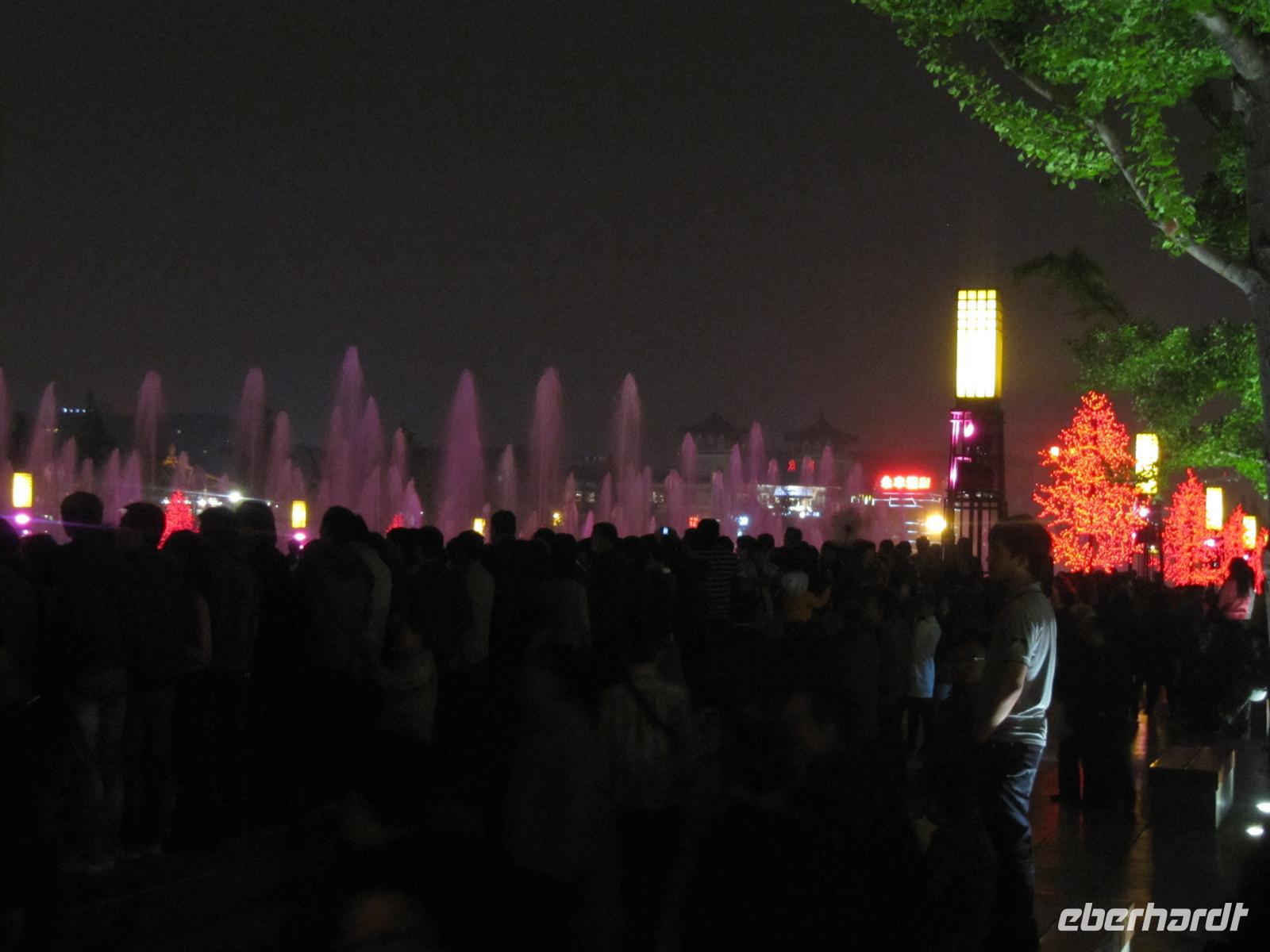 vermitteln. Vom Flughafen ging es zuerst zur alten, 12 Meter hohen und ebenso breiten rekonstruierten Stadtmauer der 8,5 Millionen-Metropole, von welcher aus man einen guten Rundblick auf die prosperierende Stadt hat, die in der Tang-Dynastie immerhin als größte Stadt der damaligen Welt galt. Anschließend ging es ins Hotel, um uns kurz auszuruhen und für das Abendessen vorzubereiten. Wie immer gab es mehrere Gänge, die abwechslungsreich und schmackhaft zubereitet waren. Wer wollte und trotz des langen Tages noch nicht müde war, konnte an einer Lichterfahrt durch das nächtliche Xi’An teilnehmen. Höhepunkt dieser abendlichen Tour waren die mit Musik und Licht untermalten Wasserspiele unterhalb der Wildganspagode, die jeden Abend um 20:30 Uhr Anziehungspunkt für viele tausend Besucher sind. Auch die wunderschön illuminierte Stadtmauer sowie der geschäftige Nachtmarkt, auf dem zu später Stunde noch ein reges Treiben herrschte, waren Besichtigungsstationen bei dieser einzigartigen Tour. Müde, aber voller neuer Eindrücke gingen wir dann zu später Stunde ins Bett.