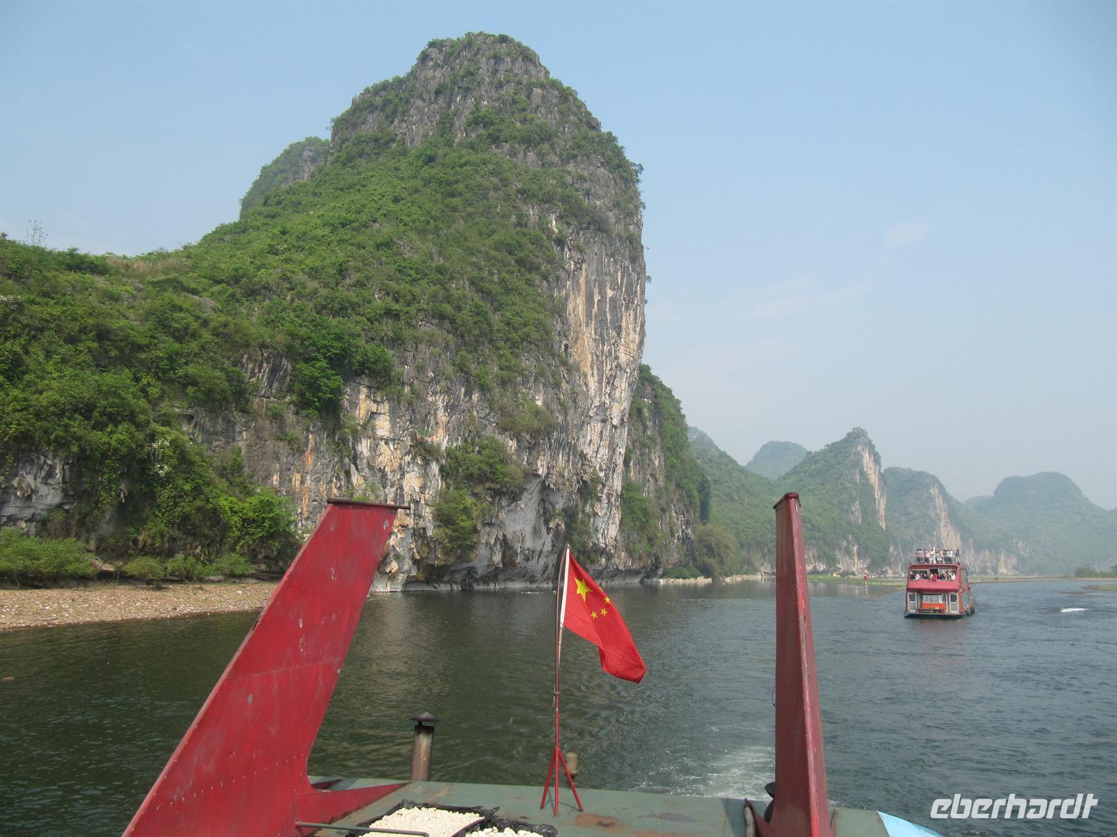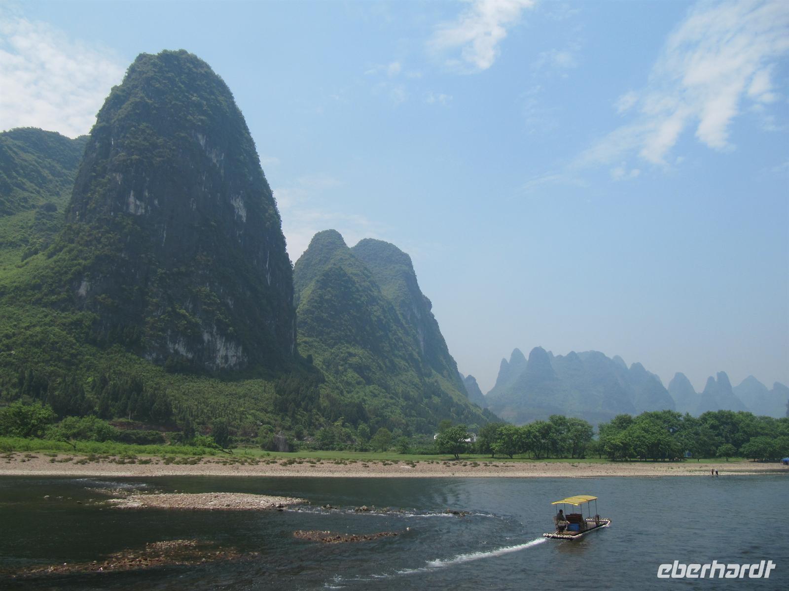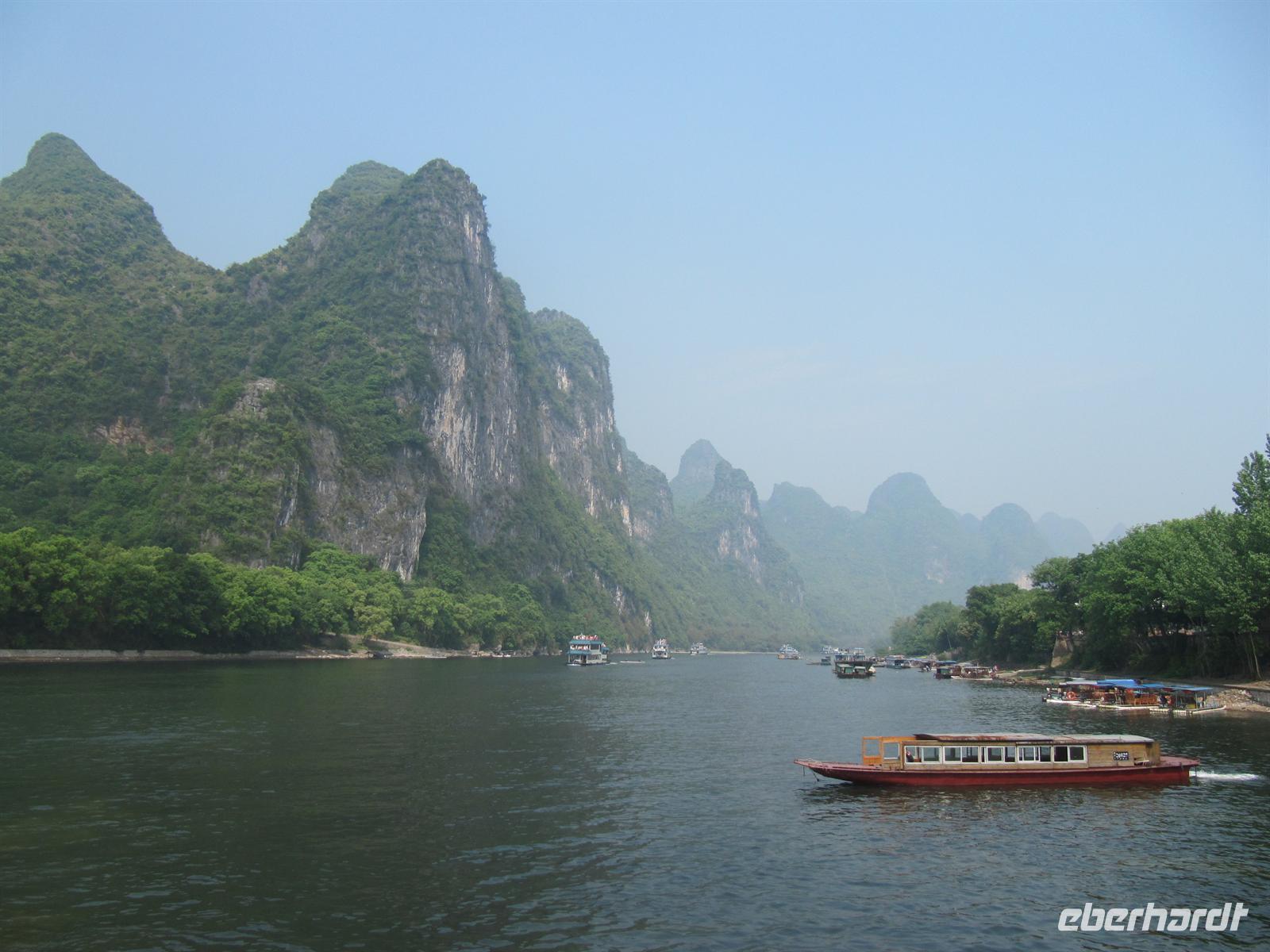 dass sie es bis auf den 20 Yuan-Schein geschafft haben. Schiff an Schiff schlängelt sich auf dem grünen Band des Li-Flusses in das ca. 60 Kilometer entfernte Yangshuo hinab und überall stehen die Menschen auf dem Oberdeck und füllen Gigabytes an Speicherkapazitäten mit immer neuen Formen, Ansichten und Blickwinkel dieser sagenhaften Flusslandschaft. Das schöne Wetter, die bezaubernde Natur und ein kräftiges Mittagessen an Bord lassen die Seele baumeln und die Gedanken schweifen.