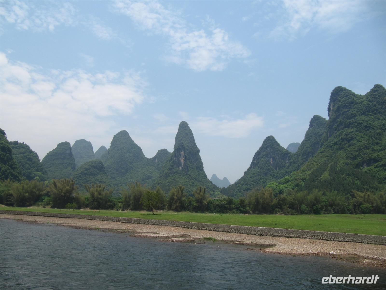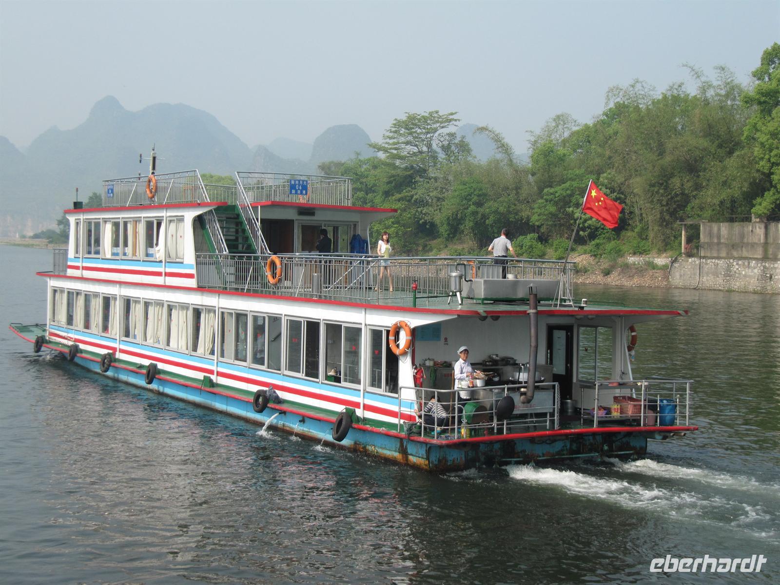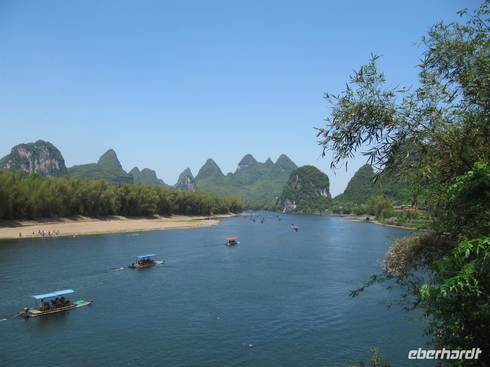 dass sie es bis auf den 20 Yuan-Schein geschafft haben. Schiff an Schiff schlängelt sich auf dem grünen Band des Li-Flusses in das ca. 60 Kilometer entfernte Yangshuo hinab und überall stehen die Menschen auf dem Oberdeck und füllen Gigabytes an Speicherkapazitäten mit immer neuen Formen, Ansichten und Blickwinkel dieser sagenhaften Flusslandschaft. Das schöne Wetter, die bezaubernde Natur und ein kräftiges Mittagessen an Bord lassen die Seele baumeln und die Gedanken schweifen.
