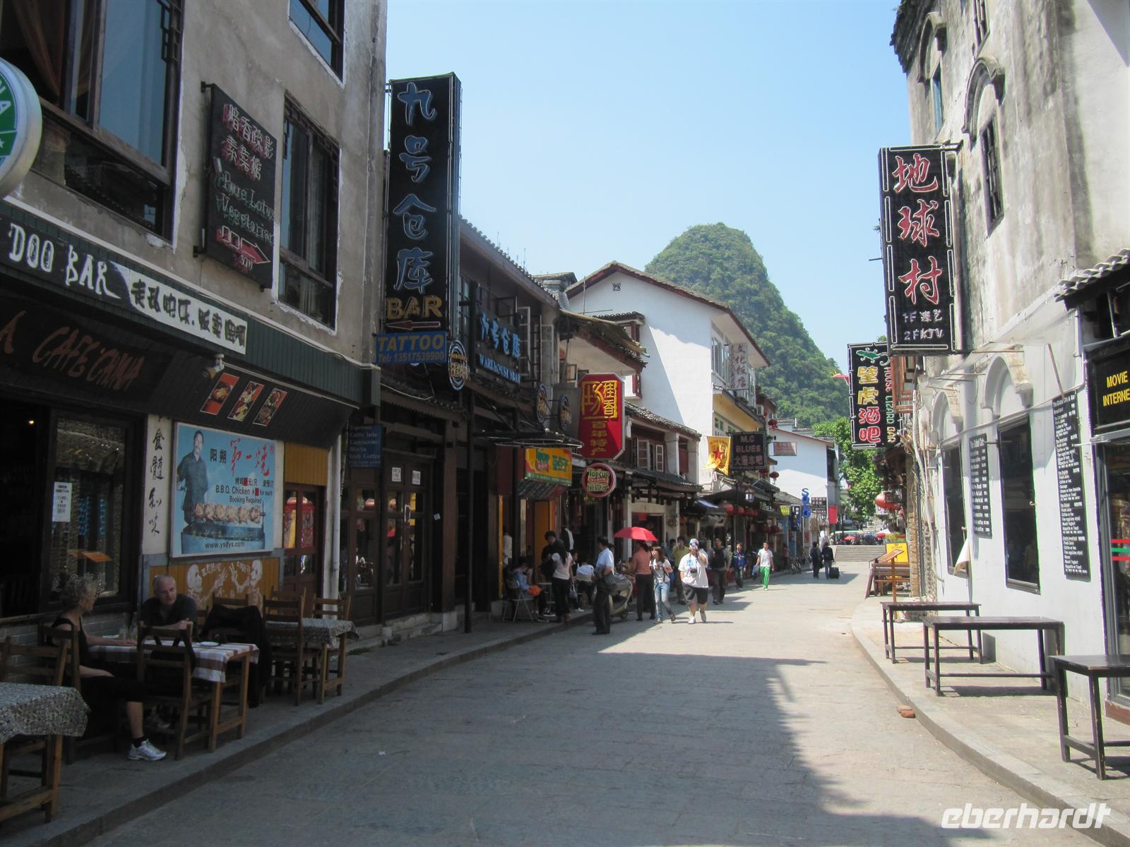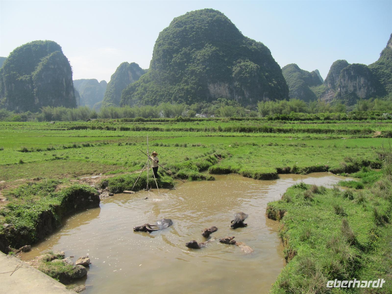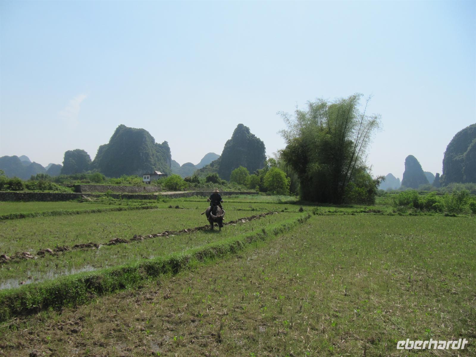 Von Yangshuo aus geht es mit sechssitzigen Elektrofahrzeugen über teilweise schlecht befestigte Straßen ins Hinterland, zu den Reisefeldern, den kleinen Dörfern mit ihren einfachen, aber freundlichen Menschen, zu dem Bauer mit dem Wasserbüffel, zu der Familie, die den Besuchern Obst und Früchte aus dem eigenen Anbau zum Probieren anbietet. Auch wenn vieles davon nur noch Folklore ist und sich die Bedingungen gebessert haben, bekommt man doch einen kurzen Blick auf die, vielleicht schon vergangene, Epoche eines China, wie es in unseren westlichen Vorstellungen lange Zeit existierte. Die Realität 2011 ist dagegen eine ganz andere.