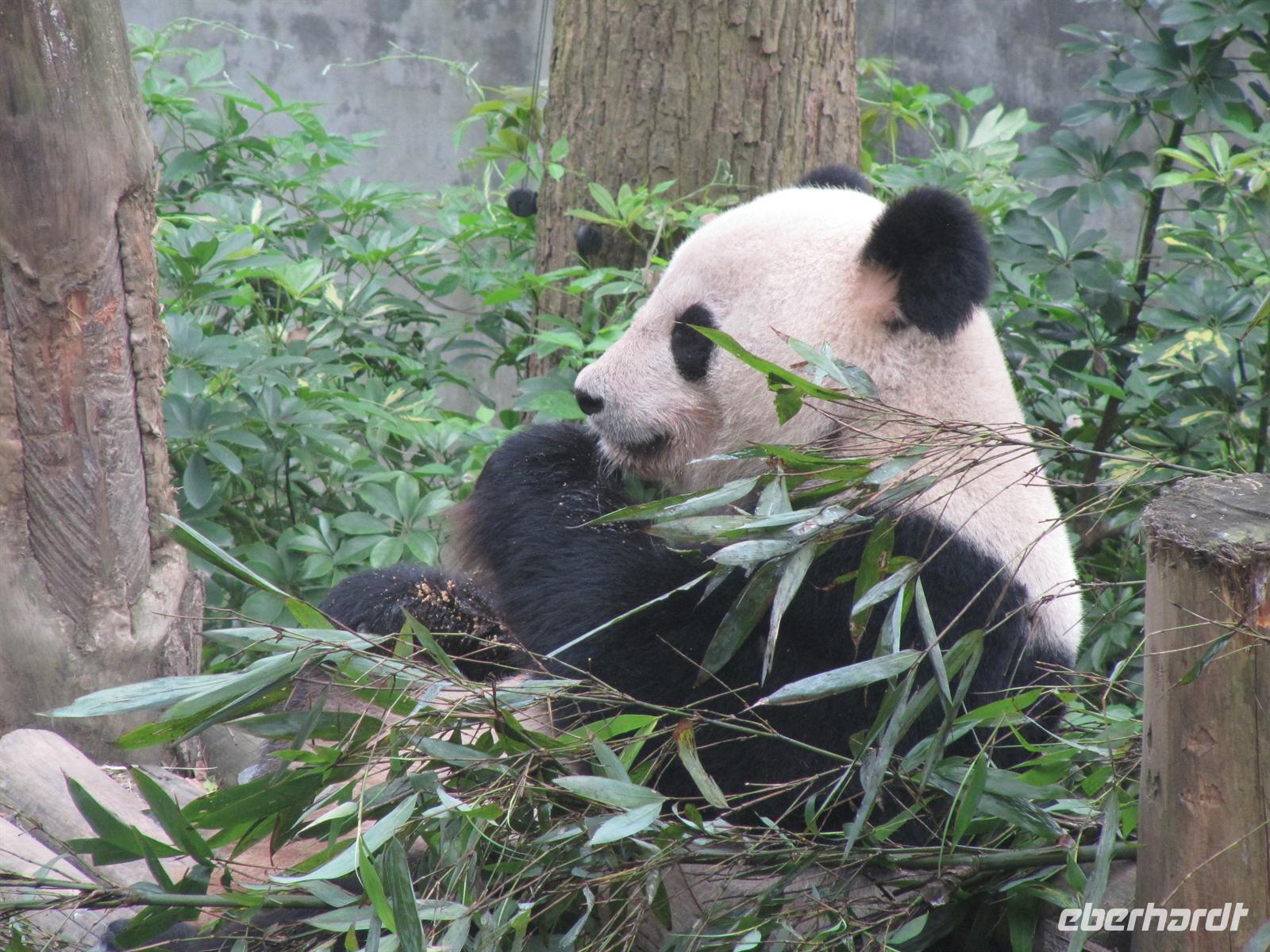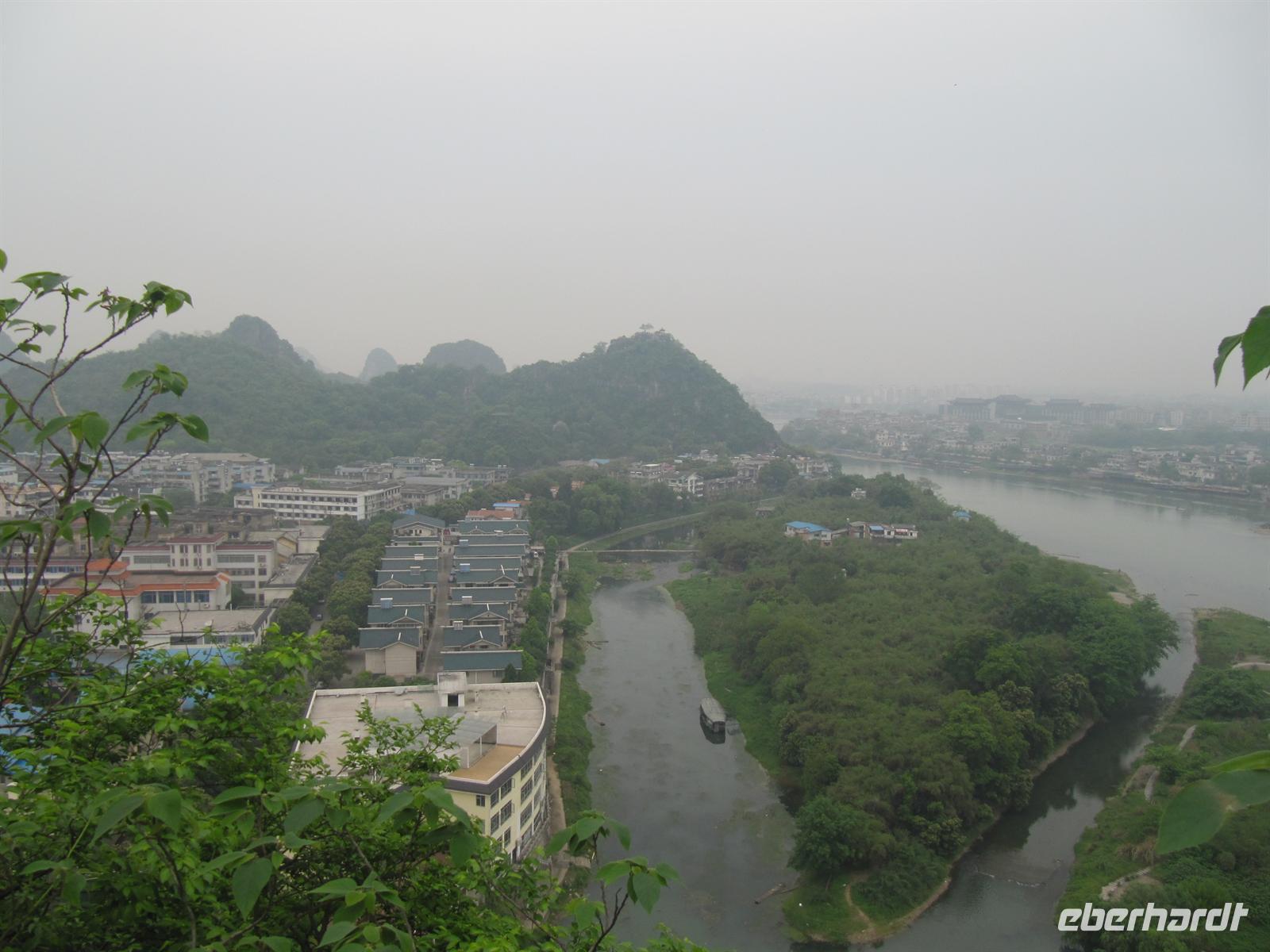 Obwohl sich heute die Sonne nicht am Himmel zeigt, bleibt uns das Wetter trotzdem gewogen und wartet mit neuen Niederschlägen bis nach unserer Abreise aus Guilin. Nachdem wir also aus unserem Hotel ausgecheckt haben, geht es mit dem Bus zum Sieben-Sterne-Park, der durch sieben Hügel geprägt wird, die in der Konstellation den Sternen des Großen Wagens ähneln. Daher auch der Name. Obwohl der Park eine Vielzahl an Sehenswertem bereithält, interessieren uns bei unserer kurzen Stippvisite in erster Linie die drei Pandabären, die seit wenigen Jahren mit anderen Tieren den kleinen Zoo bewohnen. Drei Weibchen, die sich durch unsere Anwesenheit nicht aus ihrer Ruhe bringen lassen, gleichzeitig aber für viele schöne Fotos sorgen. Danach geht es zum Fuboberg, auch Wellenbrecher-Berg genannt, der sich mitten in der Stadt ca. 70 Meter hoch erhebt. Nach etlichen Stufen erreicht man die Bergspitze, von wo aus man einen schönen Blick auf Guilin und den Li-Fluss hat. Bevor es jetzt Abschied nehmen heißt vom Land der