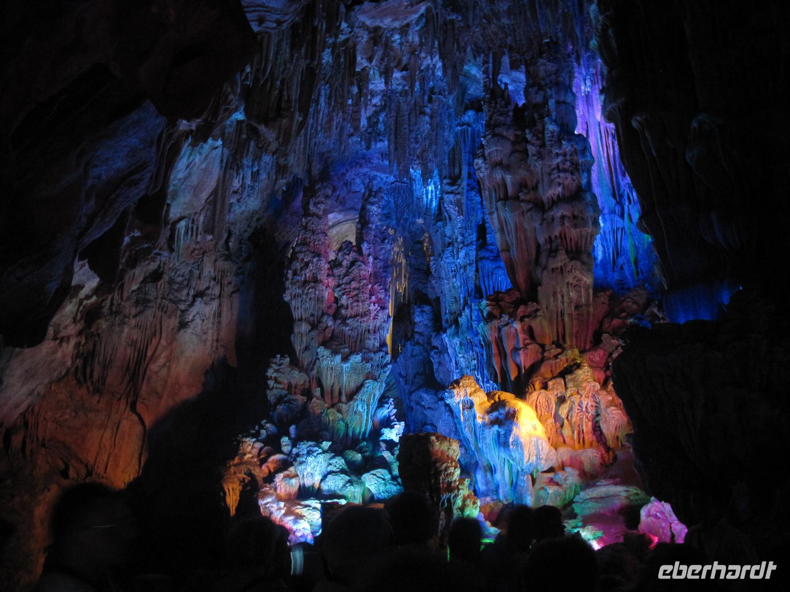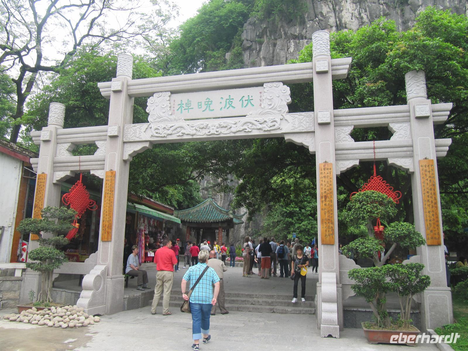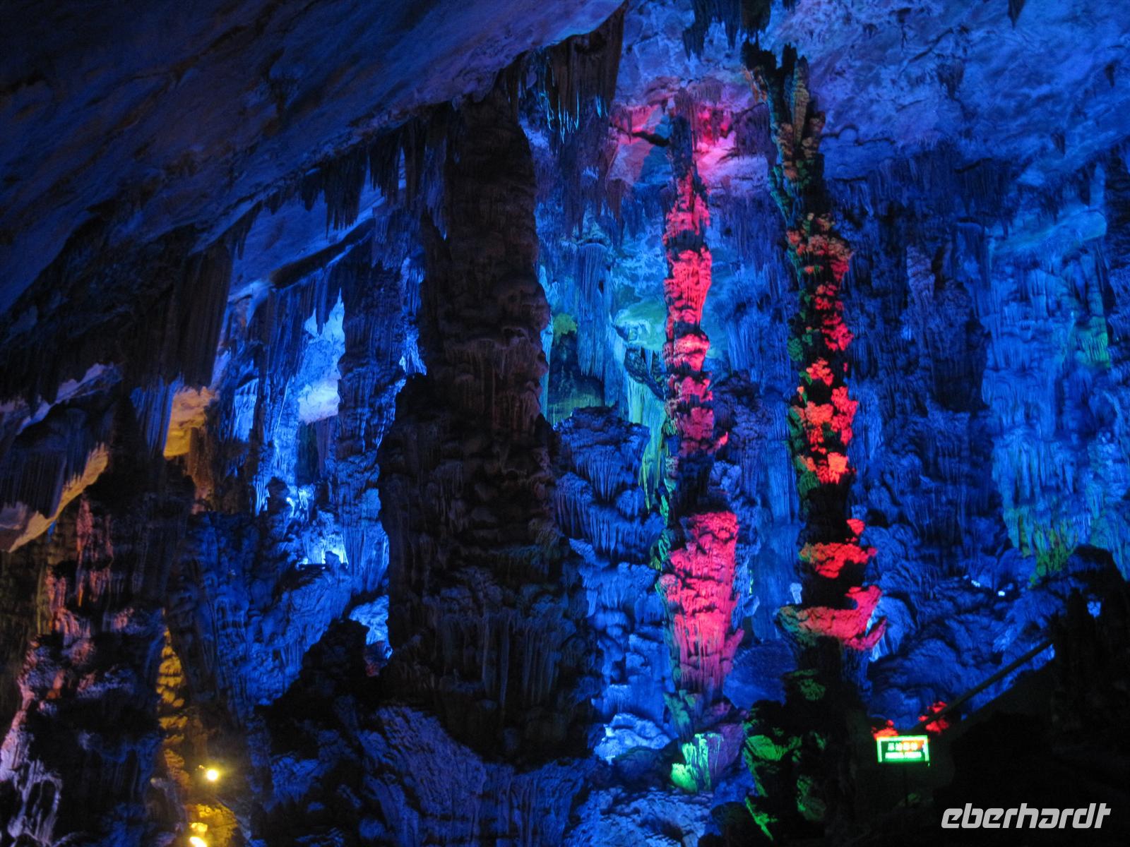 faszinierenden Karstkegel, geht es noch sechs Kilometer in nordwestliche Richtung zur 240 Meter tiefen Schilfrohrflötenhöhle. Bizarre Tropfsteingebilde, bunt ausgeleuchtet, lassen beim Betrachter fantasievolle Wesen erscheinen. Tiere, Pflanzen, Pagoden, Pilze - der individuellen Vorstellung und Erkenntnis der Stalagmit- und Stalaktitformen sind keine Grenzen gesetzt. Zurück ans Tageslicht bringt uns unser Busfahrer zum Flughafen nach Guilin. Hier verabschieden wir unseren örtlichen Reiseleiter Zeng, Bruder Jakob, und besteigen den Flieger nach Hangzhou. Unsere Koffer wurden wieder durch hilfreiche Geister eingecheckt, so dass wir nur noch die Sicherheitskontrollen passieren mussten und uns anschließend in knapp zwei Stunden nach Hangzhou tragen lassen konnten. Nach pünktlicher Landung erwartete uns unsere Reiseleiterin, Frau Wang Lei, und ab ging es in Richtung Acht-Millionen-Metropole. Nach einstündiger Fahrt und erneuter Bewunderung des Verkehrschaos solcher Großstädte genossen wir unser Abendessen und fuhren anschließend in unser Hotel, welches uns für die nächsten zwei Tage als Domizil in der Hauptstadt der Provinz Zhejiang dienen sollte.