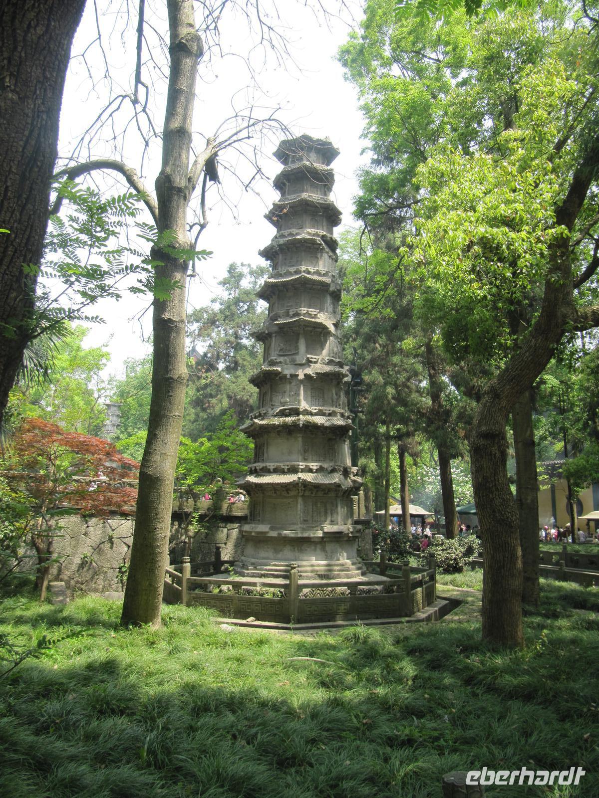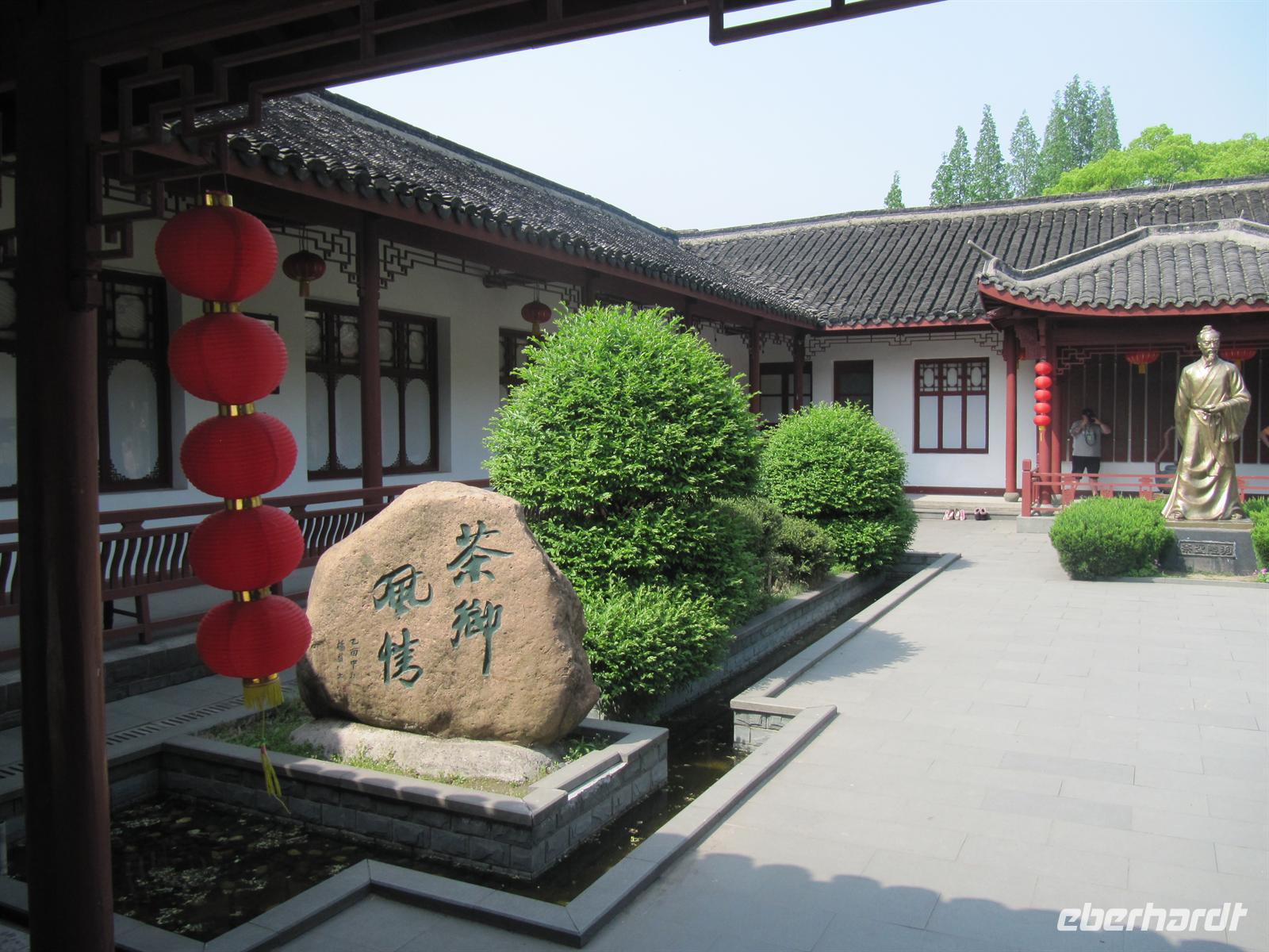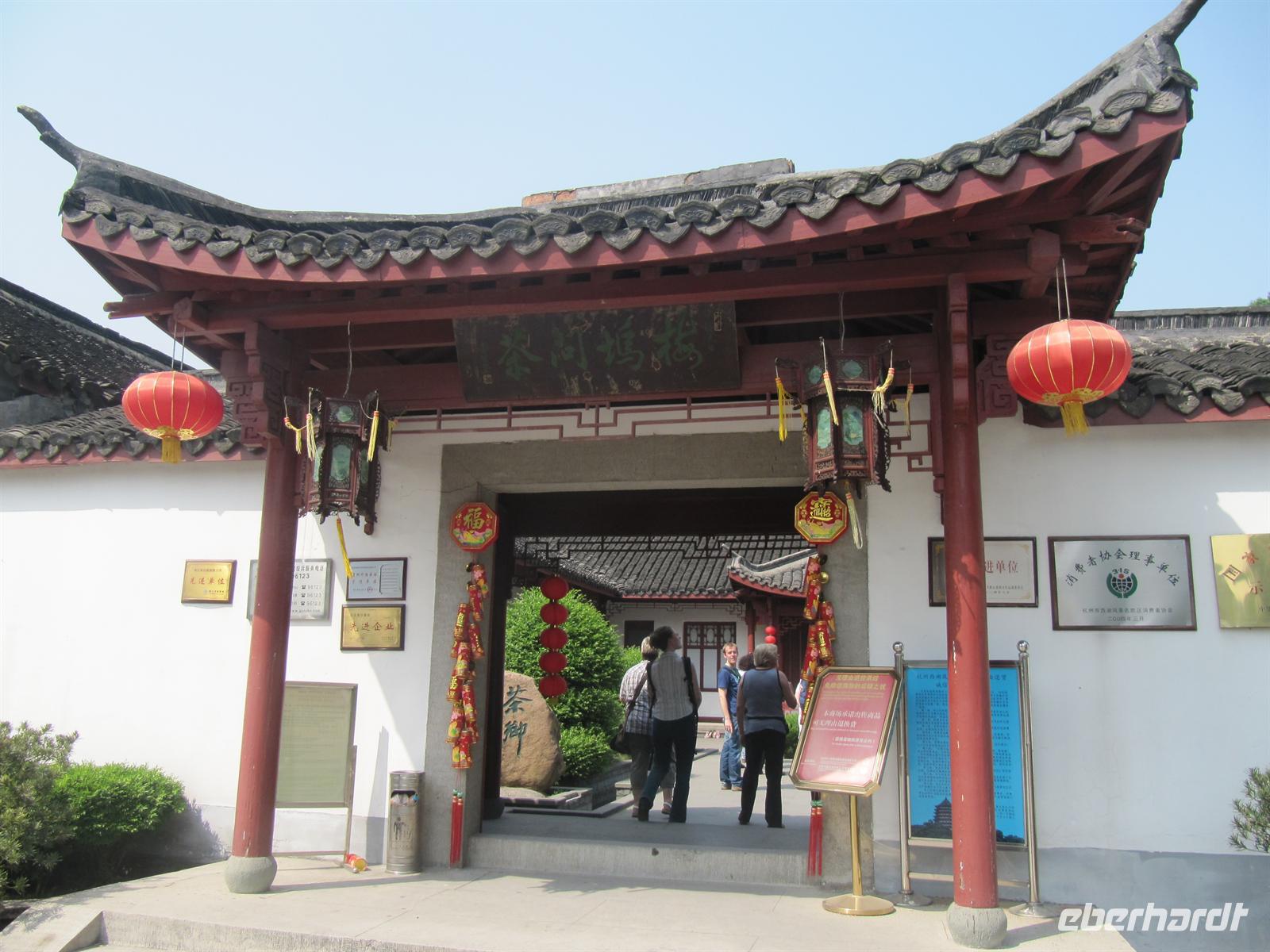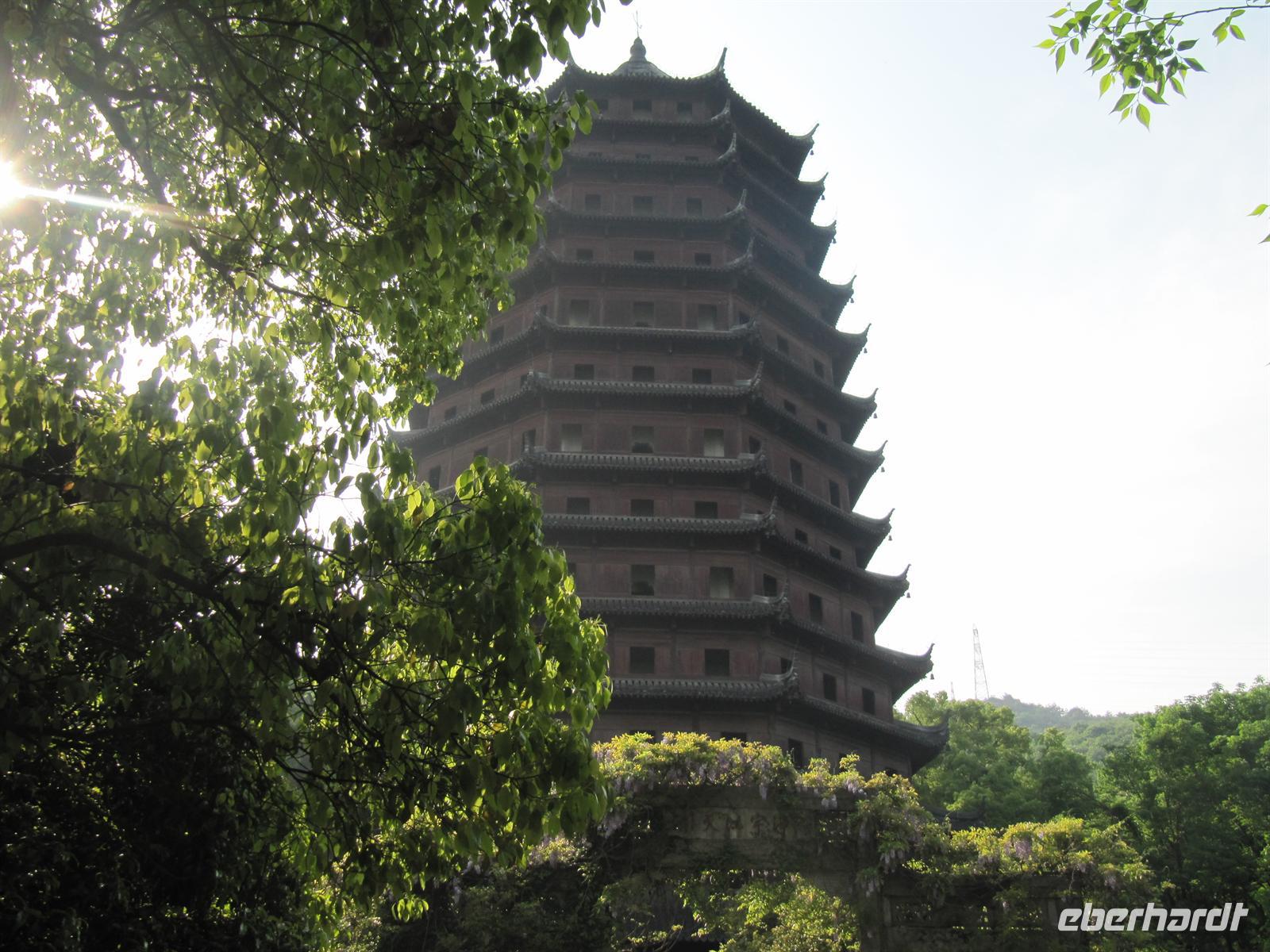 Unser nächster Programmpunkt macht uns mit einer Spezialität vertraut, die hier beheimatet ist und zur Creme de la Creme von ganz China gehört: Tee aus Hangzhou. Auf einer Teeplantage erfahren wir etwas zur Teeernte und Zubereitung und können selbstverständlich von dem exzellenten und frisch geernteten Frühlingstee kosten. Die Teetrinker und Teekenner unter uns packen die Gelegenheit beim Schopfe und nehmen Kostproben mit nach Hause. Nach diesem, dem Genuss zuzuordnenden Intermezzo wartet wieder die Religionskultur auf uns, in Gestalt der Sechs-Harmonien-Pagode. Diese ragt am Ufer des Qiantang gut 60 Meter in den Himmel und ist aufgrund ihrer massigen Gestalt ein weithin sichtbares Symbol. Wer mag, kann gegen kleines Geld die ausgetretenen Stufen bis zum siebenten Stockwerk erklimmen und einen fantastischen Blick über den Fluss und die Stadt genießen.