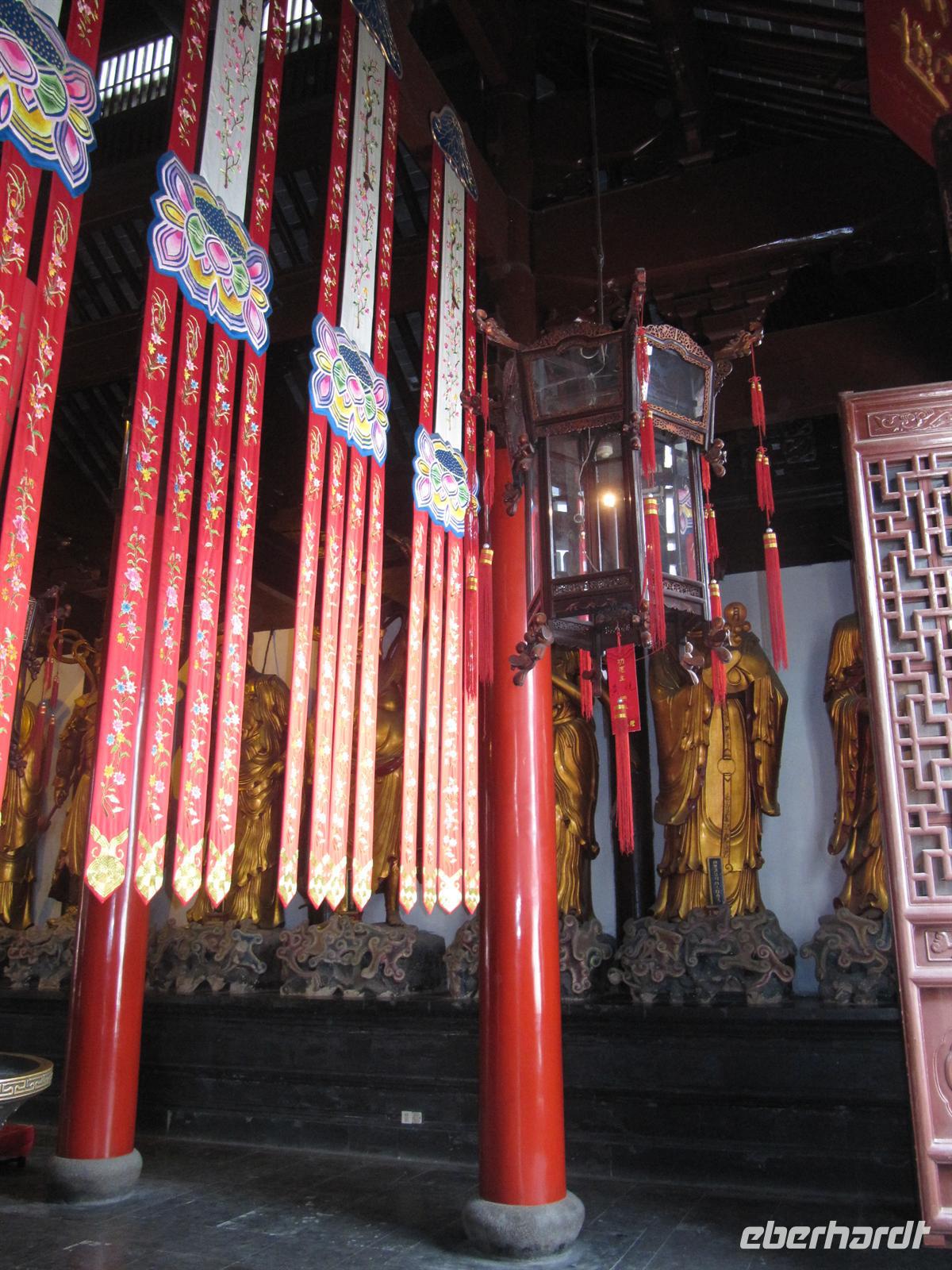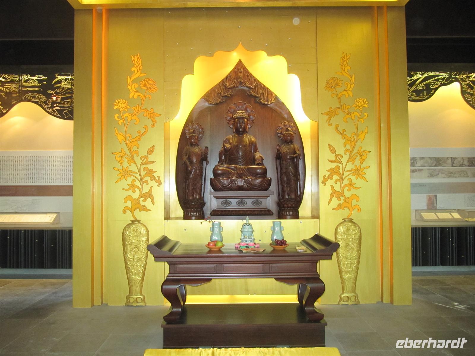 Unser Bus bringt uns danach zum Tempel der Seelenzuflucht (Lingyin-Tempel), der im 4. Jahrhundert von einem indischen Mönch gegründet wurde und in dem neben zahlreichen in den Fels gemeißelten Buddhafiguren vier Hallen mit Statuen zu bewundern sind, unter anderem auch eine 20 Meter Hohe Ausgabe des Begründers des Buddhismus, Shakyamuni.