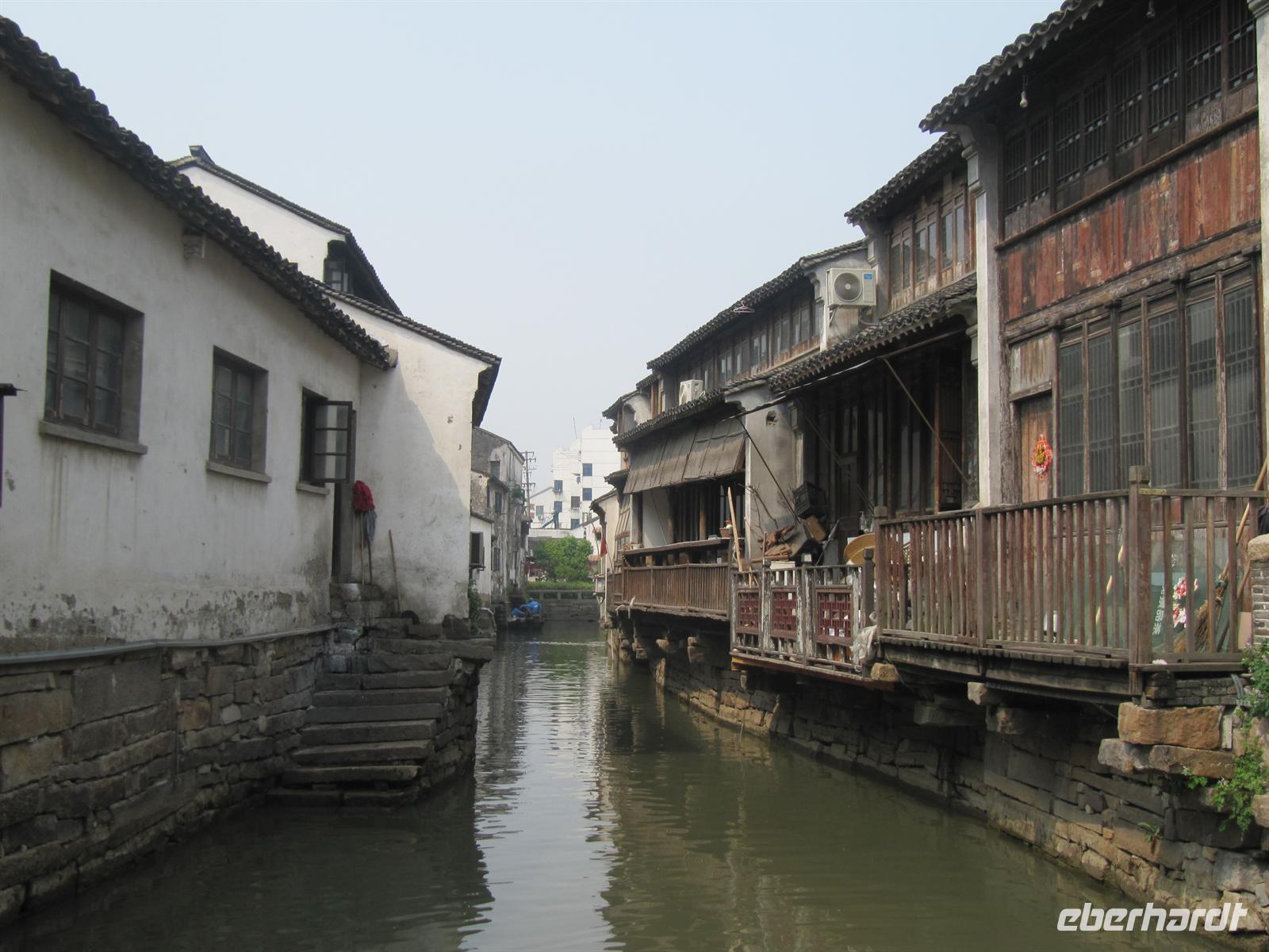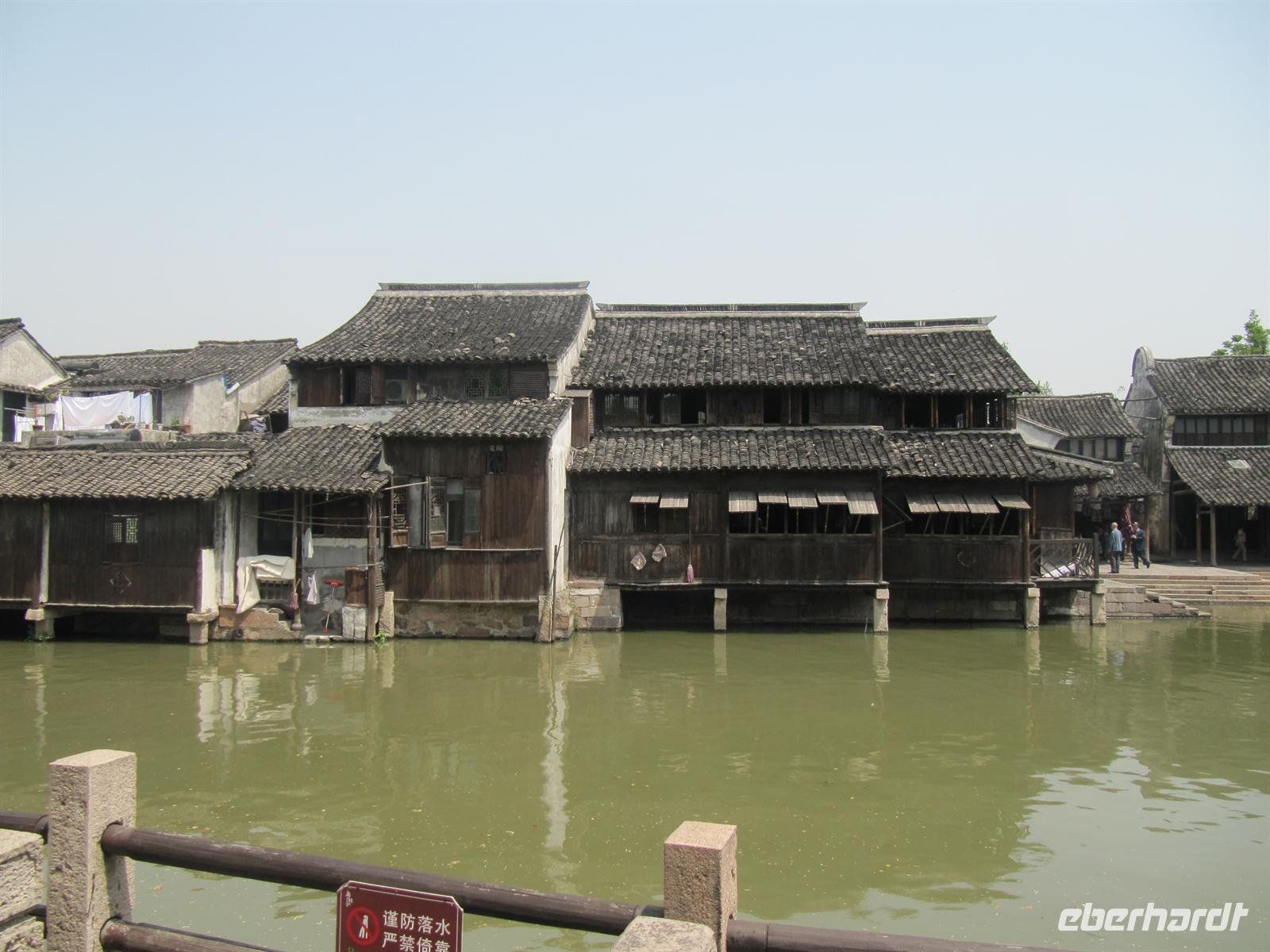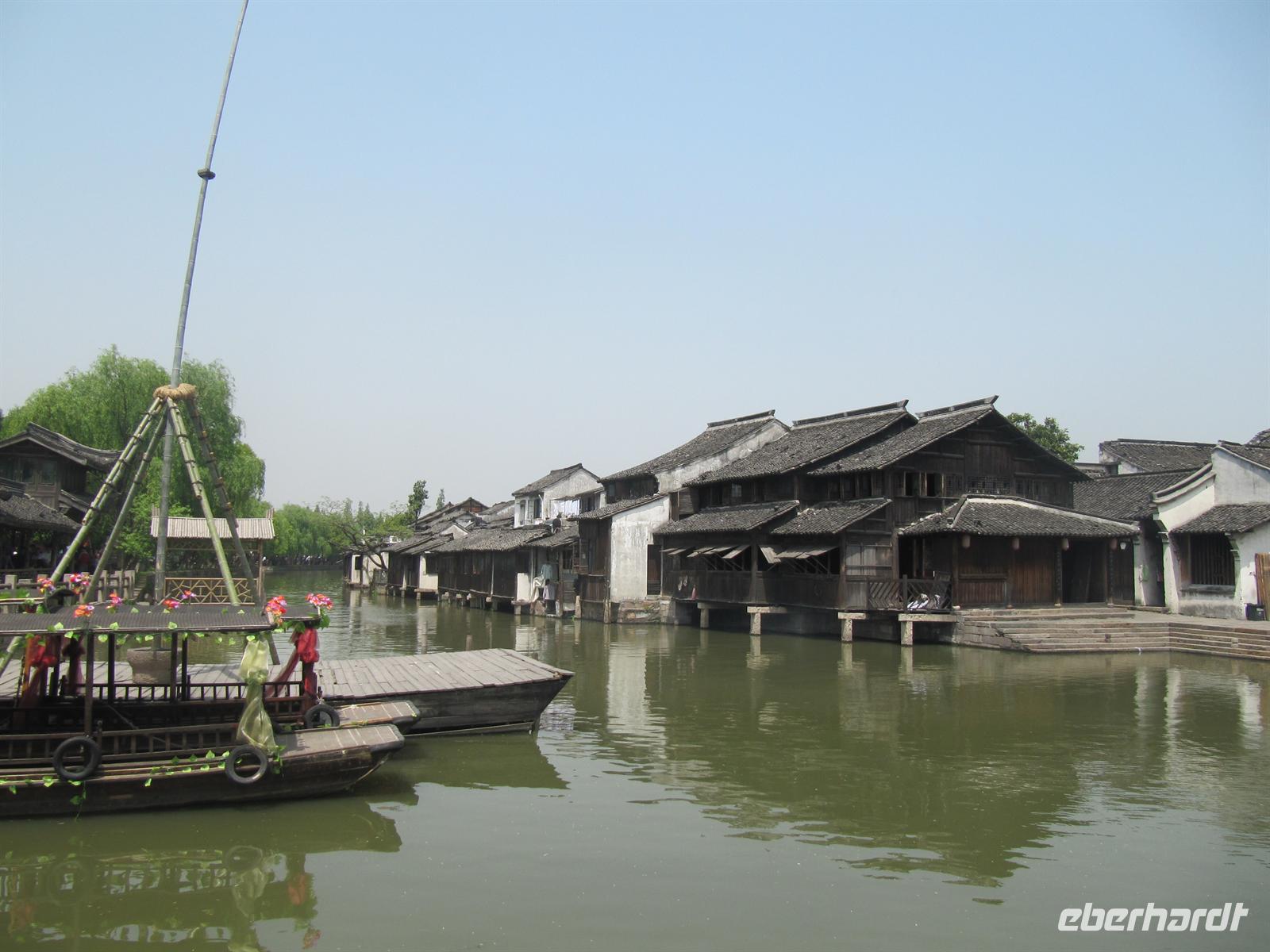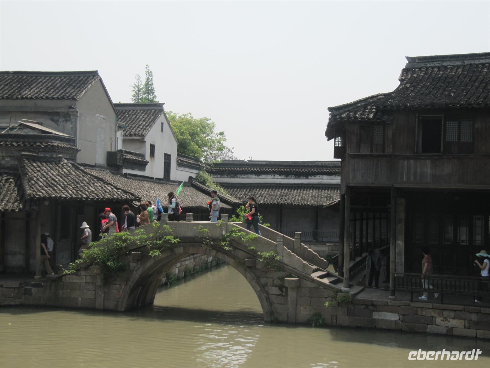 Die Aussicht auf 34 Grad warmes Wetter ließ uns schon am Morgen den Schweiß aus allen Poren treten. Aber das war ja immer noch besser als Regen und Kälte. So checkten wir ein weiteres Mal aus einem Hotel aus und verließen die mittlerweile vierte Station unserer China-Rundreise. Von Hangzhou ging es heute nach Suzhou, nicht ohne auf halbem Weg einen Zwischenstopp am Wasser(museums)dorf Wuzhen gemacht zu haben. Dieses Museumsdorf ist im Baustil des ausgehenden 19. Jahrhunderts gehalten und ist auf kleinen Inseln errichtet, die von Kanälen durchzogen werden. Das ganze verleiht dem Dorf einen venezianisch anmutenden Charakter, der durch die kleinen Brücken, die die Kanäle überspannen, noch verstärkt wird. Allerdings bestehen im Gegensatz zu Venedig die Häuser des Wasserdorfs in Wuzhen zu einem großen Teil aus Holz und sind natürlich auch vom Baustil nicht mit der ehemaligen Dogenstadt vergleichbar. Gut 600 Einwohner beherbergt das Museumsdorf noch, welche sich mehr schlecht als recht mit den