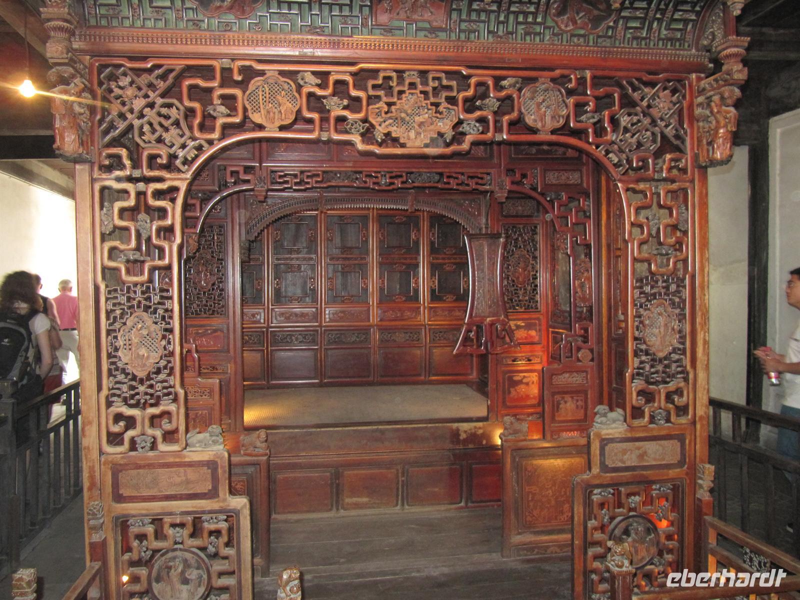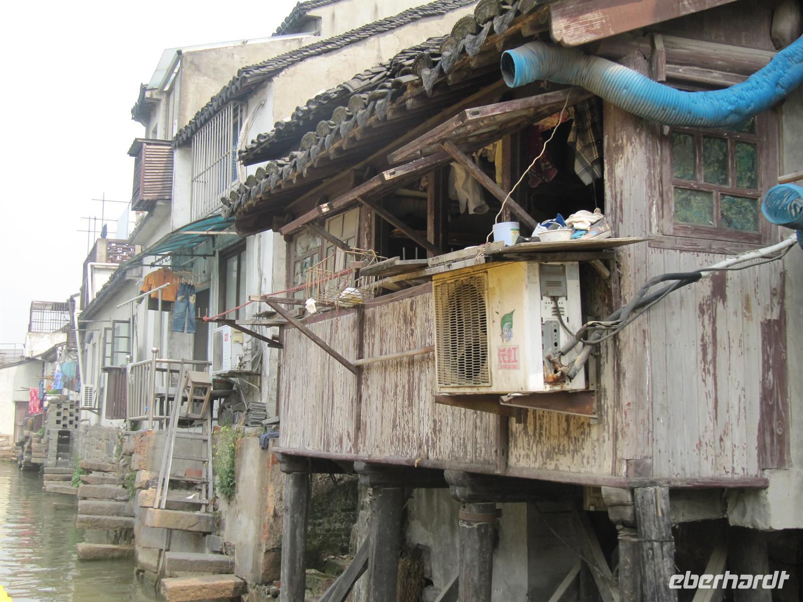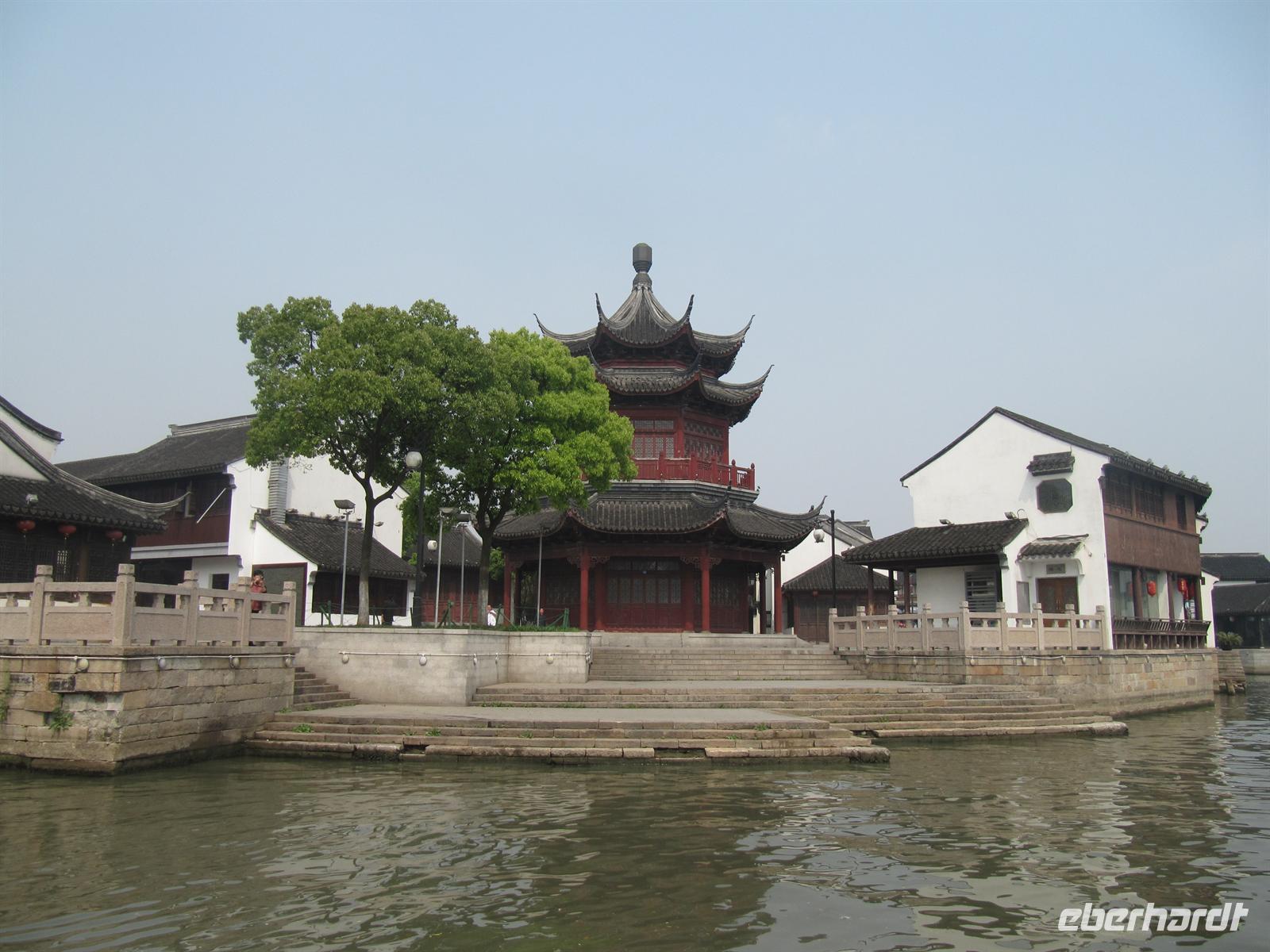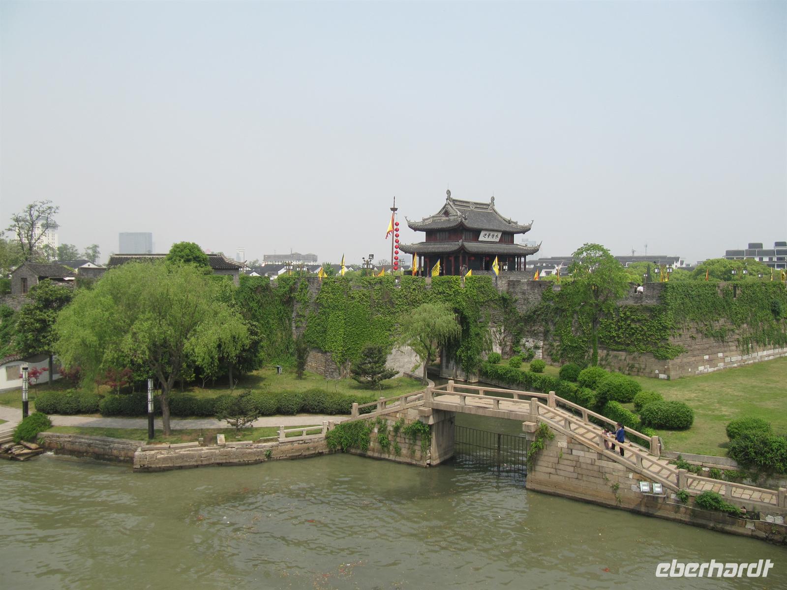 Die Aussicht auf 34 Grad warmes Wetter ließ uns schon am Morgen den Schweiß aus allen Poren treten. Aber das war ja immer noch besser als Regen und Kälte. So checkten wir ein weiteres Mal aus einem Hotel aus und verließen die mittlerweile vierte Station unserer China-Rundreise. Von Hangzhou ging es heute nach Suzhou, nicht ohne auf halbem Weg einen Zwischenstopp am Wasser(museums)dorf Wuzhen gemacht zu haben. Dieses Museumsdorf ist im Baustil des ausgehenden 19. Jahrhunderts gehalten und ist auf kleinen Inseln errichtet, die von Kanälen durchzogen werden. Das ganze verleiht dem Dorf einen venezianisch anmutenden Charakter, der durch die kleinen Brücken, die die Kanäle überspannen, noch verstärkt wird. Allerdings bestehen im Gegensatz zu Venedig die Häuser des Wasserdorfs in Wuzhen zu einem großen Teil aus Holz und sind natürlich auch vom Baustil nicht mit der ehemaligen Dogenstadt vergleichbar. Gut 600 Einwohner beherbergt das Museumsdorf noch, welche sich mehr schlecht als recht mit den