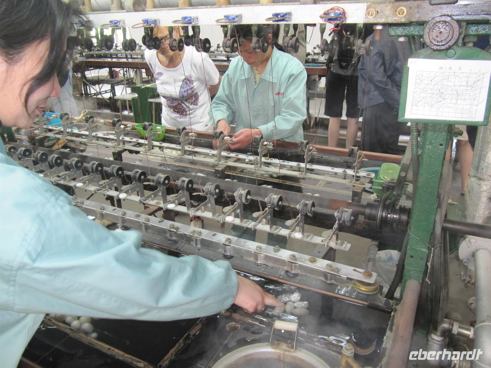 Am heutigen Tag rüsteten wir uns für die letzte Etappe unserer Chinarundreise und damit auch für einen letztmaligen Ortswechsel. Doch zunächst wollten wir mehr von der Stadt Suzhou sehen, so dass wir unsere Schritte nach dem Auschecken aus dem Hotel zum Kaiserkanal lenkten, um auf selbigen eine Bootsfahrt durch das Altstadtviertel zu machen. Der Kaiserkanal gehört mit einer Gesamtlänge von 1700 km zu den längsten Wasserwegen dieser Welt und ist durchschnittlich 2-4 Meter tief und bis zu 150 Metern breit. Mit einem kleinen Hausboot erkundeten wir die teilweise sehr schmalen und ursprünglich anmutenden Seitenkanäle im Altstadtviertel, wo nicht nur die Wäsche im Kanal gewaschen wird und das Leben jenseits der Glitzerfassaden abläuft, Armut inklusive. An der Marco-Polo-Brücke war unser kleiner Bootsausflug zu Ende und weiter ging es zu der Besichtigung einer Seidenmanufaktur. Hier erfuhren wir mehr über die Zucht der Seidenraupen sowie die Herstellung des Seidenfadens, schauten den Arbeiterinnen in der Spinnerei über die Schulter, besuchten das hauseigene Museum und konnten bei einer Modenschau fantastische Seidenkleider bewundern. Ein Teil unserer Gruppe unternahm im Anschluss daran eine
