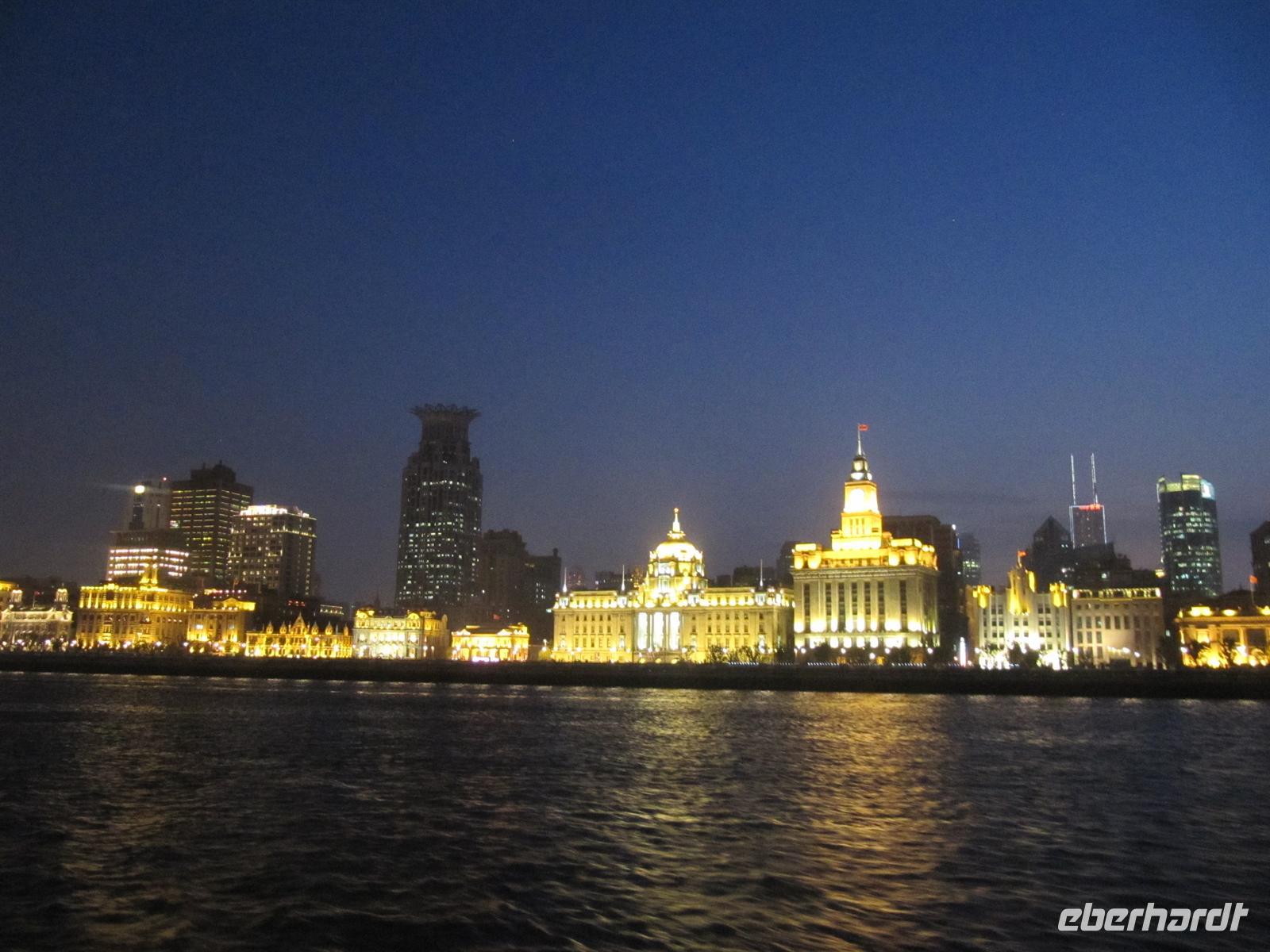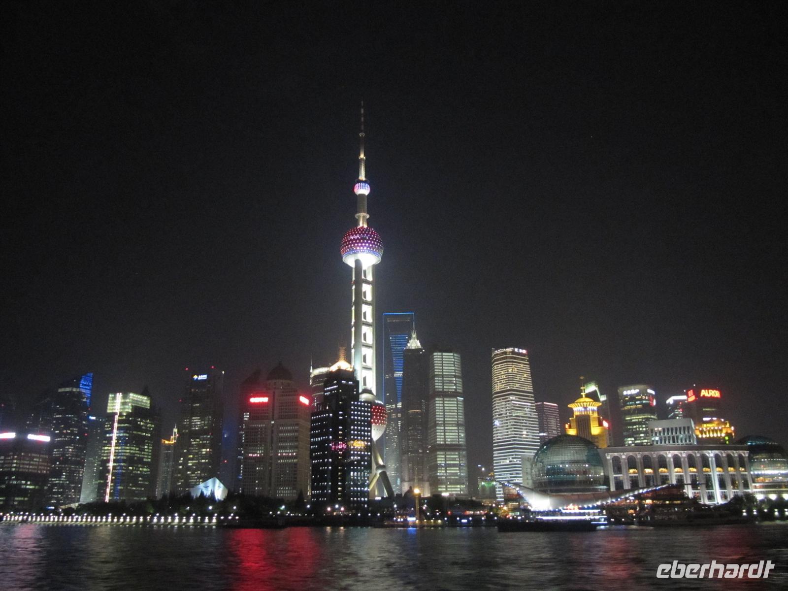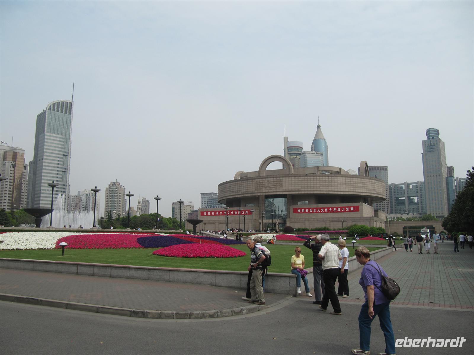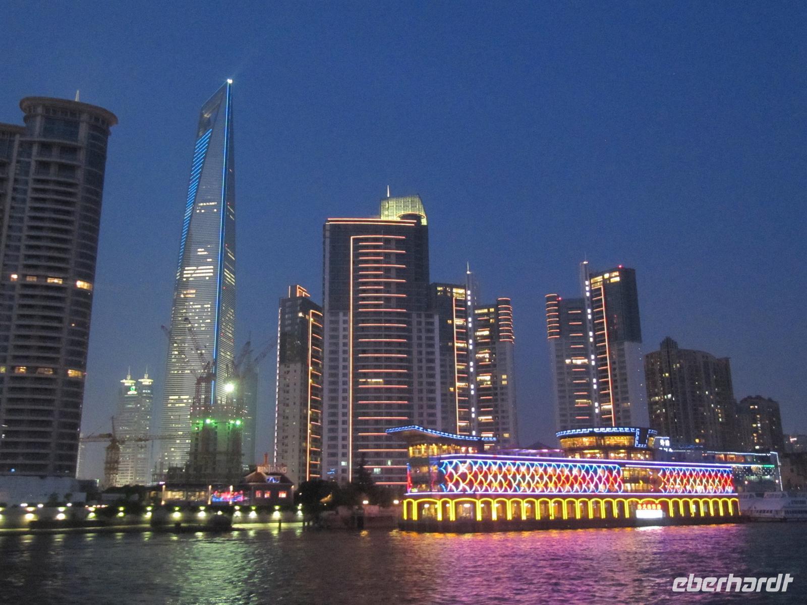 492 Meter hohe, 1999 fertig gestellte Jinmao-Tower, nach eigenem Bekunden das siebenthöchste Gebäude der Welt. Die beiden Fahrstühle trugen uns mit 9,1 Meter/Sekunde in 45 Sekunden in das 88. Stockwerk, von wo aus sich uns ein atemberaubender Blick über Shanghai und den Huangpu bot. Im Anschluss an den Ausflug in die Wolken kehrten wir zu ebenerdigen Besichtigungsobjekten zurück und durchfuhren das Gelände der EXPO 2010 mit den restlichen, noch nicht abgerissenen Pavillons, bevor wir dem Shanghaier Kinderpalast einen Besuch abstatteten und einer kleinen Gruppe beim Tanzunterricht zuschauen konnten. Das anschließende mongolische Barbecue, ein rustikales Grillbuffet in ebenso rustikaler Umgebung, diente der Erneuerung unserer Energievorräte, die für das heutige Abendprogramm benötigt wurden. Mit einem Ausflugsschiff ging es auf eine spektakuläre Flussfahrt entlang der abendlichen, schön beleuchteten Skyline von Pudong, flankiert von den nicht minder schön anzusehenden Kolonialbauten entlang des Bundes. Bevor uns unser Bus ins Hotel zurück brachte, rundeten ein Stopp an der Nanjing-Road, dem Shanghaier Einkaufsparadies und im französischen Viertel, mit seinen gemütlichen Bars, Boutiquen und Kneipen einen abwechslungsreichen Tag ab.