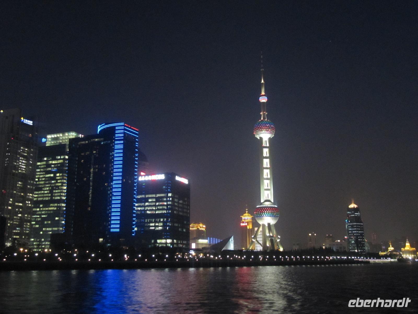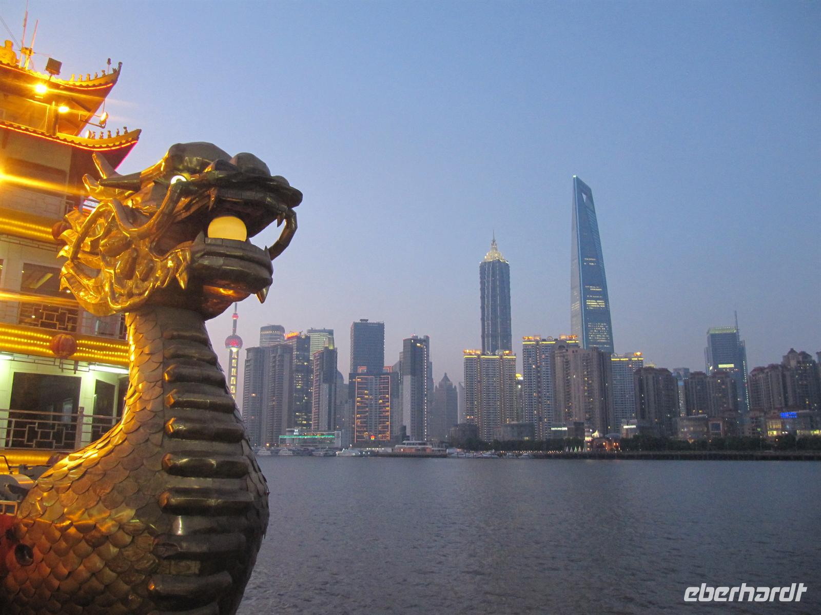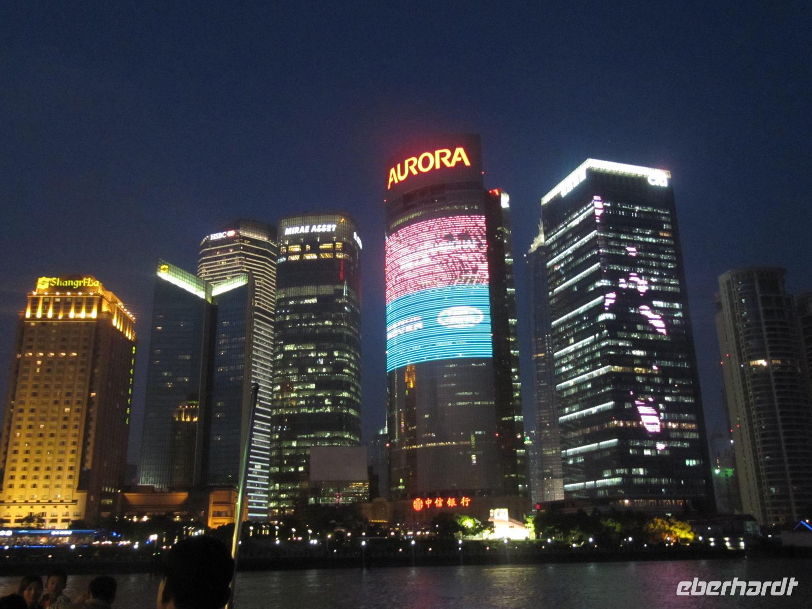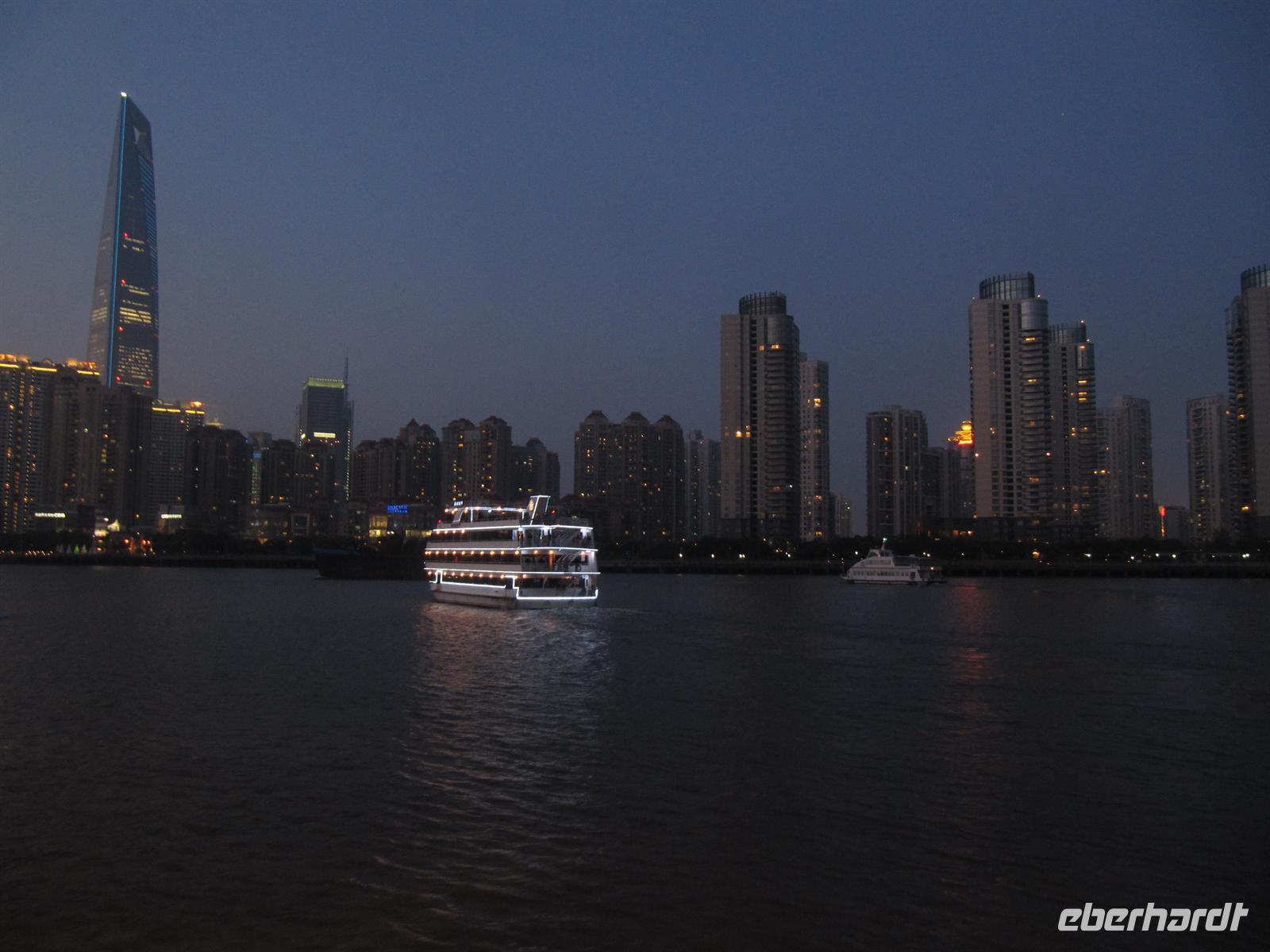 492 Meter hohe, 1999 fertig gestellte Jinmao-Tower, nach eigenem Bekunden das siebenthöchste Gebäude der Welt. Die beiden Fahrstühle trugen uns mit 9,1 Meter/Sekunde in 45 Sekunden in das 88. Stockwerk, von wo aus sich uns ein atemberaubender Blick über Shanghai und den Huangpu bot. Im Anschluss an den Ausflug in die Wolken kehrten wir zu ebenerdigen Besichtigungsobjekten zurück und durchfuhren das Gelände der EXPO 2010 mit den restlichen, noch nicht abgerissenen Pavillons, bevor wir dem Shanghaier Kinderpalast einen Besuch abstatteten und einer kleinen Gruppe beim Tanzunterricht zuschauen konnten. Das anschließende mongolische Barbecue, ein rustikales Grillbuffet in ebenso rustikaler Umgebung, diente der Erneuerung unserer Energievorräte, die für das heutige Abendprogramm benötigt wurden. Mit einem Ausflugsschiff ging es auf eine spektakuläre Flussfahrt entlang der abendlichen, schön beleuchteten Skyline von Pudong, flankiert von den nicht minder schön anzusehenden Kolonialbauten entlang des Bundes. Bevor uns unser Bus ins Hotel zurück brachte, rundeten ein Stopp an der Nanjing-Road, dem Shanghaier Einkaufsparadies und im französischen Viertel, mit seinen gemütlichen Bars, Boutiquen und Kneipen einen abwechslungsreichen Tag ab.