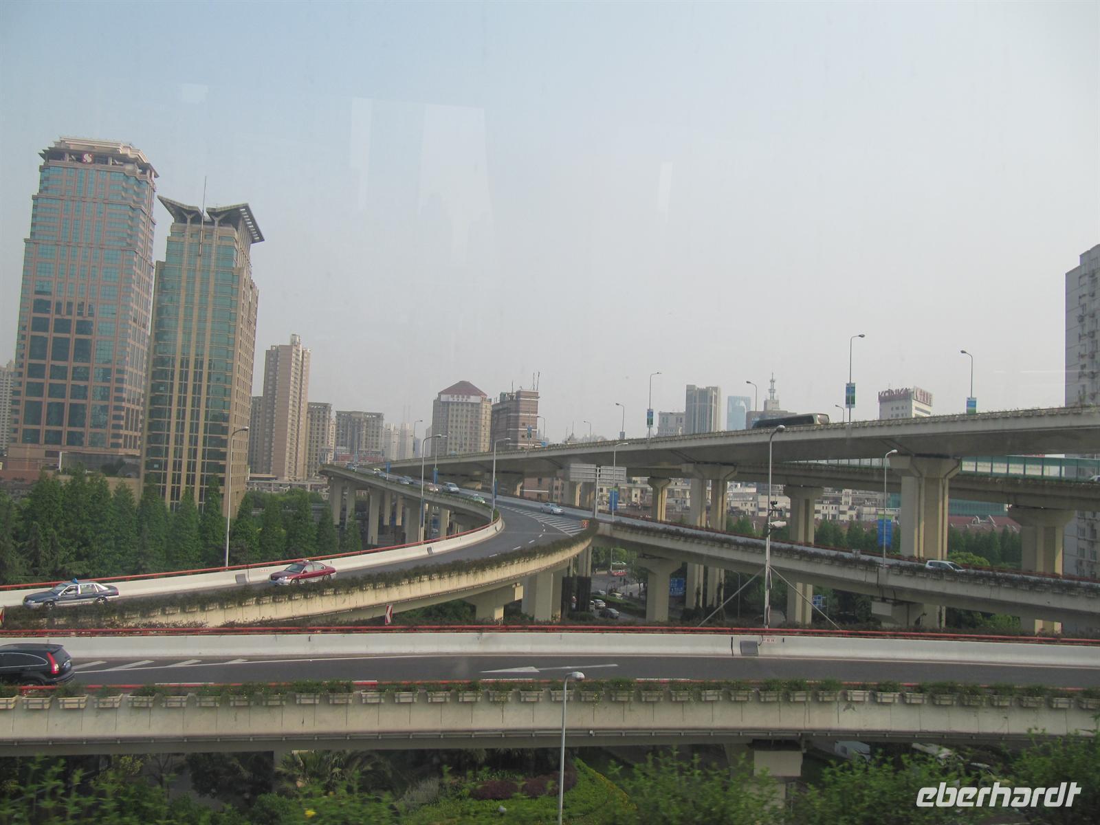 abenteuerliche Rikschafahrt durch die Altstadtgassen von Suzhou. Mit unheimlicher Gelassenheit wurden die nur durch pure Muskelkraft fortbewegten Fahrraddinosaurier von ihren jeweiligen Besitzern durch die chaotischen Verkehrsverhältnisse gesteuert. Erschwerend kam hinzu, dass jeweils zwei in Größe und Gewicht europäischen Normen entsprechende Fahrgäste von einem feingliedrigeren chinesischen Rikschafahrer zu bewegen waren. Auf unserer Rikschatour machten wir kurz Station an einem Fleisch,- Fisch- und Gemüsemarkt und besichtigten ein Museum der chinesischen Oper. Leider änderten sich zu diesem Zeitpunkt die Wetterverhältnisse von sonnig-warm in nass-kalt, was das Rikschafahren zu einem abenteuerlichen, sehr feuchten Erlebnis werden lies. Wir verließen Suzhou bei wieder aufkommender Sonne und begaben uns auf den Weg ins 90 Kilometer entfernte Shanghai, welches wir am Nachmittag erreichten. Das heißt, die Ausläufer dieser Megacity reichen eigentlich fast schon an Suzhou heran, so dass man fast nahtlos von der kleinen 6-Millionen-Metropole in den gigantischen 22-Millionen-Molloch hinüberwechselt. Wohin das Auge auch schaut, überall trifft es auf Hochhäuser, Hochhäuser, Hochhäuser. Nach dem Zimmerbezug in unserem Hotel ging es noch zum Abendessen und zur Begrüßung unserer örtlichen Reiseleiters Herrn Yang, der drei Jahre in Dortmund studiert hat und ein sehr gutes deutsch spricht. Um Kraft zu tanken für die morgendliche Großstadtdschungeltour stand danach nur noch relaxen auf dem Programm.