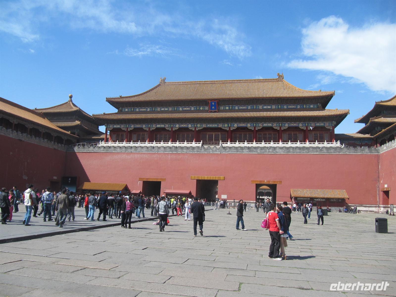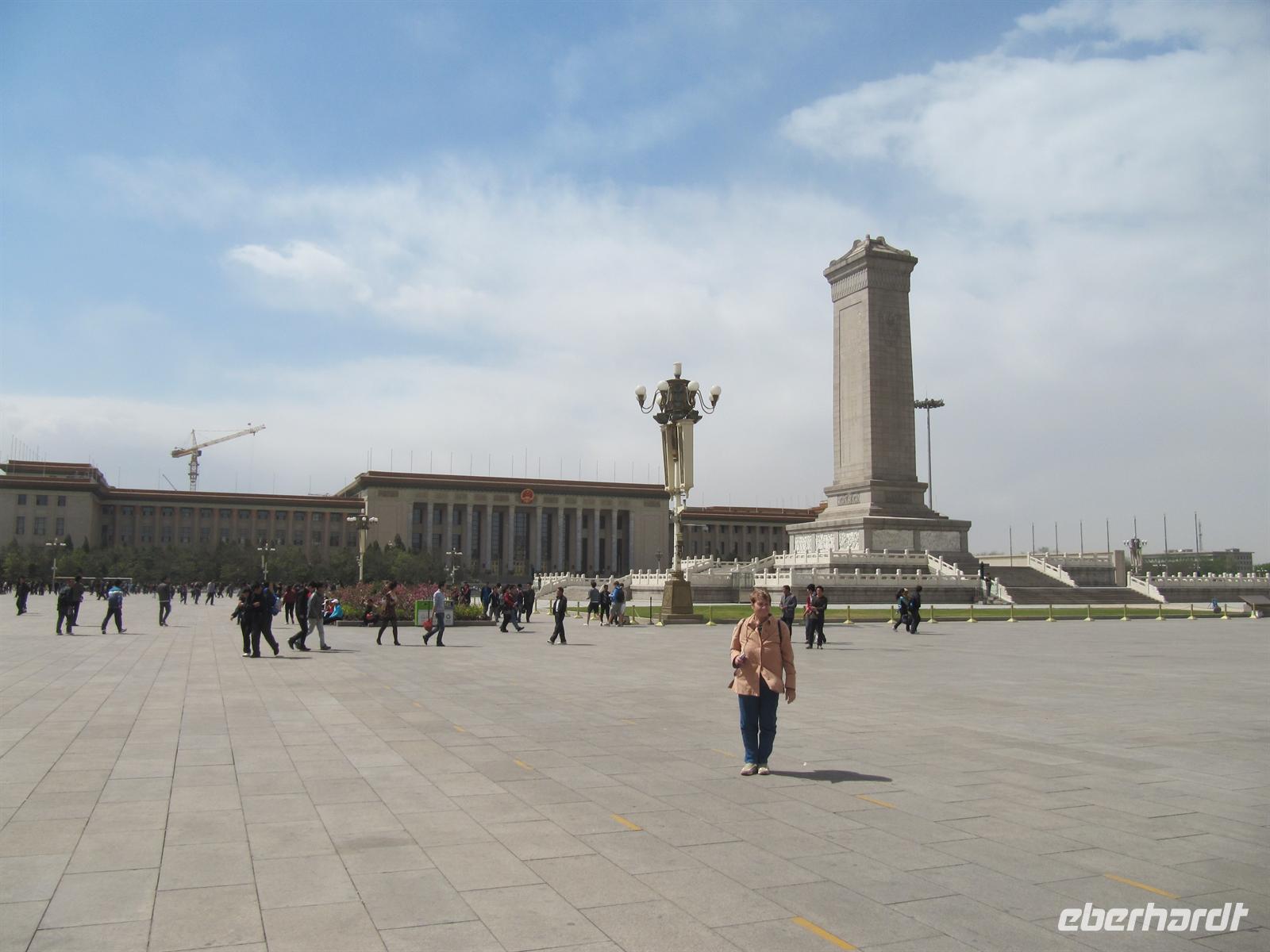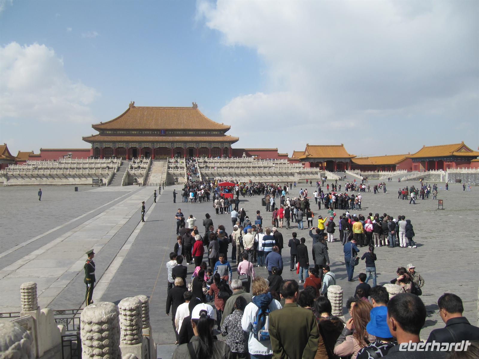 Nach dem Check-In, einer kurzen Pause im Hotel und damit knapp 736 Jahre nach Marco Polo begann unsere persönliche Entdeckung der Glanzlichter Chinas mit dem Besuch des Platzes des himmlischen Friedens und des Kaiserpalastes mit der verbotenen Stadt. Mit etlichen tausend weiteren Besuchern bummelten wir über den fünfzig Hektar großen Tian’anmen-Platz, welcher flankiert wird durch das Mao-Mausoleum, das Museum für Geschichte und Revolution, der Großen Halle des Volkes und das Tor des himmlischen Friedens. Unsere anfängliche Überzeugung, das Chinesen ein überaus rücksichtsvolles Völkchen sind, schwand im selben Maße wie wir uns zum und im Kaiserpalast bewegten. An einigen neuralgischen Punkten herrschte ein Gedrängel und Geschubse wie zu besten Winterschlussverkaufzeiten, welches noch umrahmt wurde durch das mannigfaltige Stimmengewirr und die mikrofonverstärkten Erläuterungen der einheimischen Guides.