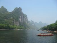 Nachdem es am Vortag in Guilin noch heftig geregnet hatte, war mit unserem Eintreffen der Sonnenschein zurückgekehrt. Bei wunderschönem Wetter ging es am Morgen mit dem Bus zur Anlegestelle der Li-Flussschiffe in Zhujiang. Hier bestiegen wir eines der in großer Anzahl vor Anker liegenden Salonschiffe, um uns bei einer 4,5 stündigen Flussfahrt den Li entlang an der fantastischen Landschaft der kegelförmigen Karstberge satt zu sehen. Viele Geschichten und Mythen ranken sich um die bizarren Gesteinsformationen, die die Phantasie beflügeln und zu entsprechenden Namen geführt haben. Sie ist im Bewusstsein der Chinesen so stark verankert,