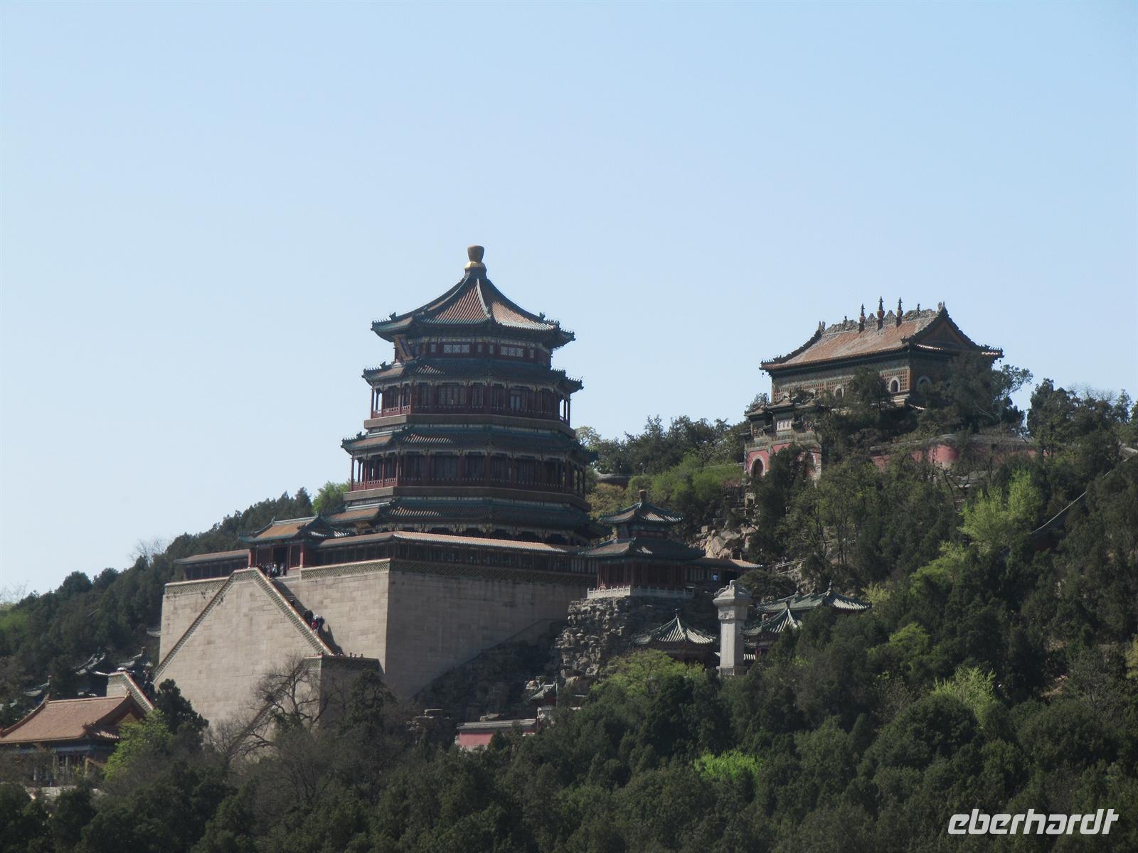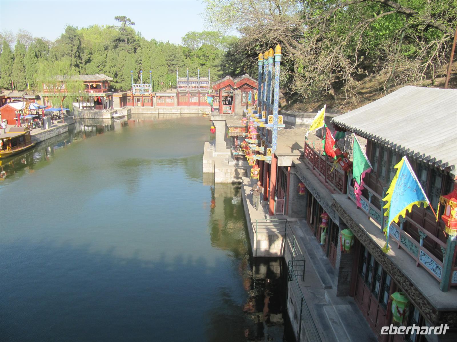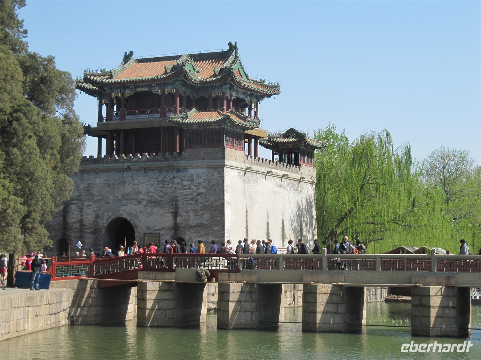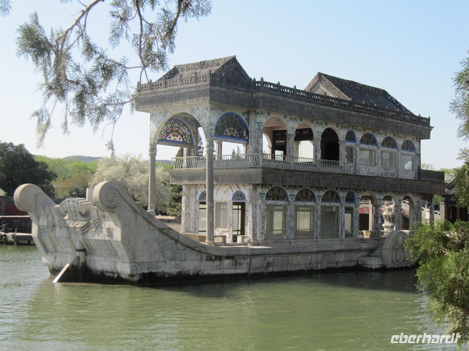 Anschließend führte uns unsere Fahrt in den westlich gelegenen Teil der Stadt, wo sich die Qing-Kaiser der drückenden Schwüle der Pekinger Sommer zu entziehen versuchten, indem sie sich einen Sommerpalast um einen künstlich aufgestauten See bauen ließen. Vom Garten der Harmonie und der Tugend schritten wir wie einst die Kaiser und ihre Familien den über 700 Meter langen Wandelgang entlang des Kunming-Sees zum berühmten weißen Marmorboot, welches heute allerdings fast ein Schattendasein neben den farbenprächtigen, in der Nähe vor Anker liegenden Ausflugsbooten fristet.