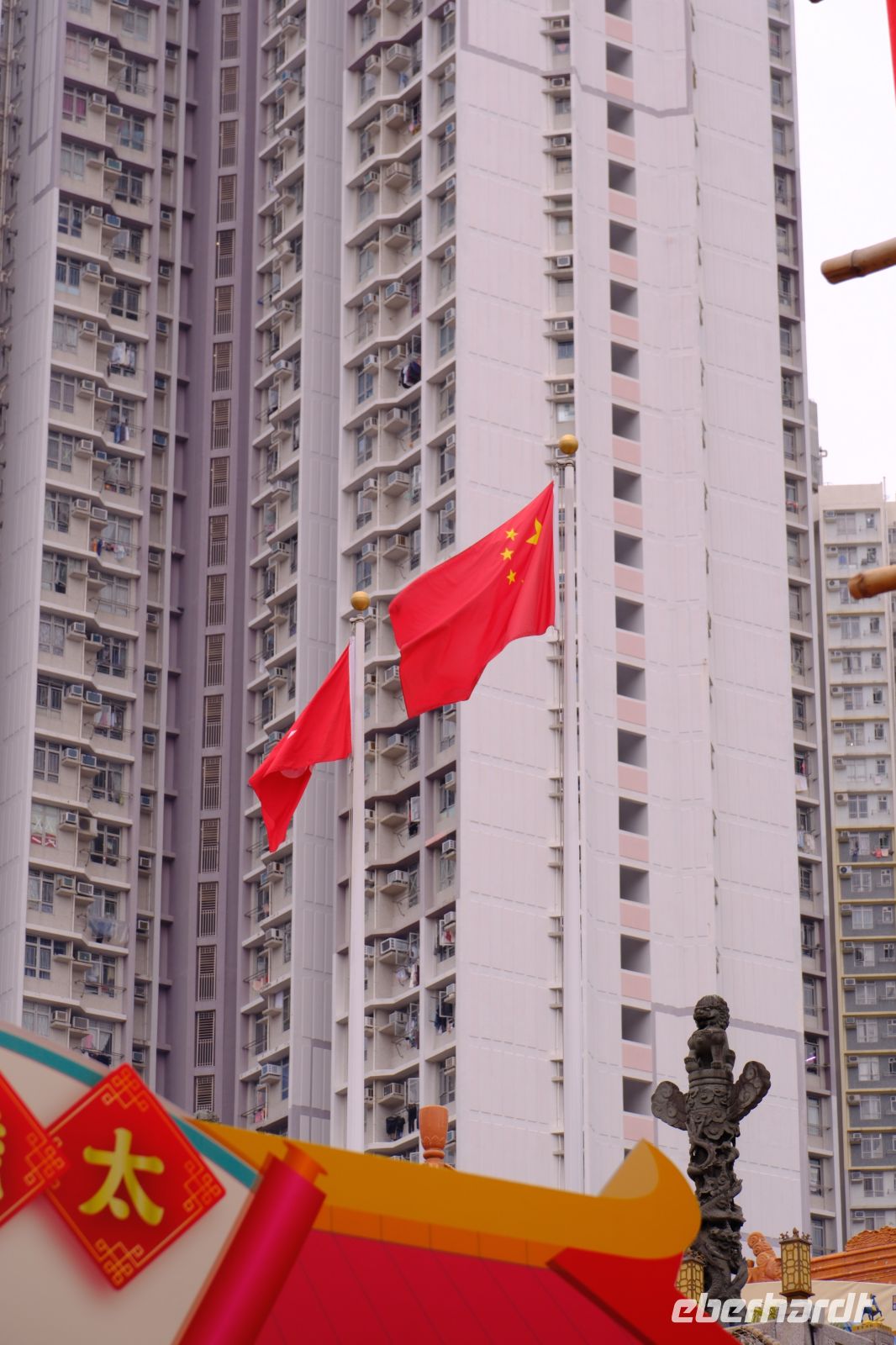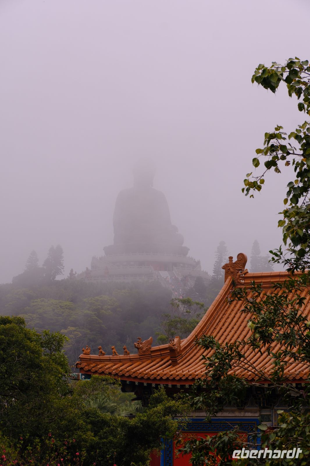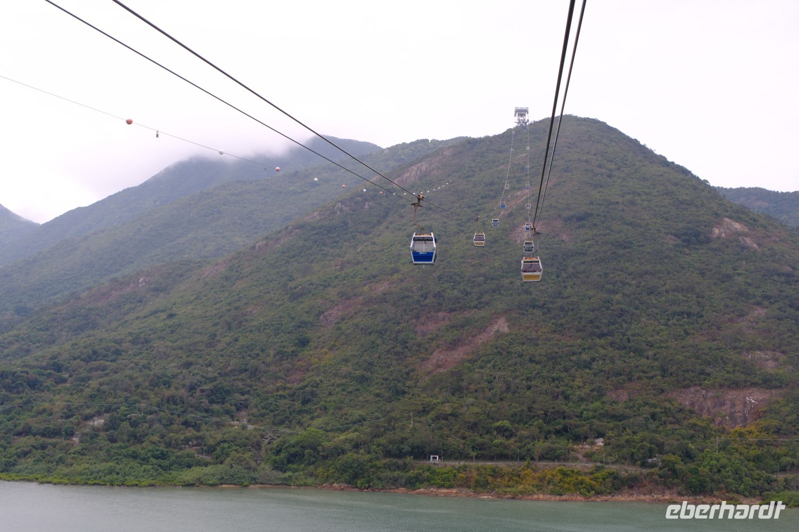Nach dem Frühstück ging es los – raus aus der Innenstadt auf die grüne Insel Lantau. Mit dem Bus fuhren wir über die langen Brücken bis zur Seilbahnstation von Lantau Island. Mit der Seilbahn ging es nun ca. 15 Minuten hoch hinauf auf ca. 600 m zum Big Buddha und dem Po-Lin-Klosterkomplex. Wir spazierten langsam zum Klostervorplatz entlang der vielen Läden. Wir besuchten zuerst das schöne Po-Lin-Kloster: etwas im Nebel eingehüllt und dadurch mit mystischer Atmosphäre in den Bergen gelegen. Gemeinsam liefen wir durch den Komplex und Michael brachte uns den Buddhismus näher. Für uns außergewöhnlich waren wieder die vielen Räucherstäbchen – je länger das Stäbchen, desto mehr Sünden werden „verbrannt" bzw. desto mehr möchte jemand wiedergutmachen. Von 20 cm bis 1 m Länge war alles dabei – jeder hat halt sein Päckchen zu tragen …