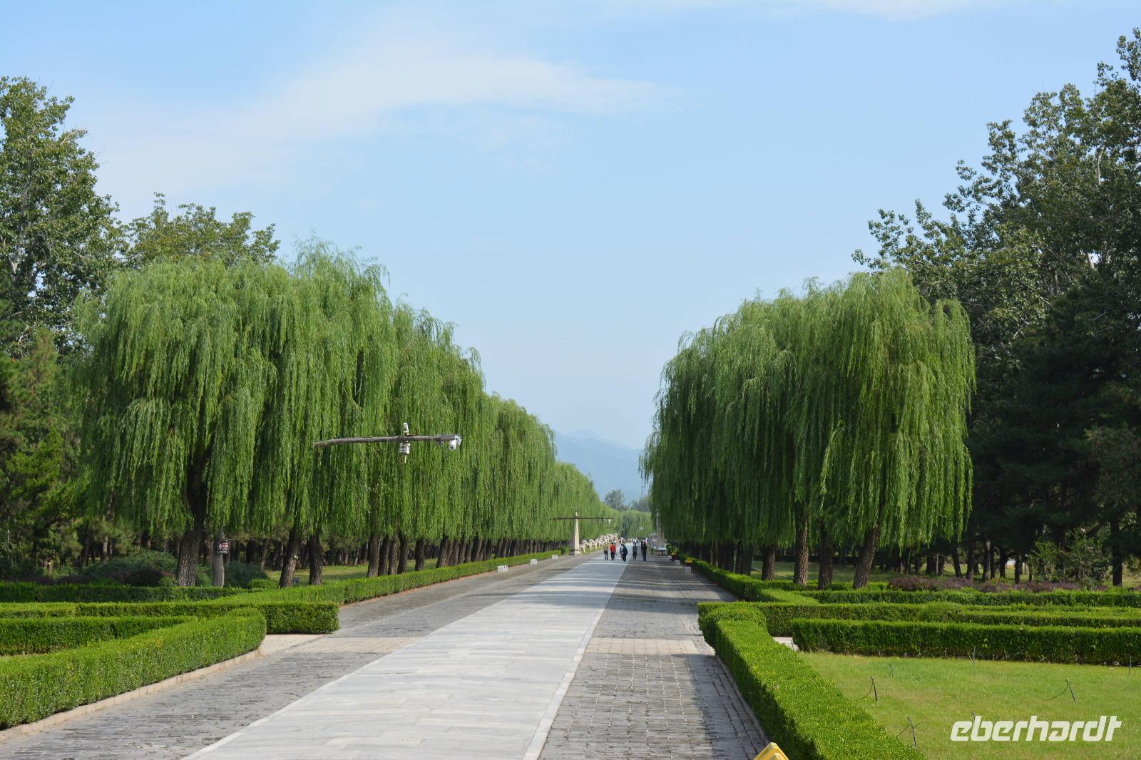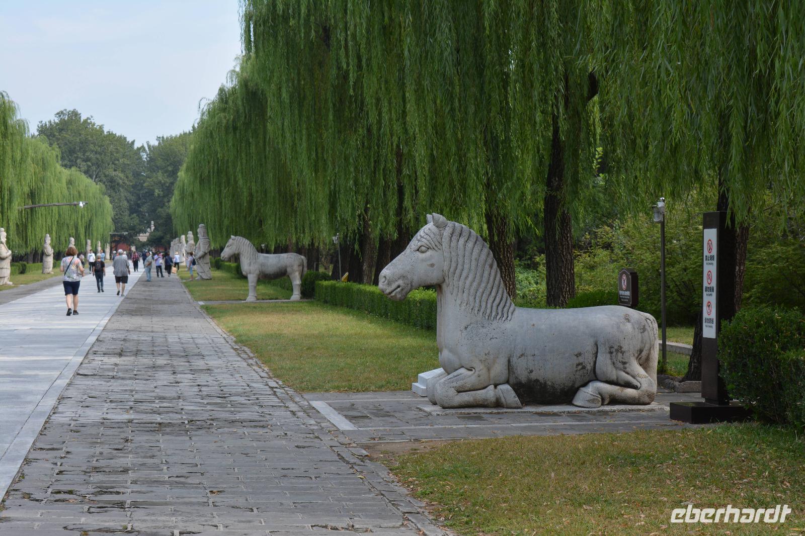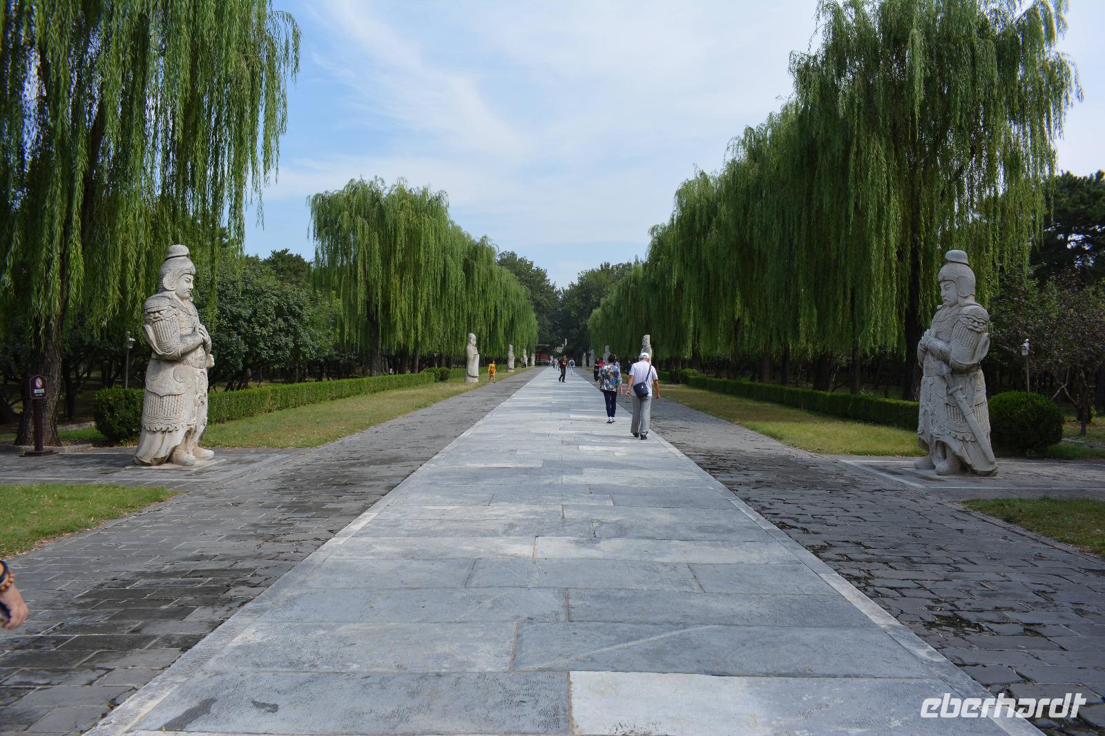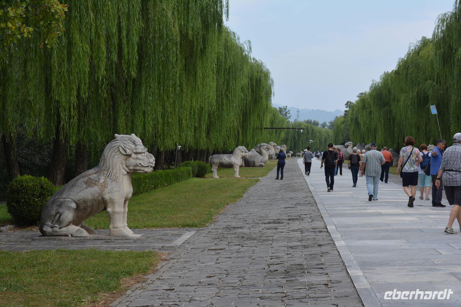 An der Geisterallee angekommen, hat man das Gefühl weit von der Innenstadt entfernt zu sein. Trauerweiden am Wegesrand und nur wenig Verkehr auf den anliegenden Straßen schaffen eine ruhige und harmonische Atmosphäre. Die Allee säumen außerdem Statuen von Kamelen, Löwen und Elefanten und Fabeltieren, wie chinesischen Einhörnern und dem Qilin.