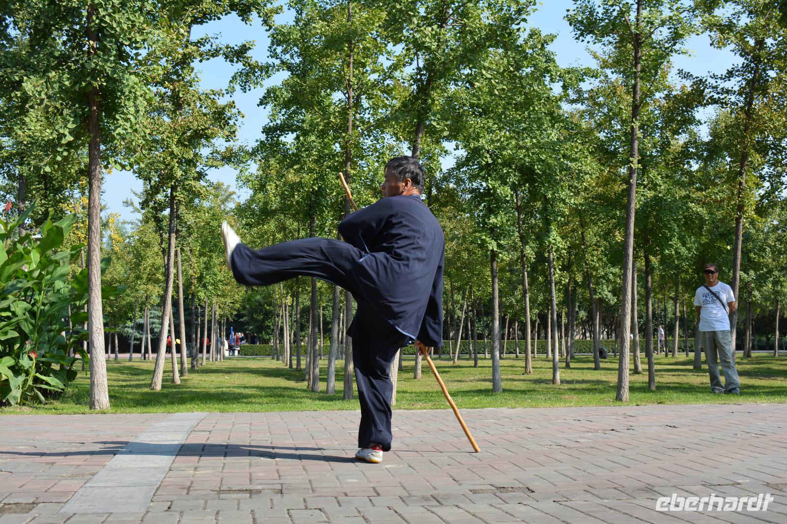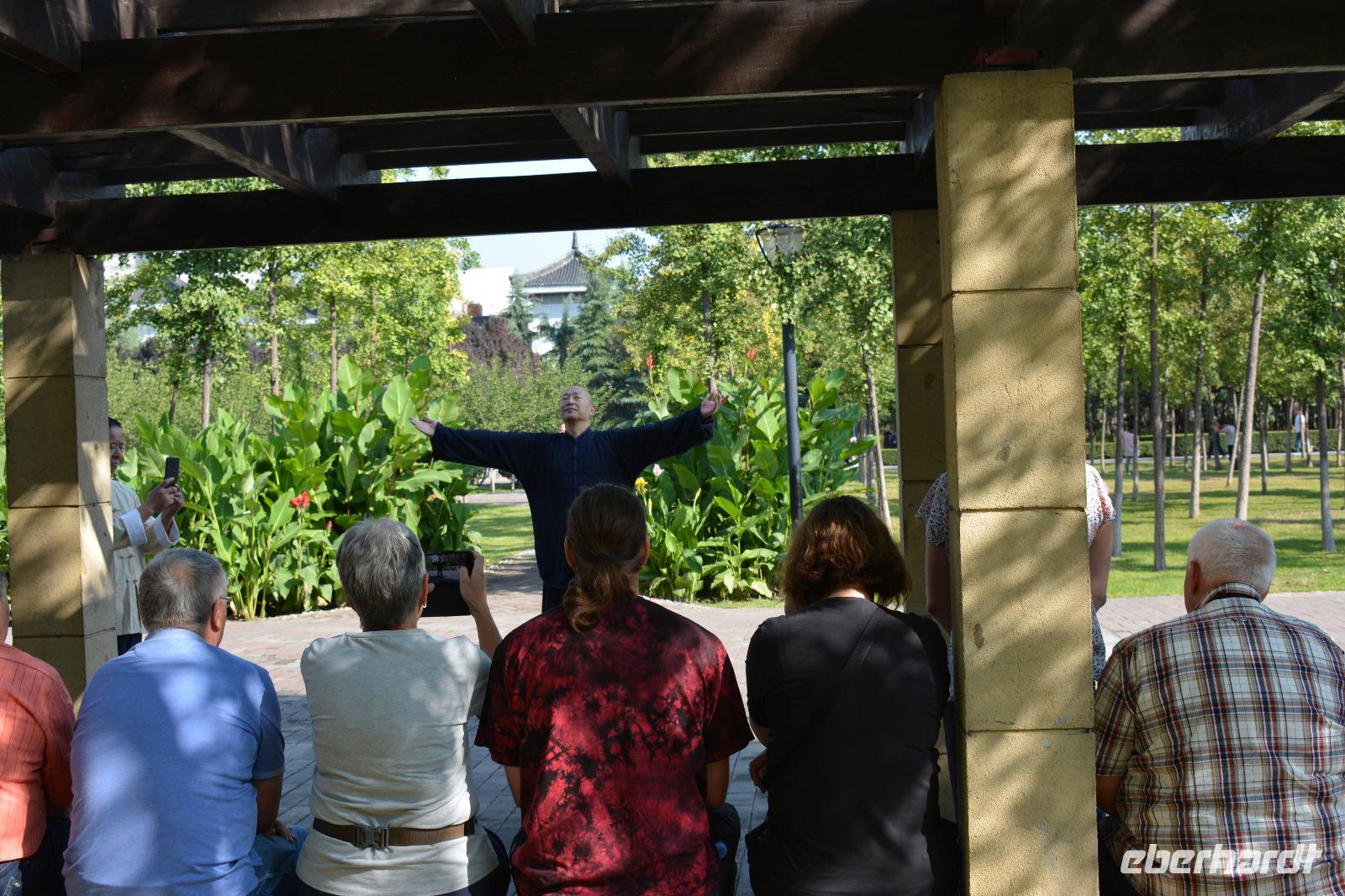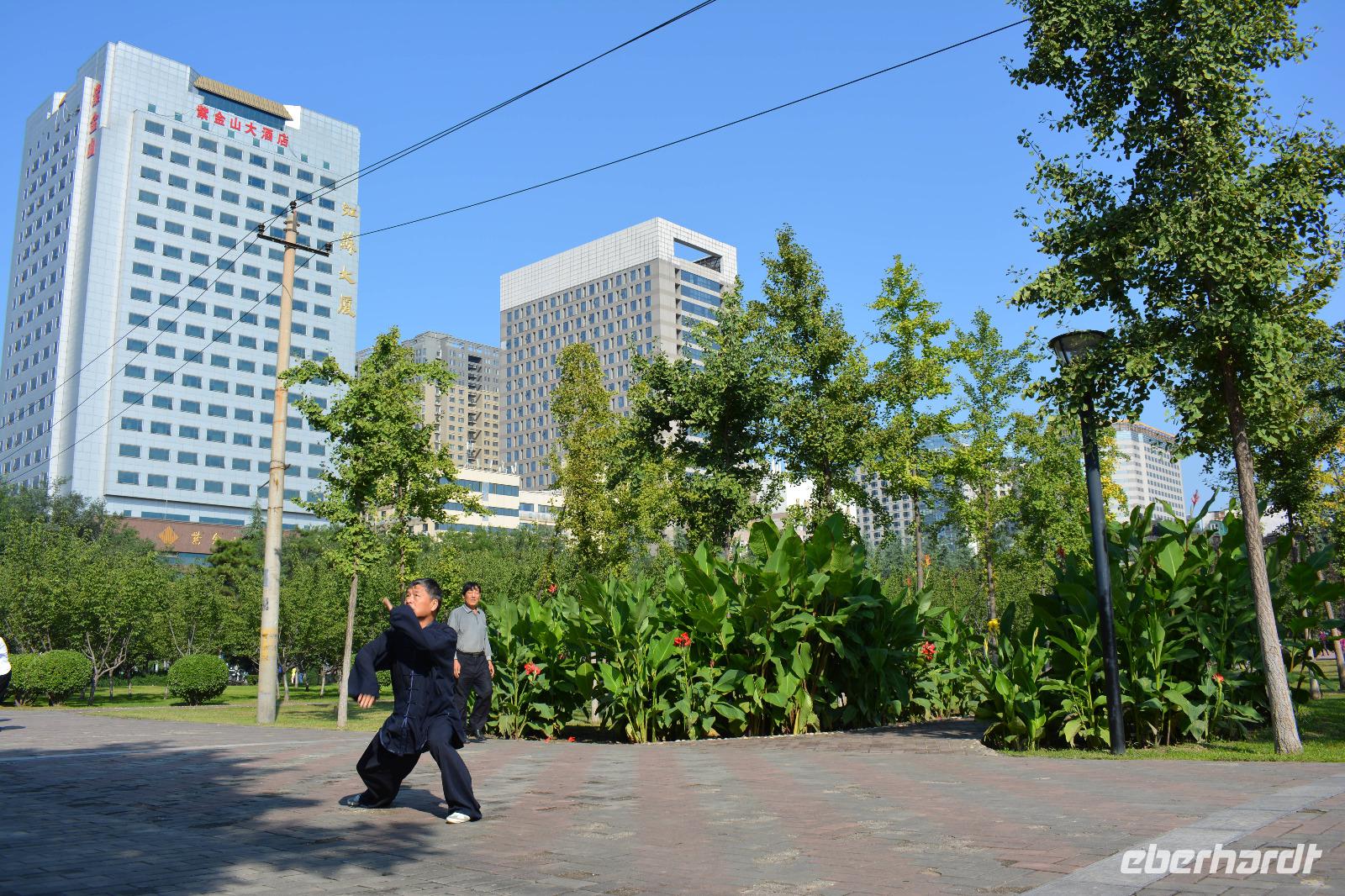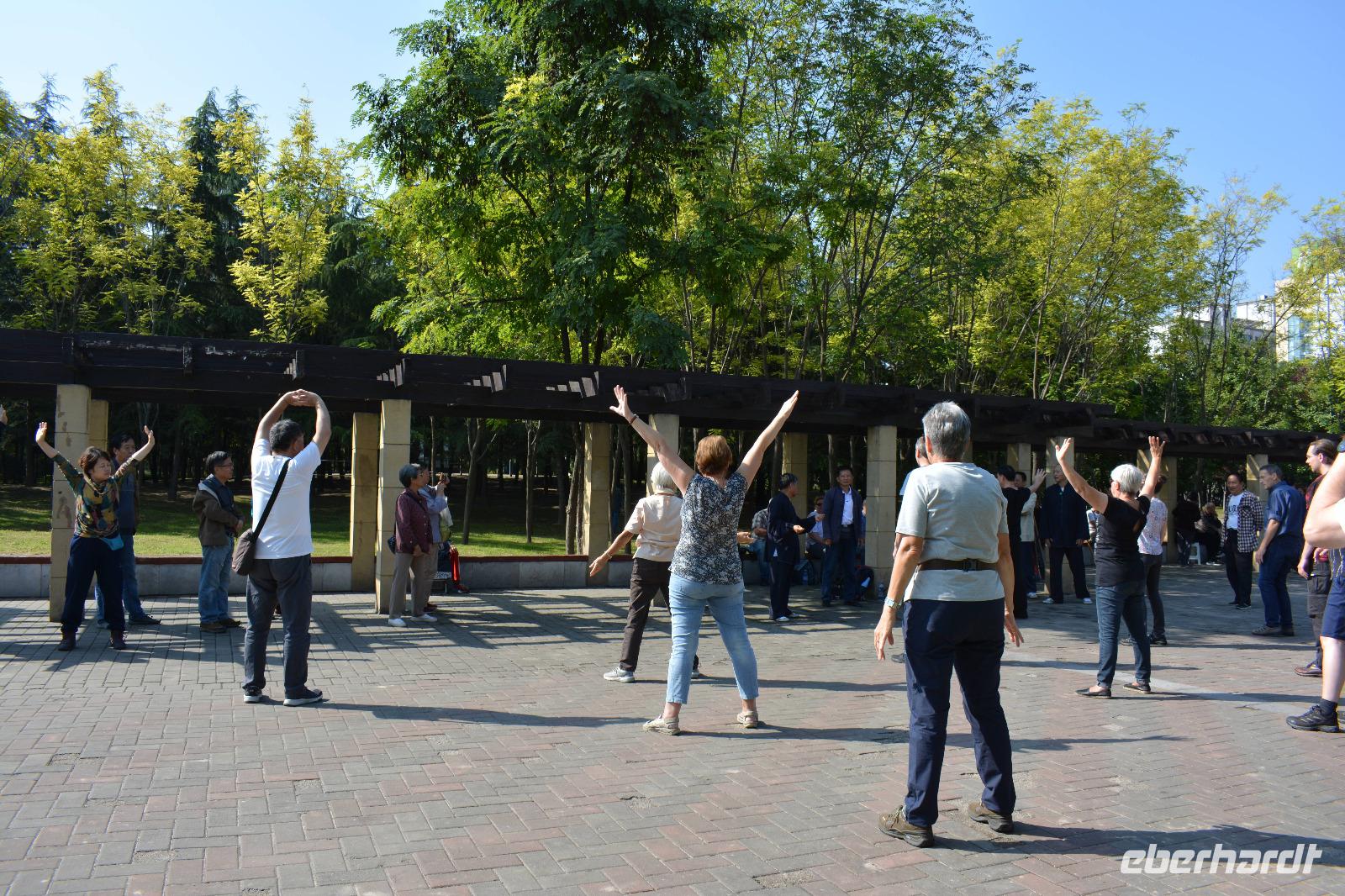 Ein langer Tag steht bevor, den wir jedoch sehr ruhig angehen. Als erstes besuchen wir heute einen kleinen Park. Hier steht Frühsport auf dem Programm. Einige Taiji Meister zeigen uns ihren Sport, welchen sie fast täglich im Park vollziehen. Sie zeigen uns Angriff und Verteidigung, wie uns Herr Wang erklärt und man braucht bis zu vier Monate um alle Bewegungen in einer Art Choreographie zu „tanzen". Nun sind auch wir dran: Vier Bewegungen werden uns gezeigt und sind auch gar nicht so leicht nachzumachen. Danach können wir auch unsere Kampfkünste mit Schwertern, Messern und Stöcken unter Beweis stellen, jedoch, nur für ein Bild!