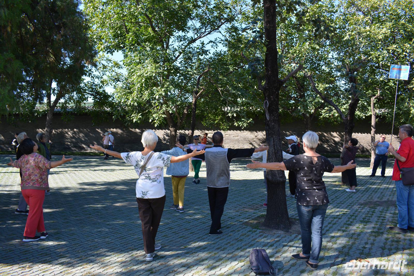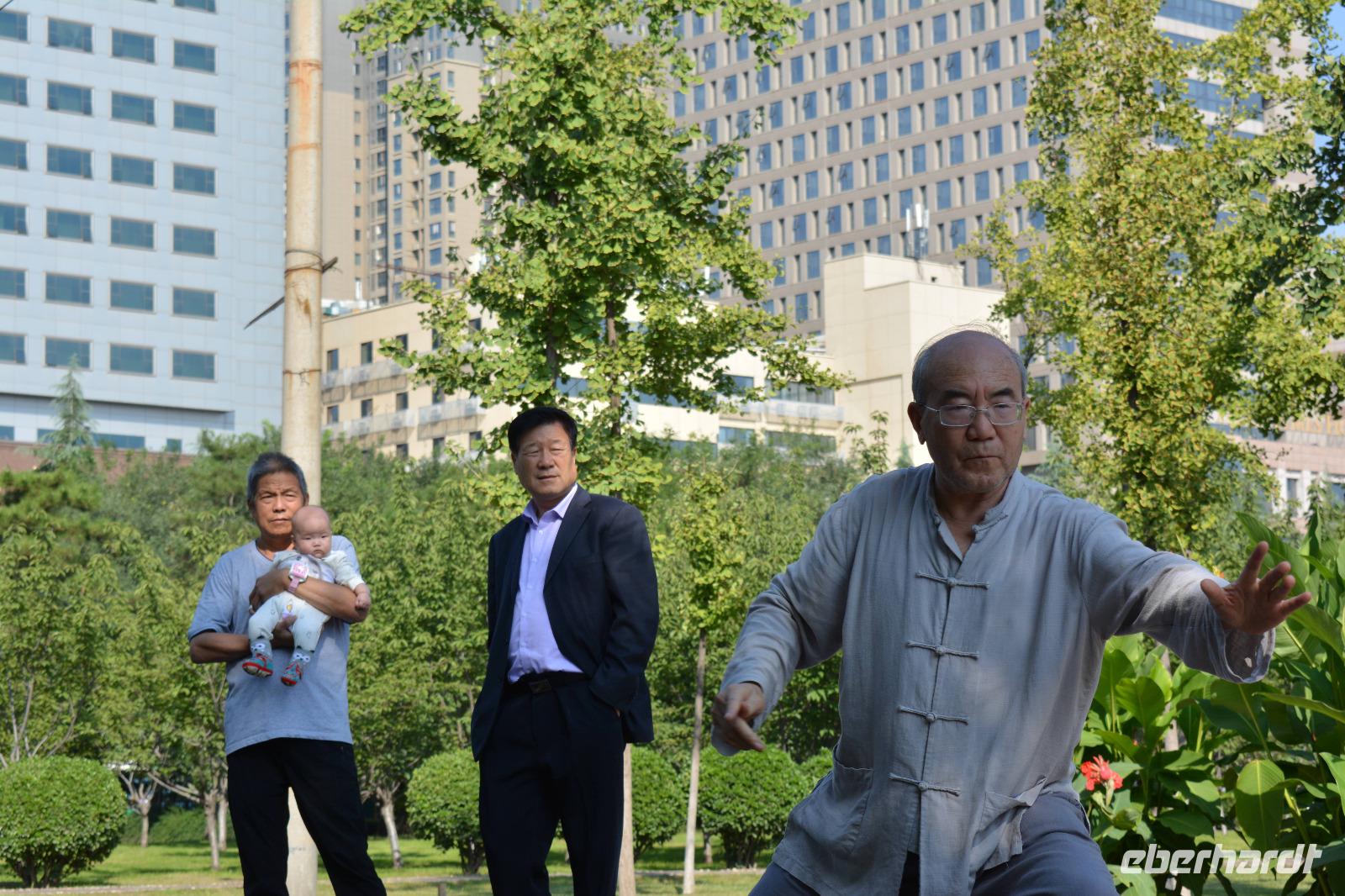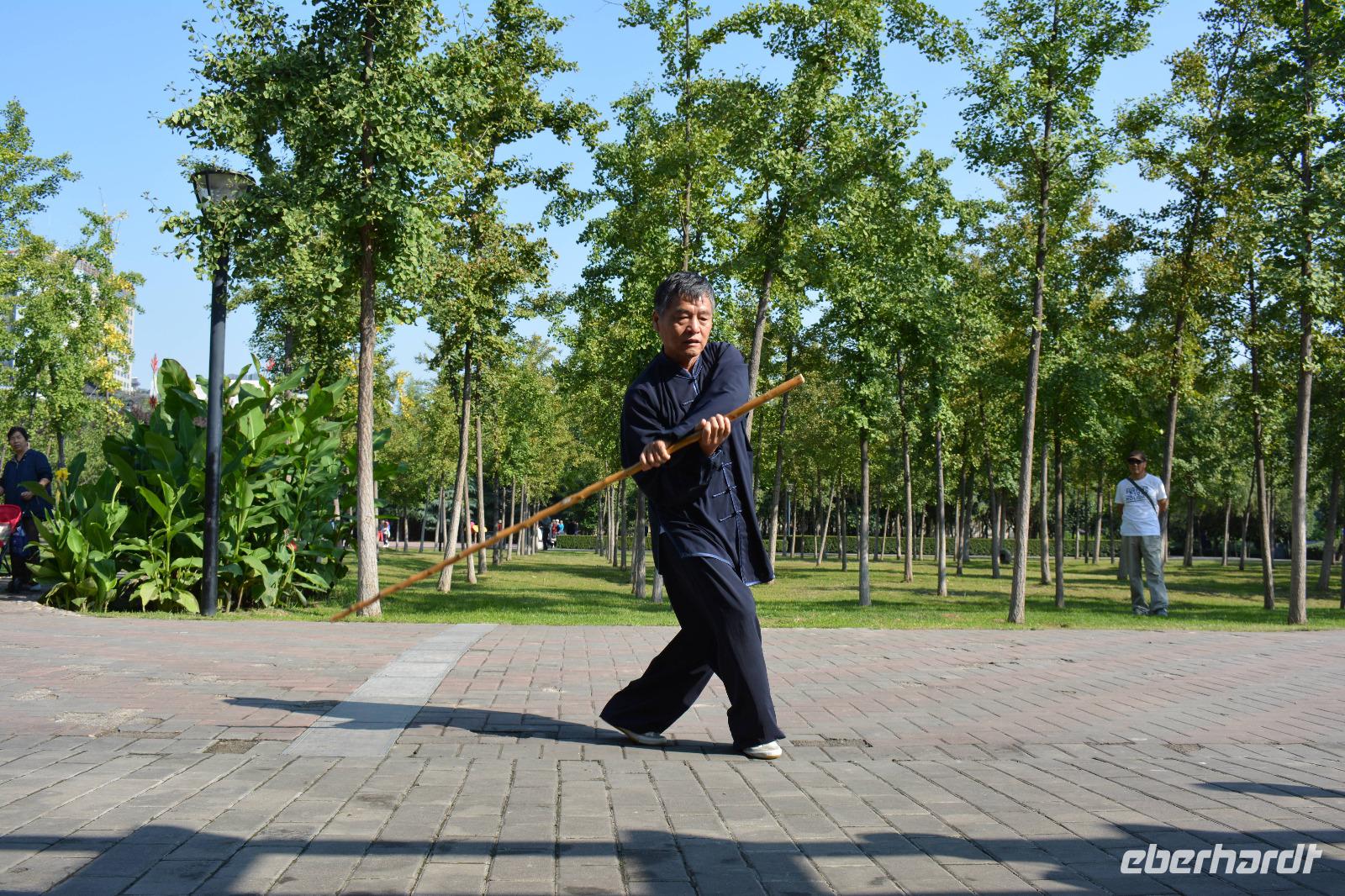 Ein langer Tag steht bevor, den wir jedoch sehr ruhig angehen. Als erstes besuchen wir heute einen kleinen Park. Hier steht Frühsport auf dem Programm. Einige Taiji Meister zeigen uns ihren Sport, welchen sie fast täglich im Park vollziehen. Sie zeigen uns Angriff und Verteidigung, wie uns Herr Wang erklärt und man braucht bis zu vier Monate um alle Bewegungen in einer Art Choreographie zu „tanzen". Nun sind auch wir dran: Vier Bewegungen werden uns gezeigt und sind auch gar nicht so leicht nachzumachen. Danach können wir auch unsere Kampfkünste mit Schwertern, Messern und Stöcken unter Beweis stellen, jedoch, nur für ein Bild!