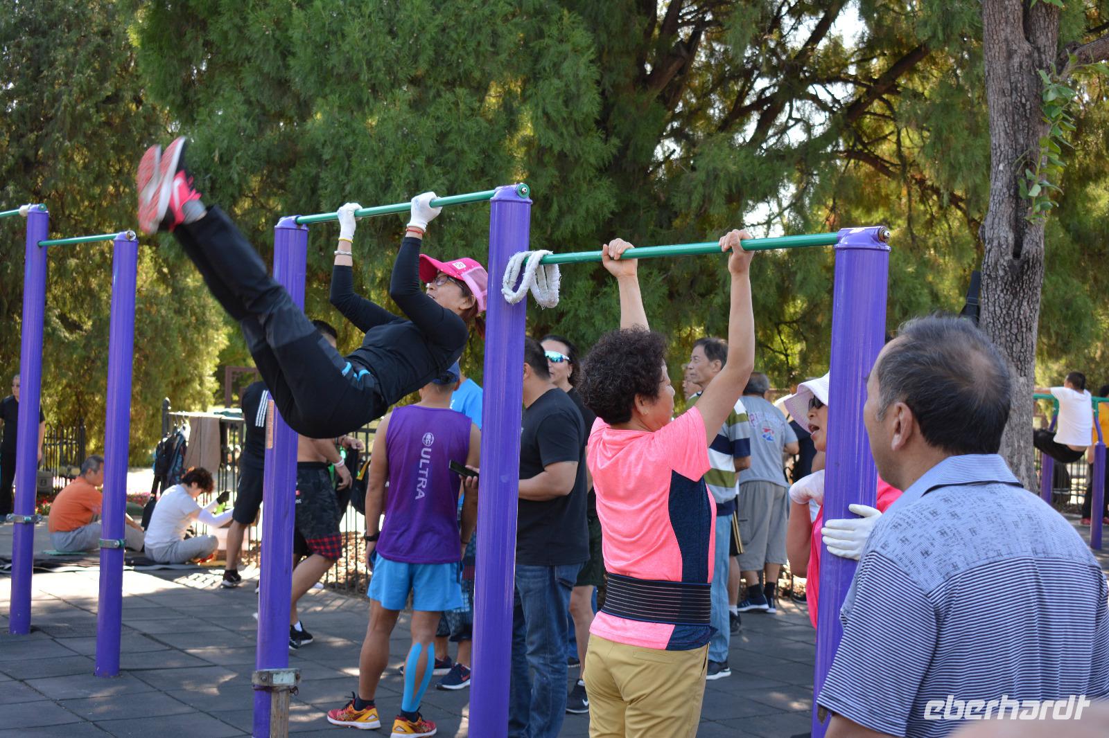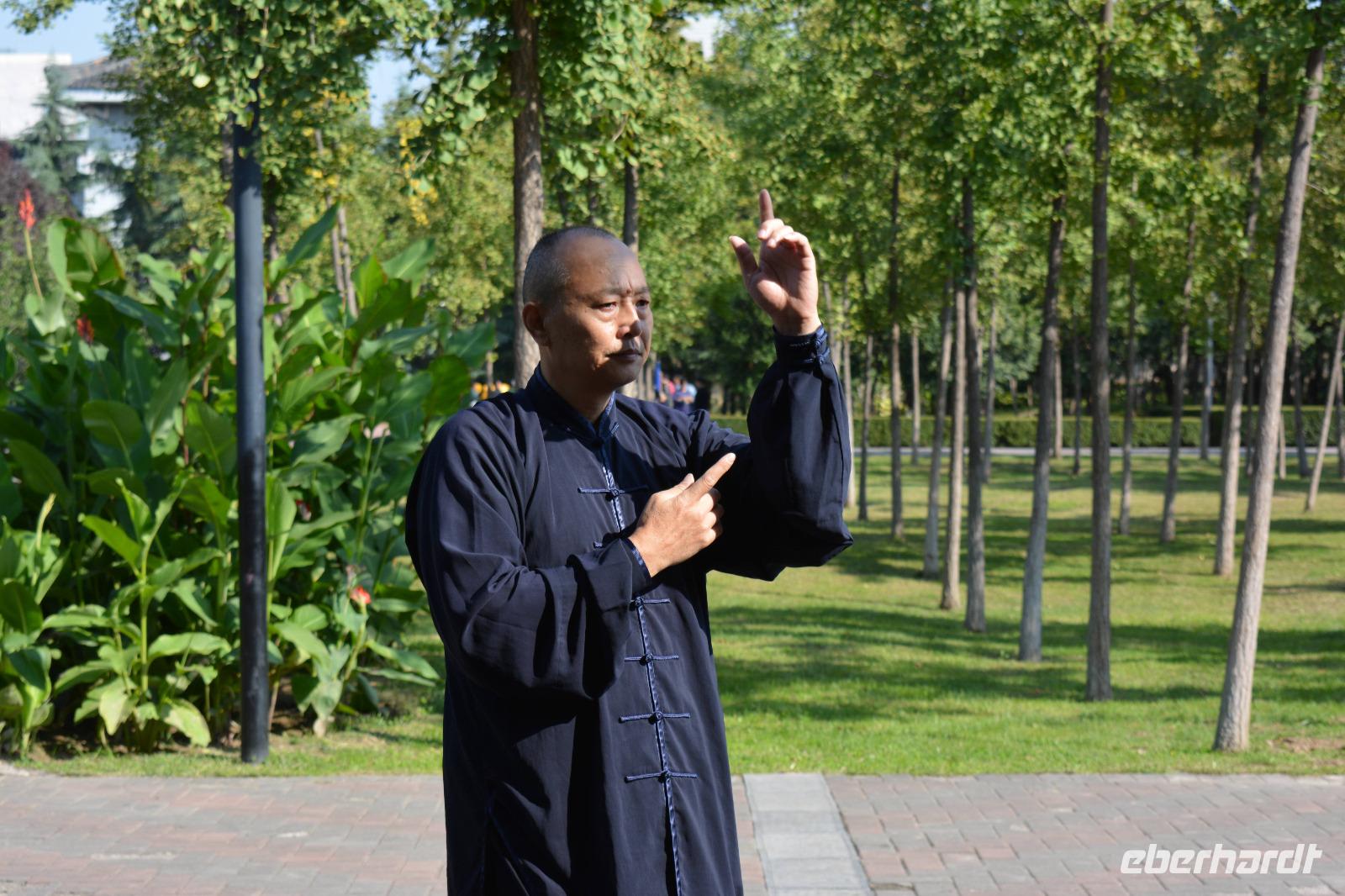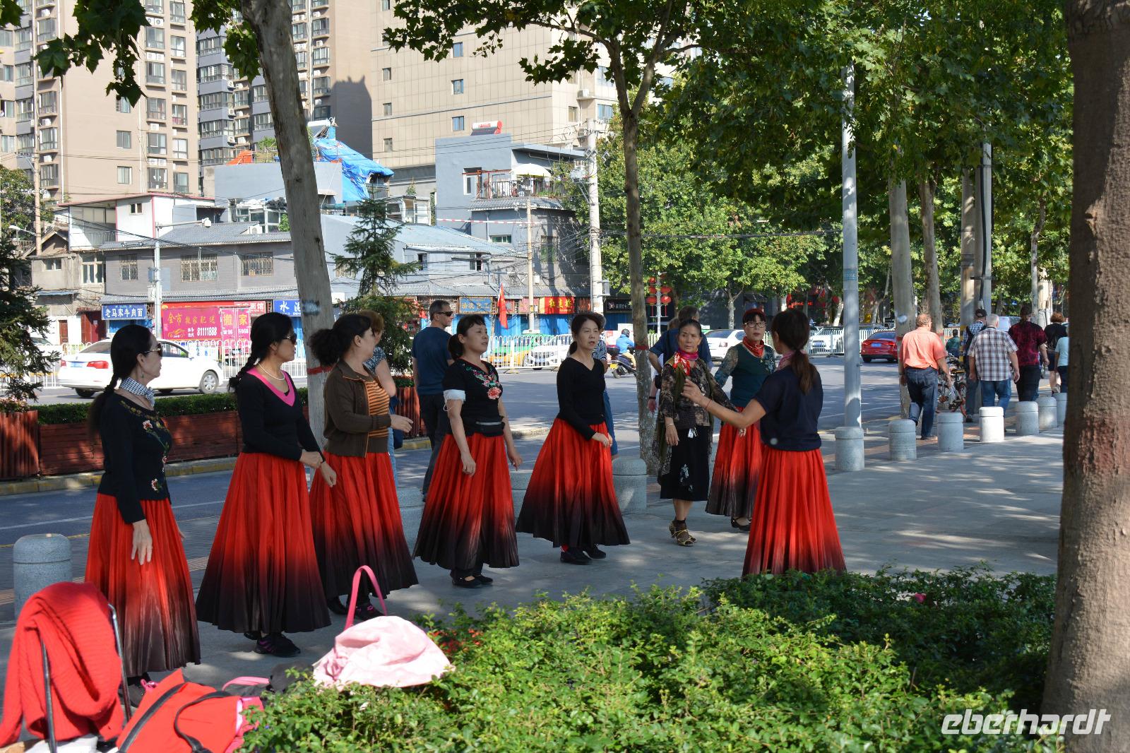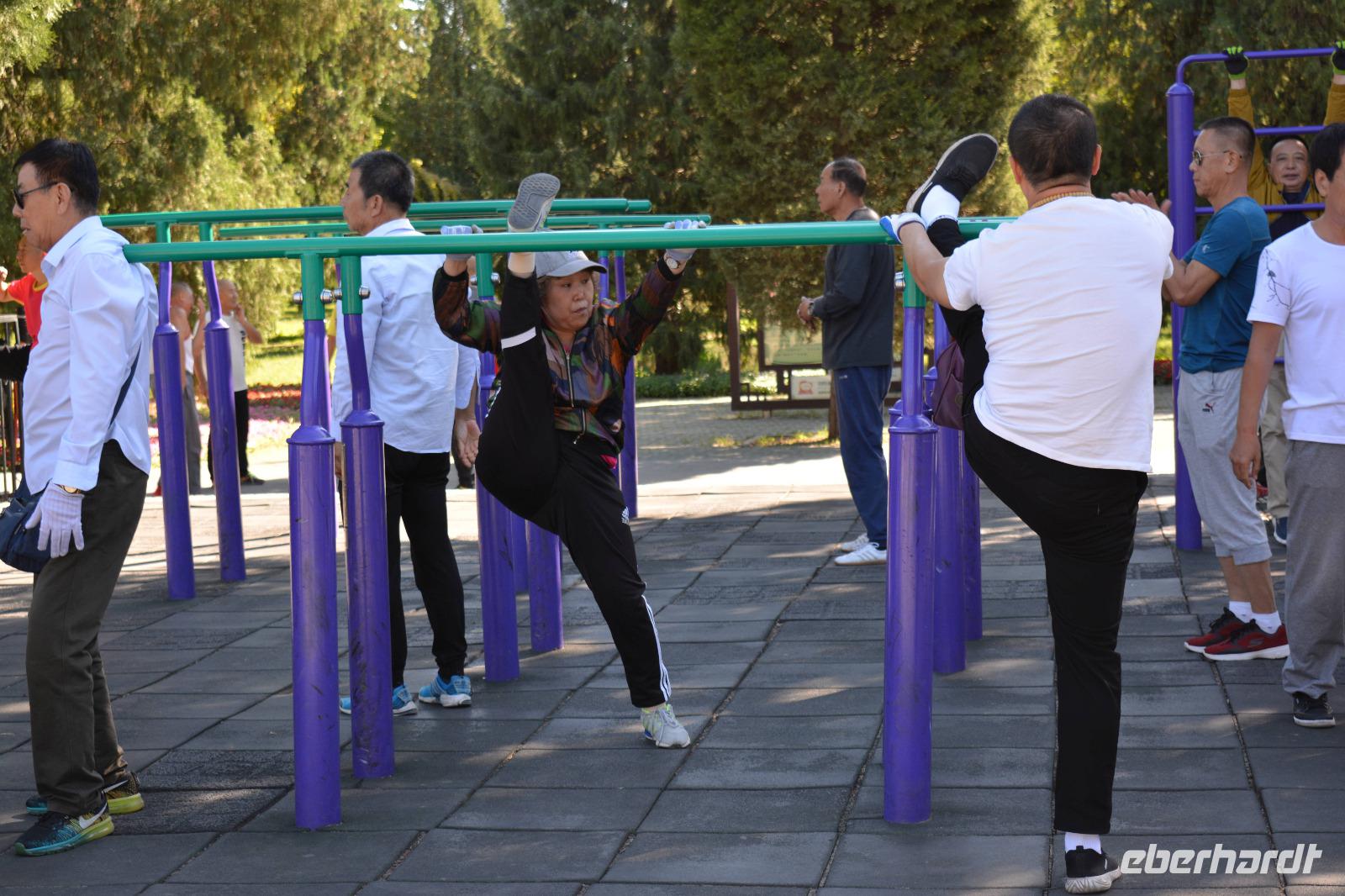 Ein langer Tag steht bevor, den wir jedoch sehr ruhig angehen. Als erstes besuchen wir heute einen kleinen Park. Hier steht Frühsport auf dem Programm. Einige Taiji Meister zeigen uns ihren Sport, welchen sie fast täglich im Park vollziehen. Sie zeigen uns Angriff und Verteidigung, wie uns Herr Wang erklärt und man braucht bis zu vier Monate um alle Bewegungen in einer Art Choreographie zu „tanzen". Nun sind auch wir dran: Vier Bewegungen werden uns gezeigt und sind auch gar nicht so leicht nachzumachen. Danach können wir auch unsere Kampfkünste mit Schwertern, Messern und Stöcken unter Beweis stellen, jedoch, nur für ein Bild!
