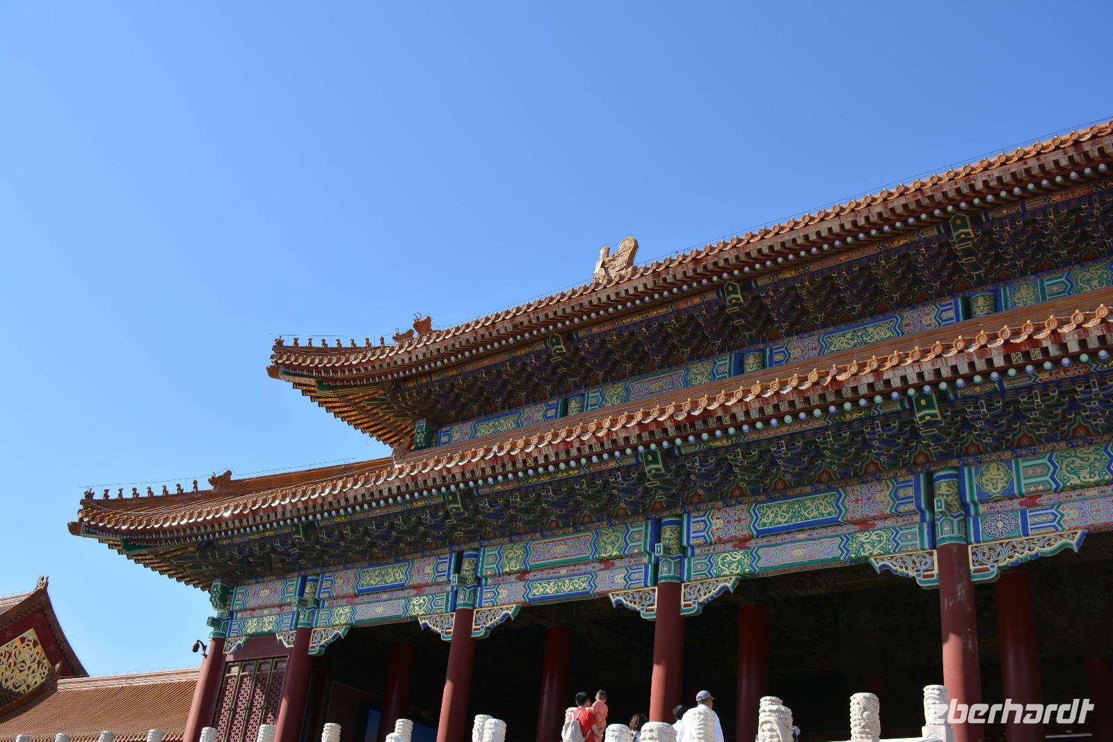 Die verbotene Stadt war damals der Hauptwohnsitz des Kaisers und ist mit einer hohen und sehr breiten Mauer umgeben, so war er von jeglichen Angriffen geschützt. Ebenso gab es spezielle Bereiche, welche nur für den Kaiser und seine männliche Gefolgschaft gedacht waren. Interessant sind vor allem die Verzierungen und Statuen an und auf den verschiedenen Palästen. Die Paläste des Kaisers sind mit dem Drachen und die der Kaiserin mit dem Phönix bemalt. Ebenso sitzen neun kleine Fabelwesen auf jeder Kante des Dachs der Kaiserpaläste. Diese Zahl ist die höchste ungerade Glückszahl, sozusagen die Zahl des Kaisers und man findet immer wieder Hinweise darauf in den verschiedenen Tempeln.