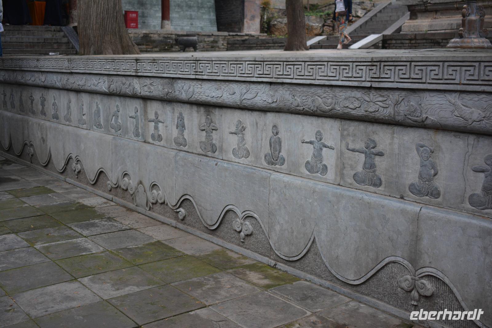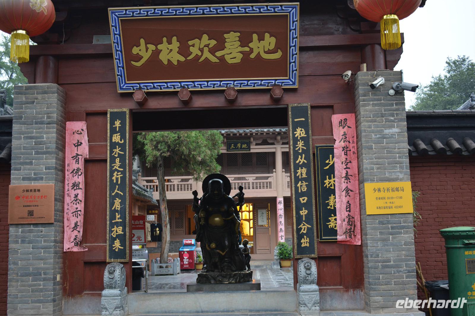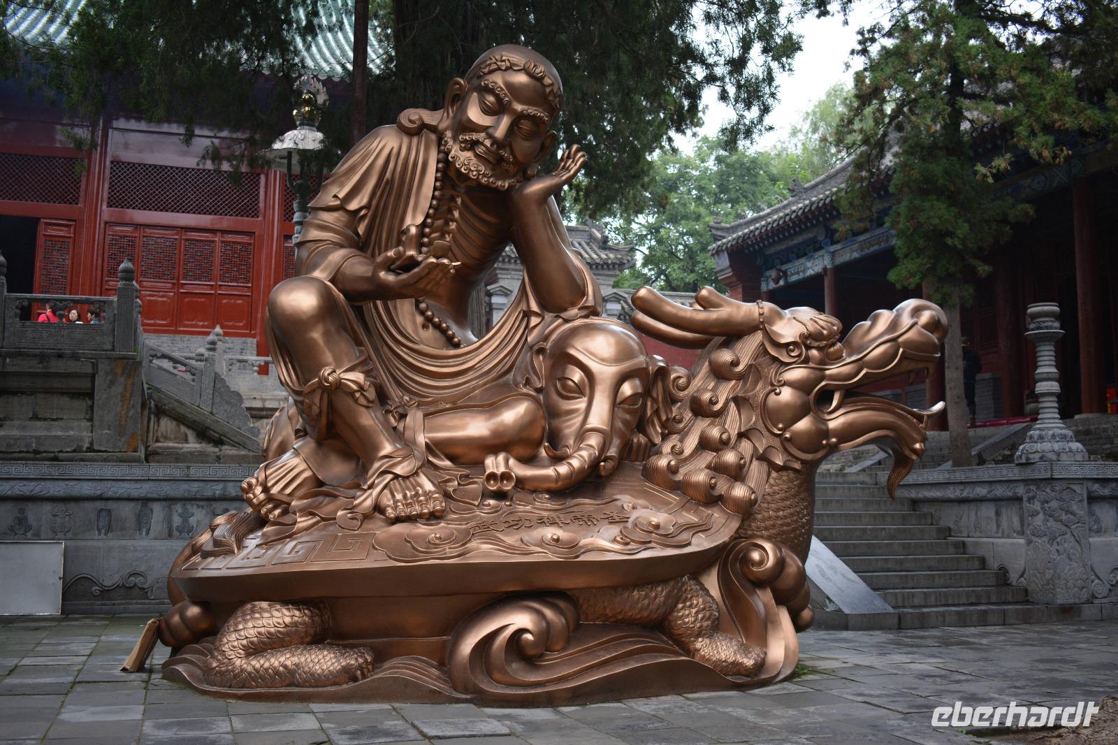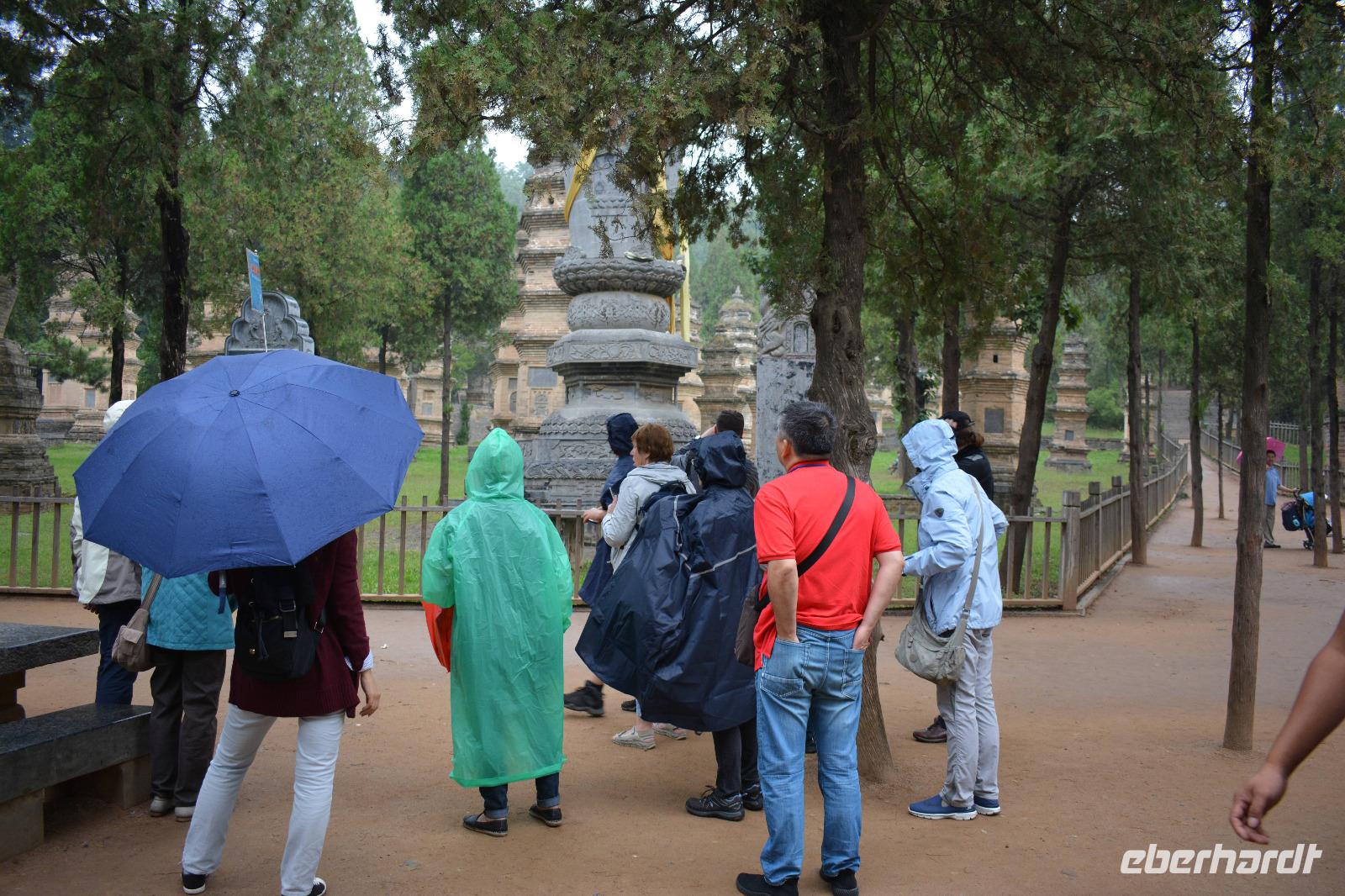 Wir erreichen unseren Bus und machen uns auf den Weg zum Kloster. Leider fängt es an zu regnen, aber das wird uns nicht den Tag verderben. Wir laufen eine lange Allee entlang und entdecken mitten im Park das Shaolinkloster. Hierhin können die Männer nach der Kung Fu Schule ziehen oder sie entscheiden sich für eine Laufbahn bei der Armee, Polizei oder als Bodyguard. Das Gelände des Klosters besteht wieder aus vielen verschiedenen Pagoden, welche hier mit sieben Fabelwesen auf dem Dach geschmückt sind. Sieben ist die heilige Zahl des Buddhismus. In den Pagoden sind meist schöne Buddha-Statuen zu sehen.