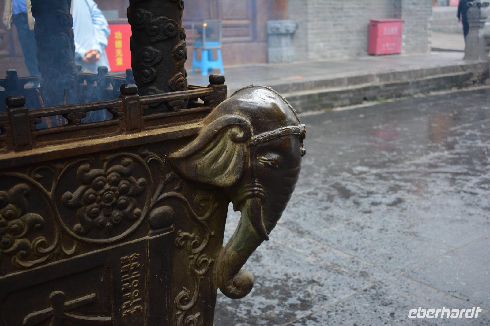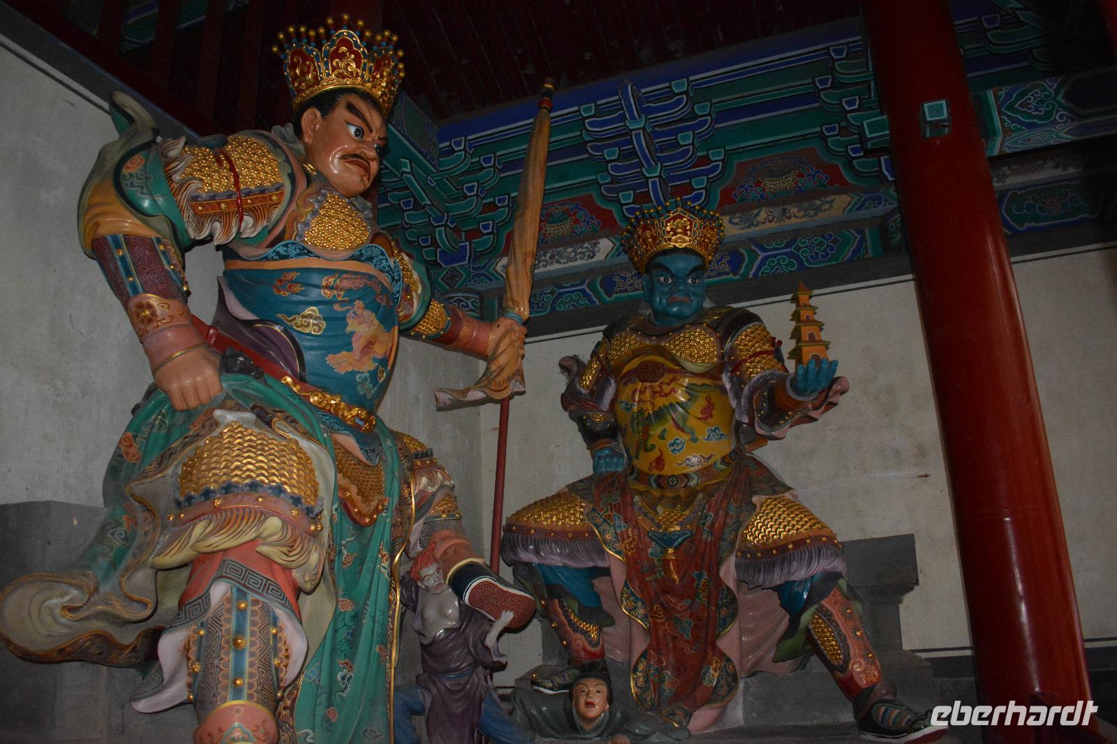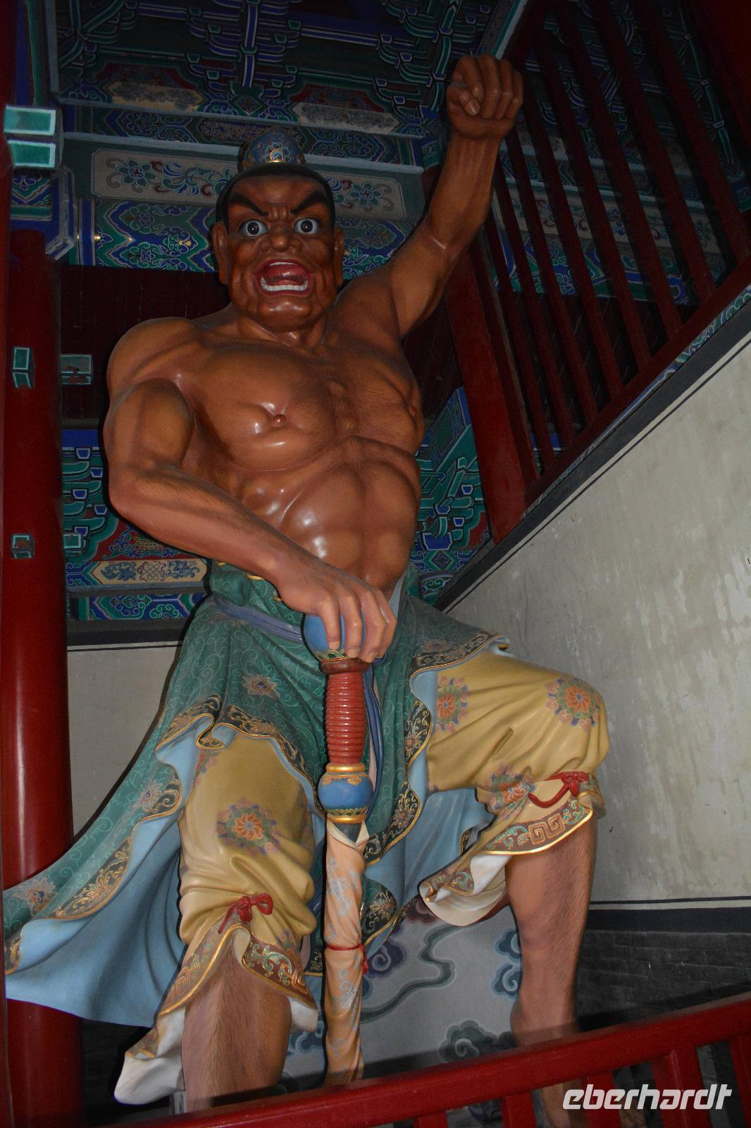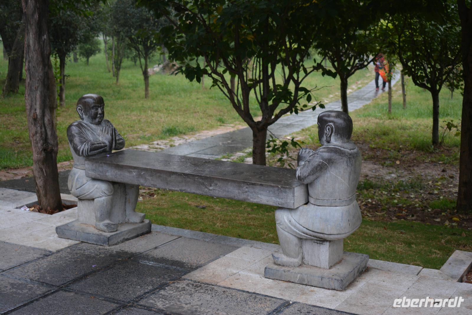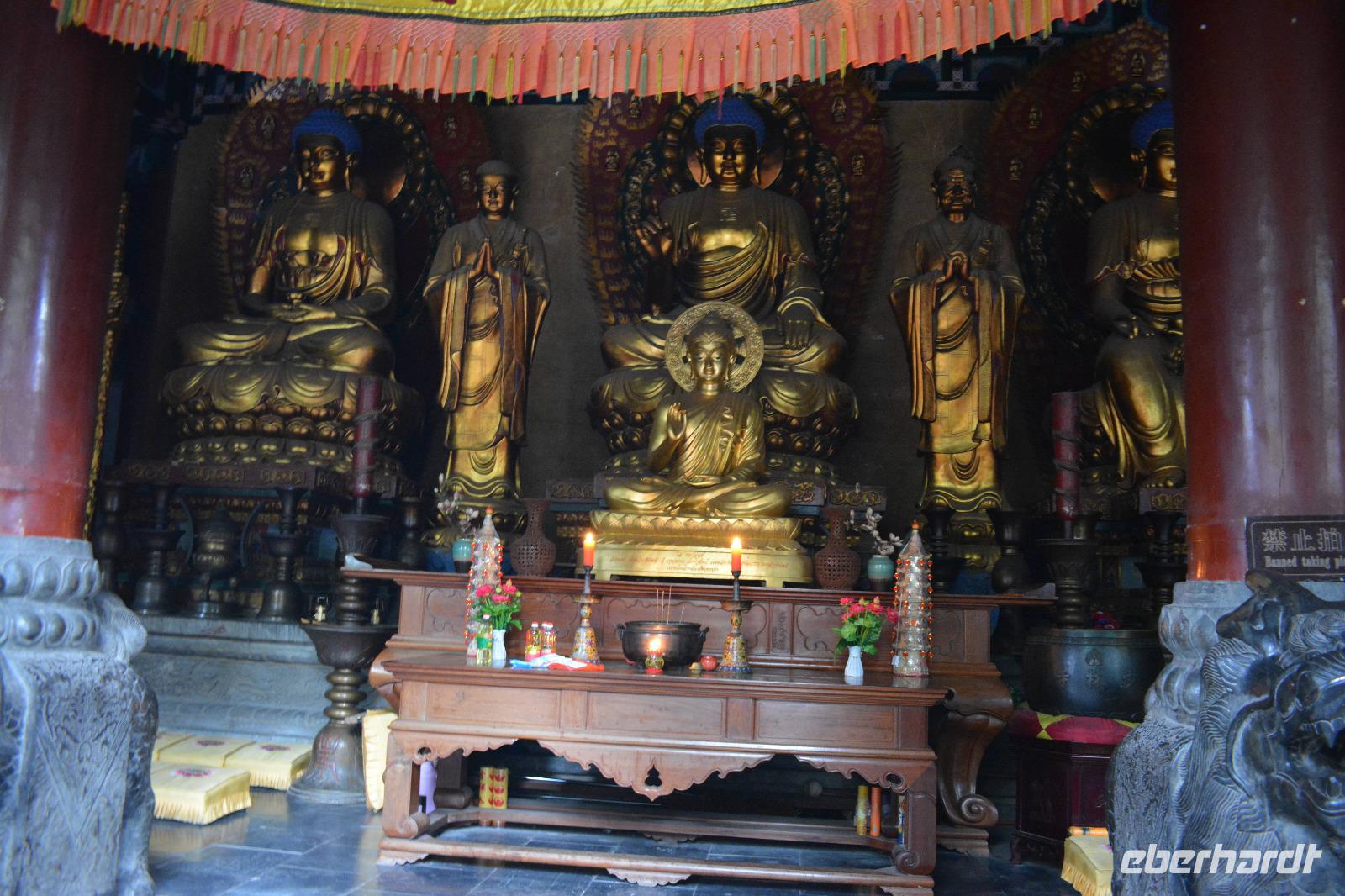 Wir erreichen unseren Bus und machen uns auf den Weg zum Kloster. Leider fängt es an zu regnen, aber das wird uns nicht den Tag verderben. Wir laufen eine lange Allee entlang und entdecken mitten im Park das Shaolinkloster. Hierhin können die Männer nach der Kung Fu Schule ziehen oder sie entscheiden sich für eine Laufbahn bei der Armee, Polizei oder als Bodyguard. Das Gelände des Klosters besteht wieder aus vielen verschiedenen Pagoden, welche hier mit sieben Fabelwesen auf dem Dach geschmückt sind. Sieben ist die heilige Zahl des Buddhismus. In den Pagoden sind meist schöne Buddha-Statuen zu sehen.