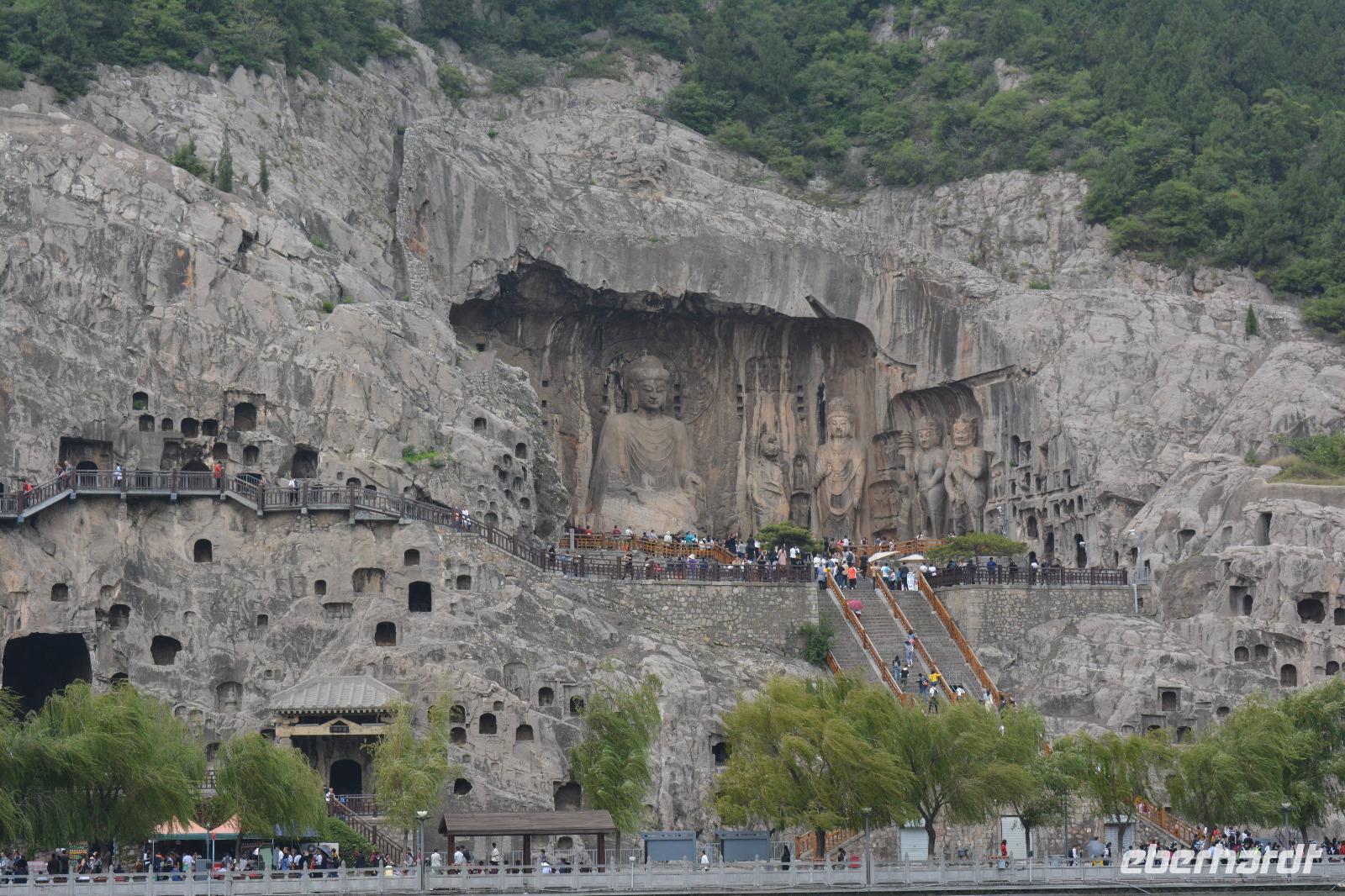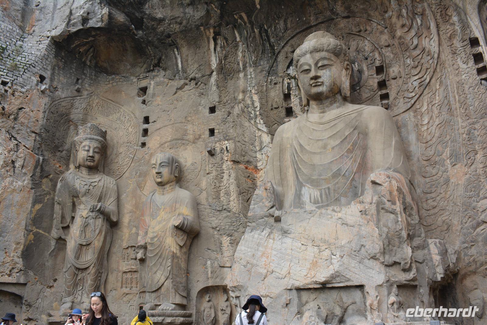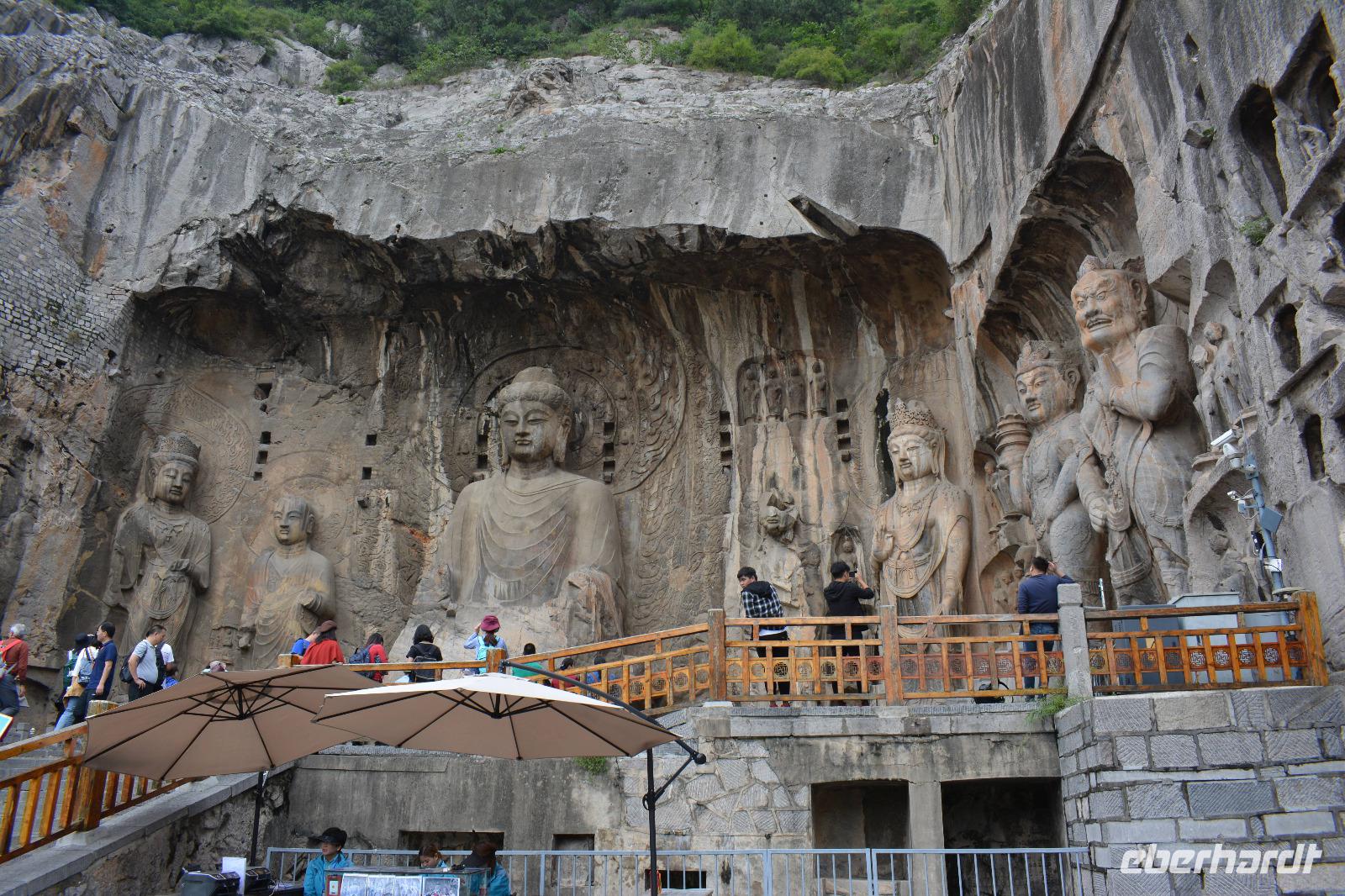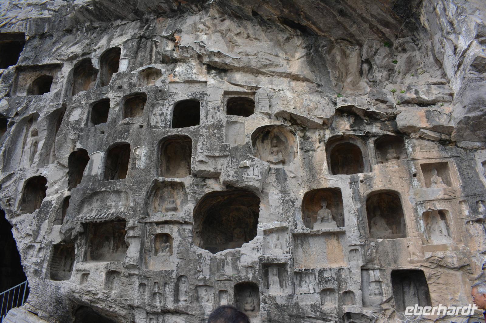8.30 Uhr starten wir heute zu den Drachentor-Grotten, diese liegen in der Nähe der ehemaligen Hauptstadt Luoyang und wir können über 100.00 Buddha-Statuen betrachten. Leider wurden viele Statuen im 2. Weltkrieg beschädigt, indem die Japaner die Hände oder Köpfe der Buddhas abschlugen und mitnahmen. Die größte Statue ist 17,14 Meter groß. Allein die Ohren haben eine Länge von 1,90 Meter. In China sagt man: Lange Ohren stehen für ein langes Leben.