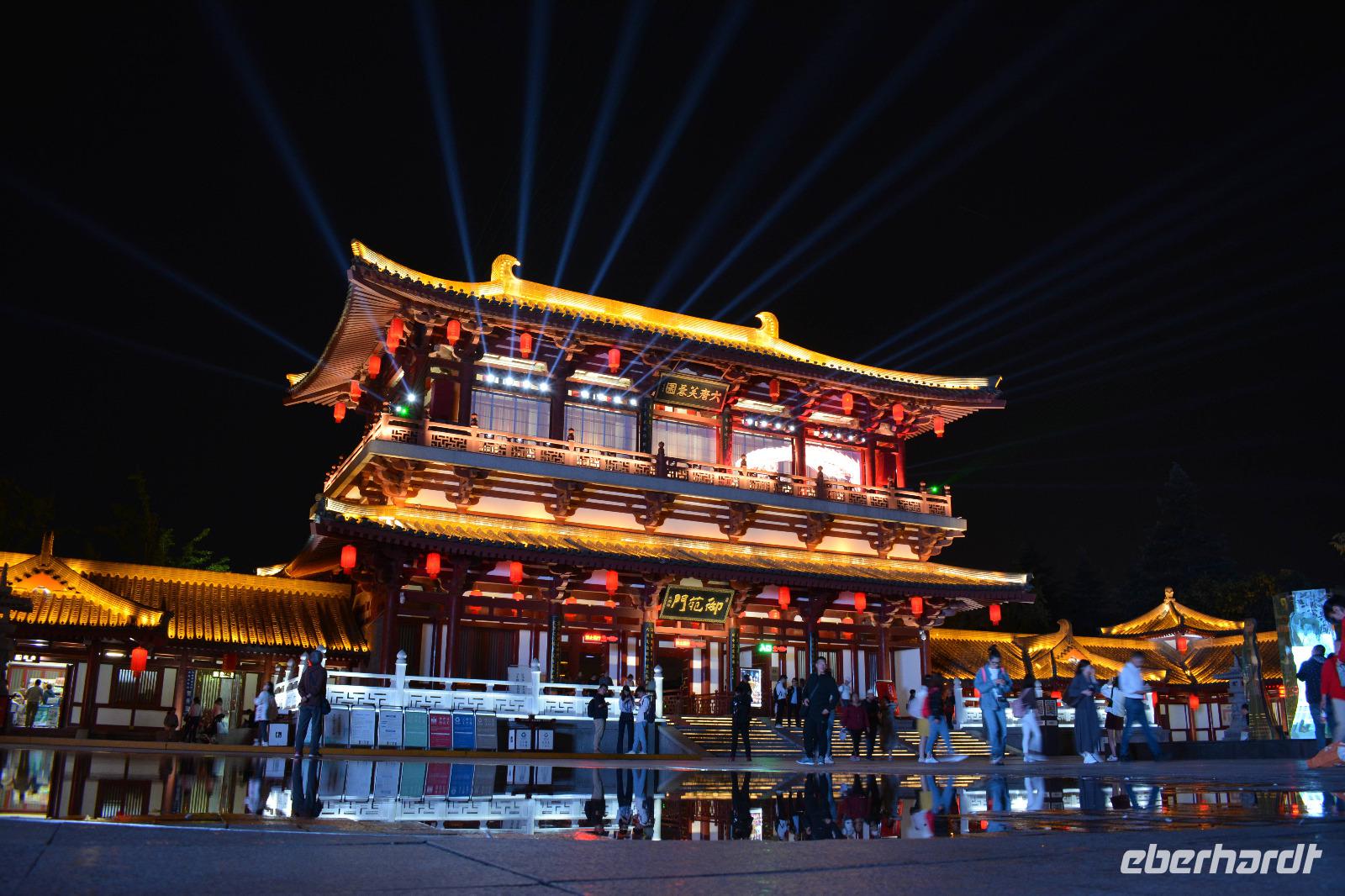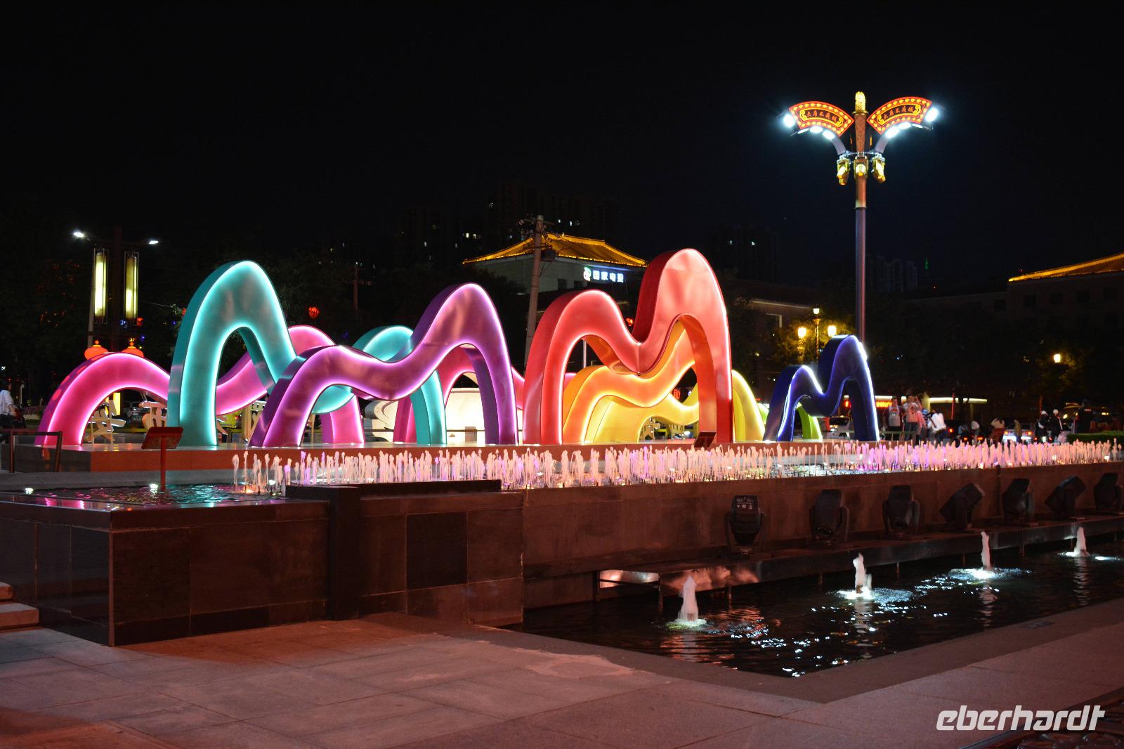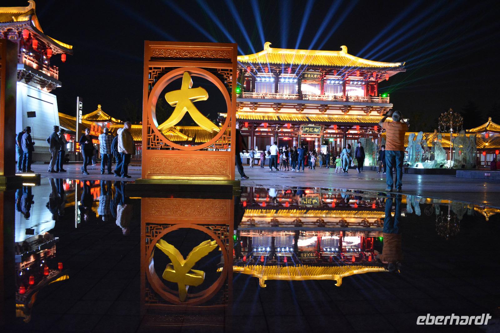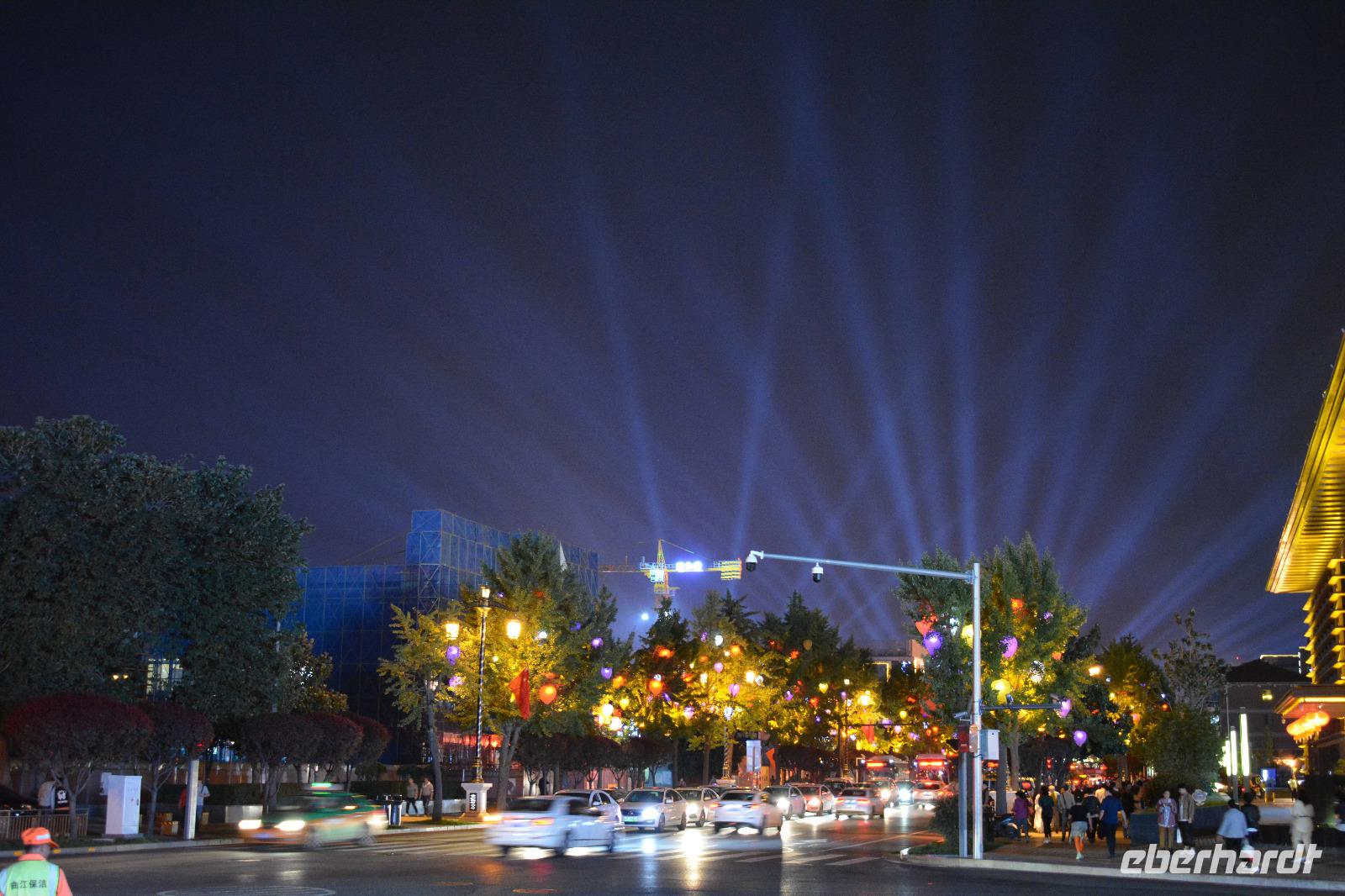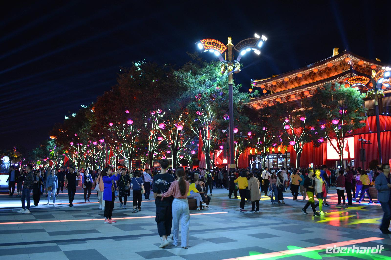 Am Nachmittag nehmen wir den Schnellzug von Luoyang nach Xi'an wo ein reichhaltiges Buffet auf uns wartet. Nach einem kurzen Stopp im Hotel nimmt uns unser lokaler Reiseleiter Herr Wang mit auf eine abendliche Tour von Xi'an. Die Lichterfahrt führt uns an vielen wichtigen Sehenswürdigkeiten vorbei. Ein besonderes Highlight ist die „Straße ohne Nacht". Viele bunte Lichter entlang der Straße locken viele Einheimische nach draußen. Stände mit bunten Speisen oder tollen Souvenirs beeindrucken uns und erhöhen die Freude, diese tolle Stadt am nächsten Tag auch im Hellen zu sehen.