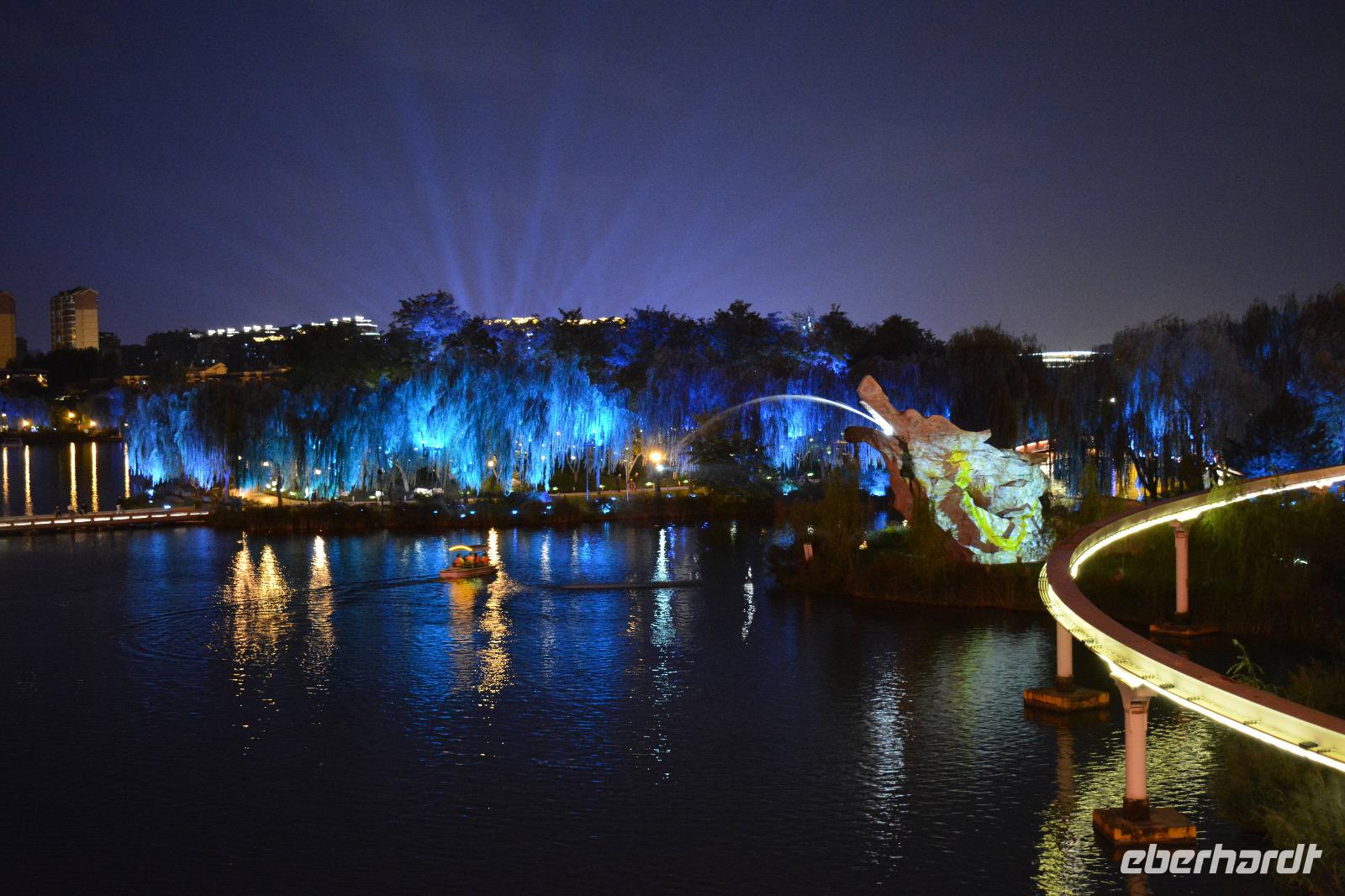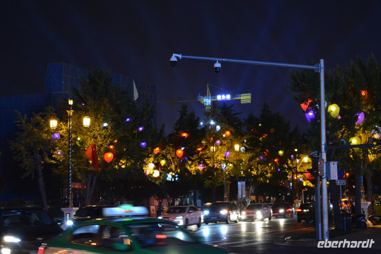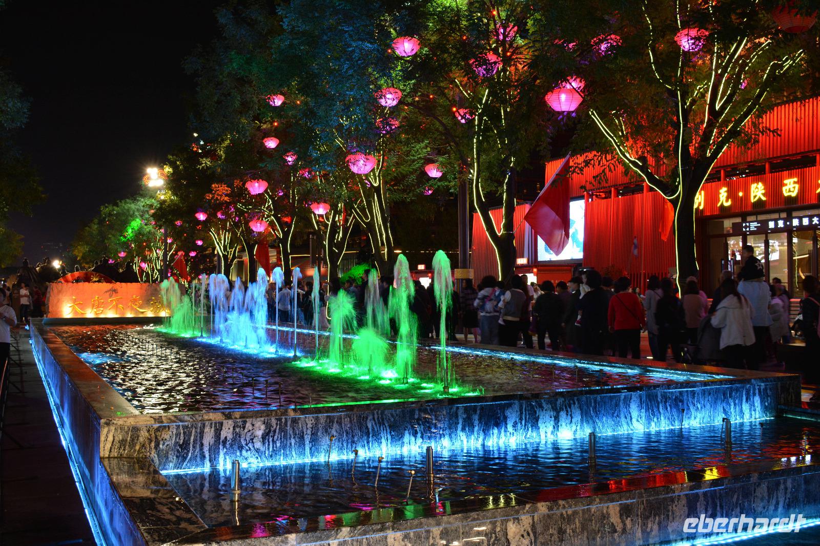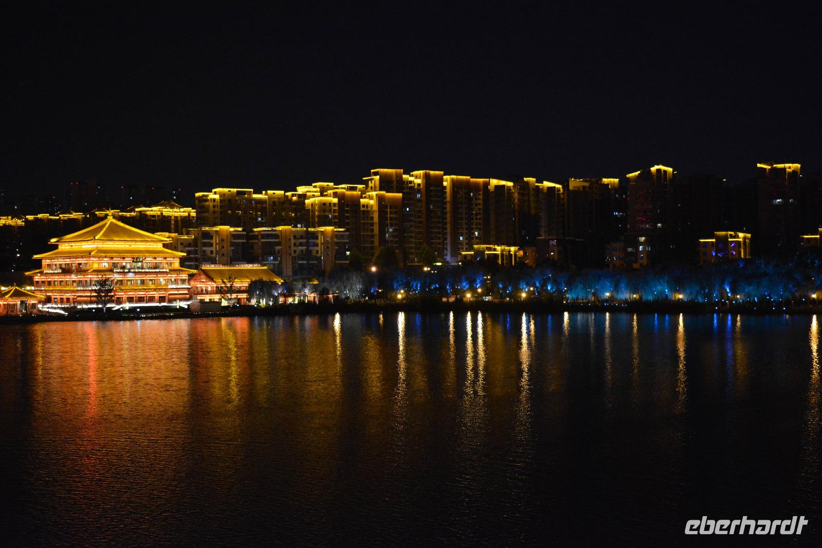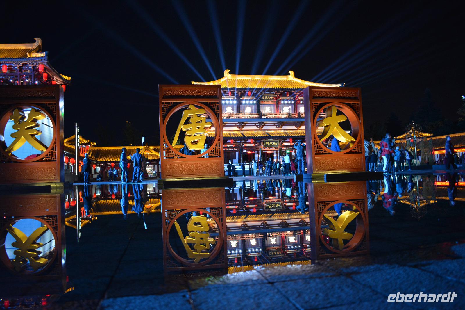 Am Nachmittag nehmen wir den Schnellzug von Luoyang nach Xi'an wo ein reichhaltiges Buffet auf uns wartet. Nach einem kurzen Stopp im Hotel nimmt uns unser lokaler Reiseleiter Herr Wang mit auf eine abendliche Tour von Xi'an. Die Lichterfahrt führt uns an vielen wichtigen Sehenswürdigkeiten vorbei. Ein besonderes Highlight ist die „Straße ohne Nacht". Viele bunte Lichter entlang der Straße locken viele Einheimische nach draußen. Stände mit bunten Speisen oder tollen Souvenirs beeindrucken uns und erhöhen die Freude, diese tolle Stadt am nächsten Tag auch im Hellen zu sehen.
