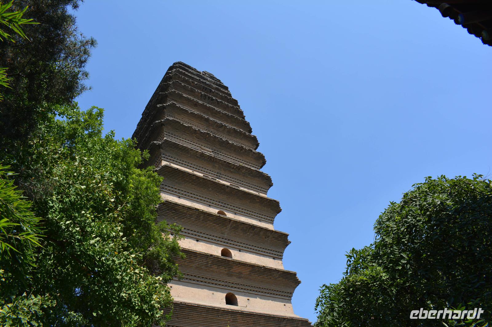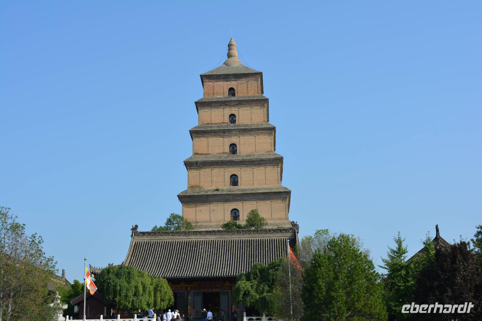 Herr Wang zeigt uns heute seine Stadt. Mit vielen Witzen und Weisheiten führt er uns zuerst zur großen Wildganspagode. Früher wurde diese zur Aufbewahrung von heiligen Schriften genutzt. Auch heute ist sie und ihre Tempel noch ein heiliger Ort an dem gebetet wird und wo auch Mönche leben und arbeiten. Jedoch ist nicht wirklich geklärt, woher die Pagode ihren Namen hat. Herr Wang vertraut folgender Theorie am meisten: Die Mönche mussten lange Zeit fasten und hatten kein Fleisch zu essen, bis plötzlich eine Wildgans vom Himmel fiel. Sie dachten jedoch, dass Buddha diese auf die Erde geschickt hatte und die Mönche somit auf die Probe stellen wollte. Die Mönche vergruben die Wildgans und errichteten auf Ihrem Grab die Pagode.
