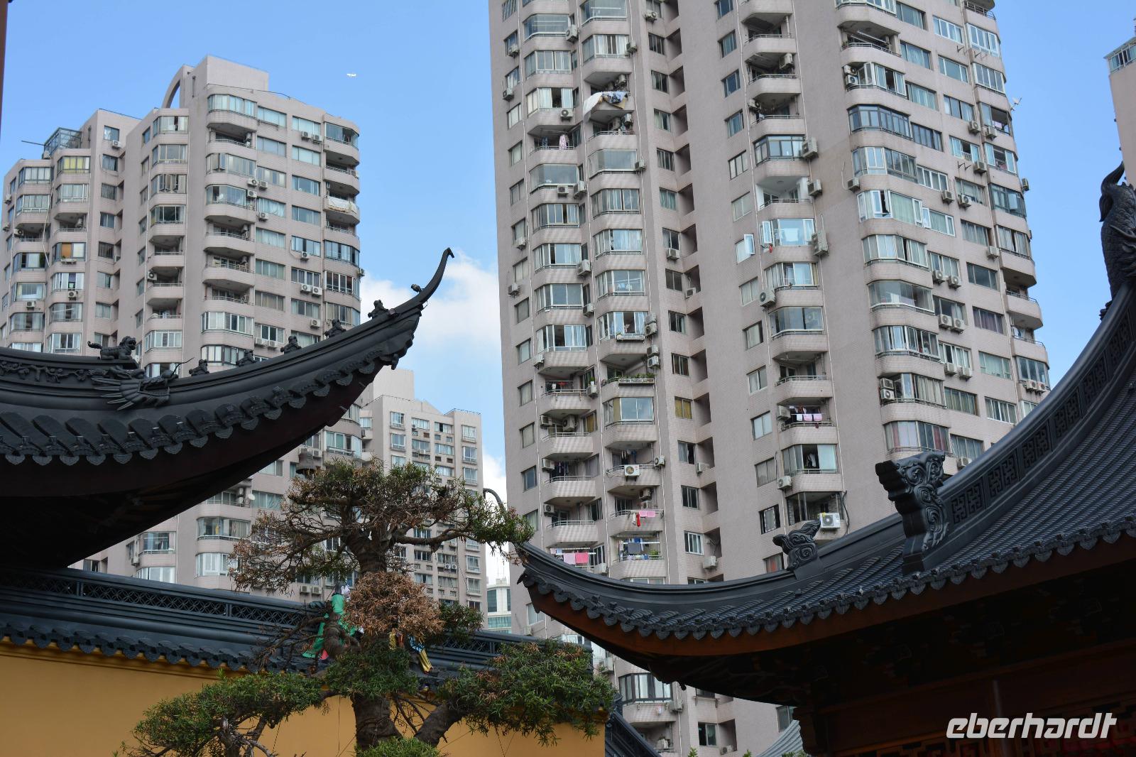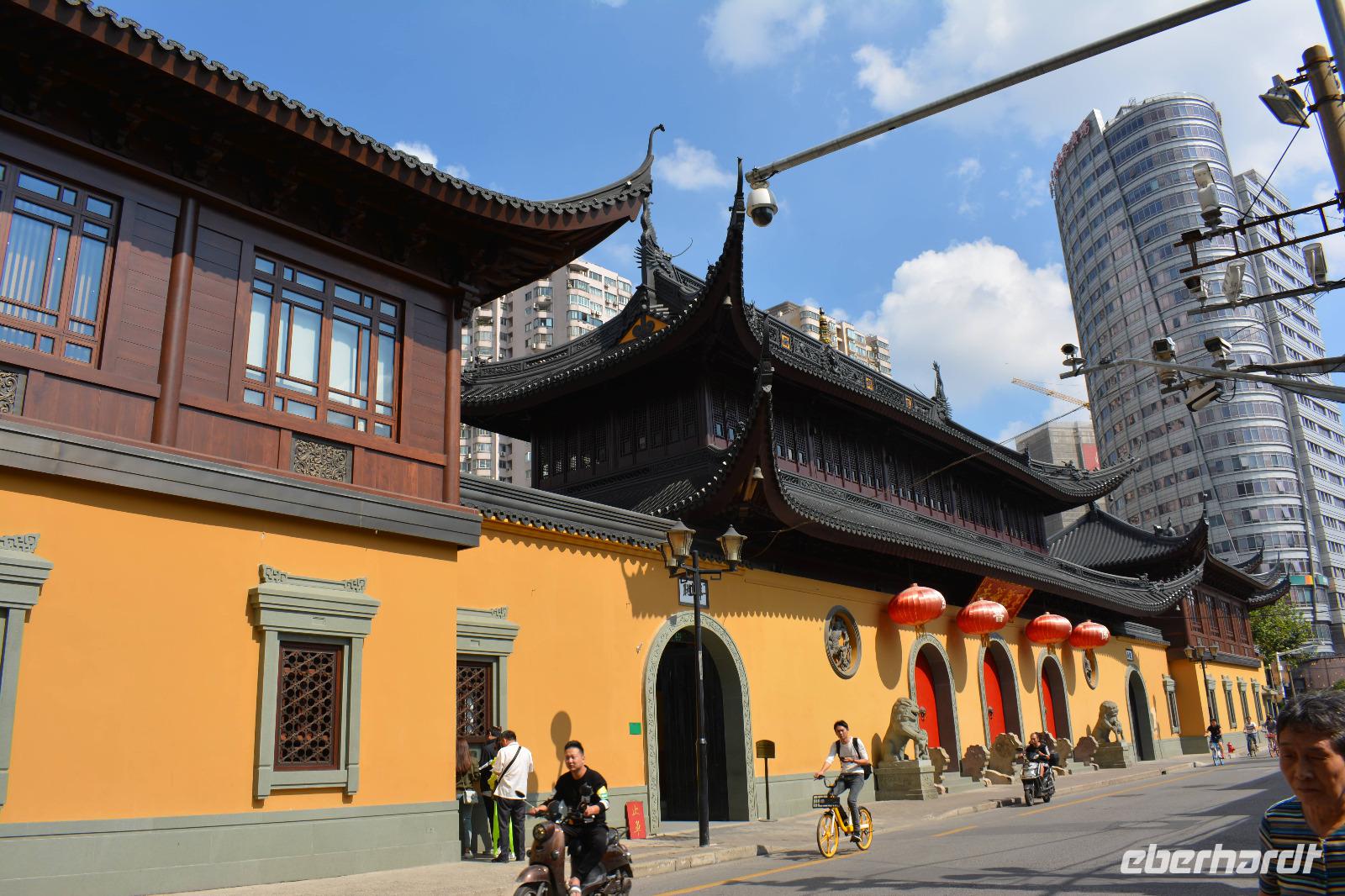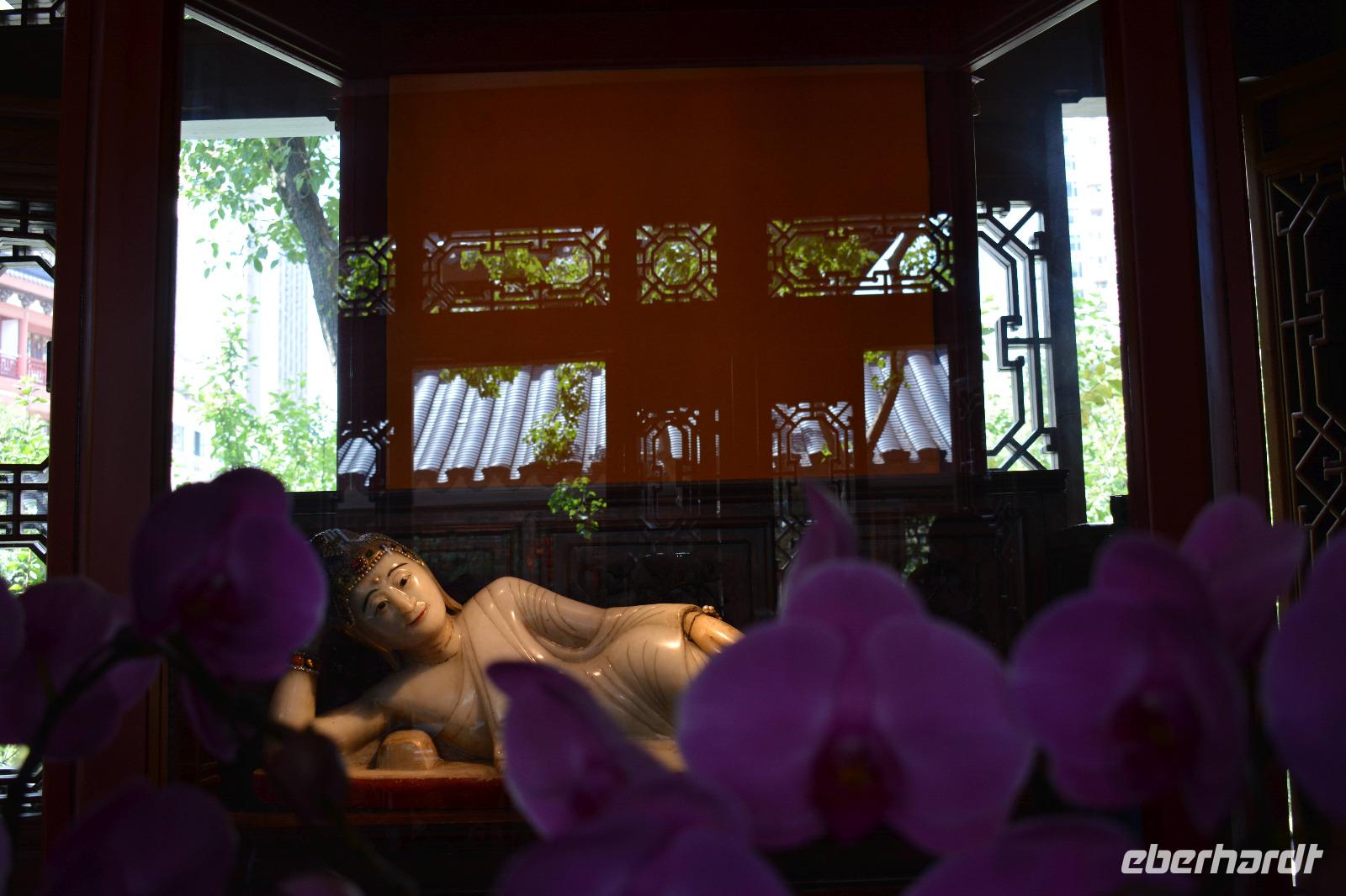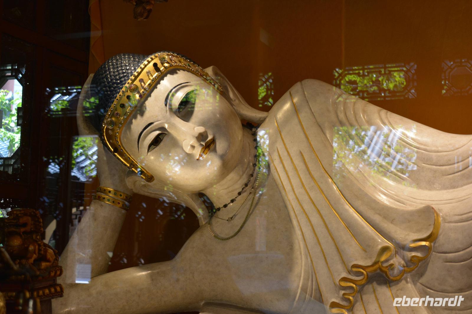Ebenfalls einen drastischen Gegensatz bietet uns unser nächstes Ziel. Zwischen Hochhäusern und Wohnblocks wurde hier mitten in der Stadt eine buddhistische Tempelanlage aufgebaut. Wir sehen den originalen sitzenden Jade-Buddha, sowie den originalen liegenden Jade-Buddha mit seiner viel größeren Kopie. Viele Mönche leben und arbeiten hier und dieser Tempel ist auch ein beliebtes Ausflugsziel für inländische Gläubige vom Land. Und ganz nebenbei, auch Bill Clinton war vor einiger Zeit hier und extra für ihn wurde auch die „Harmoniehalle" saniert.