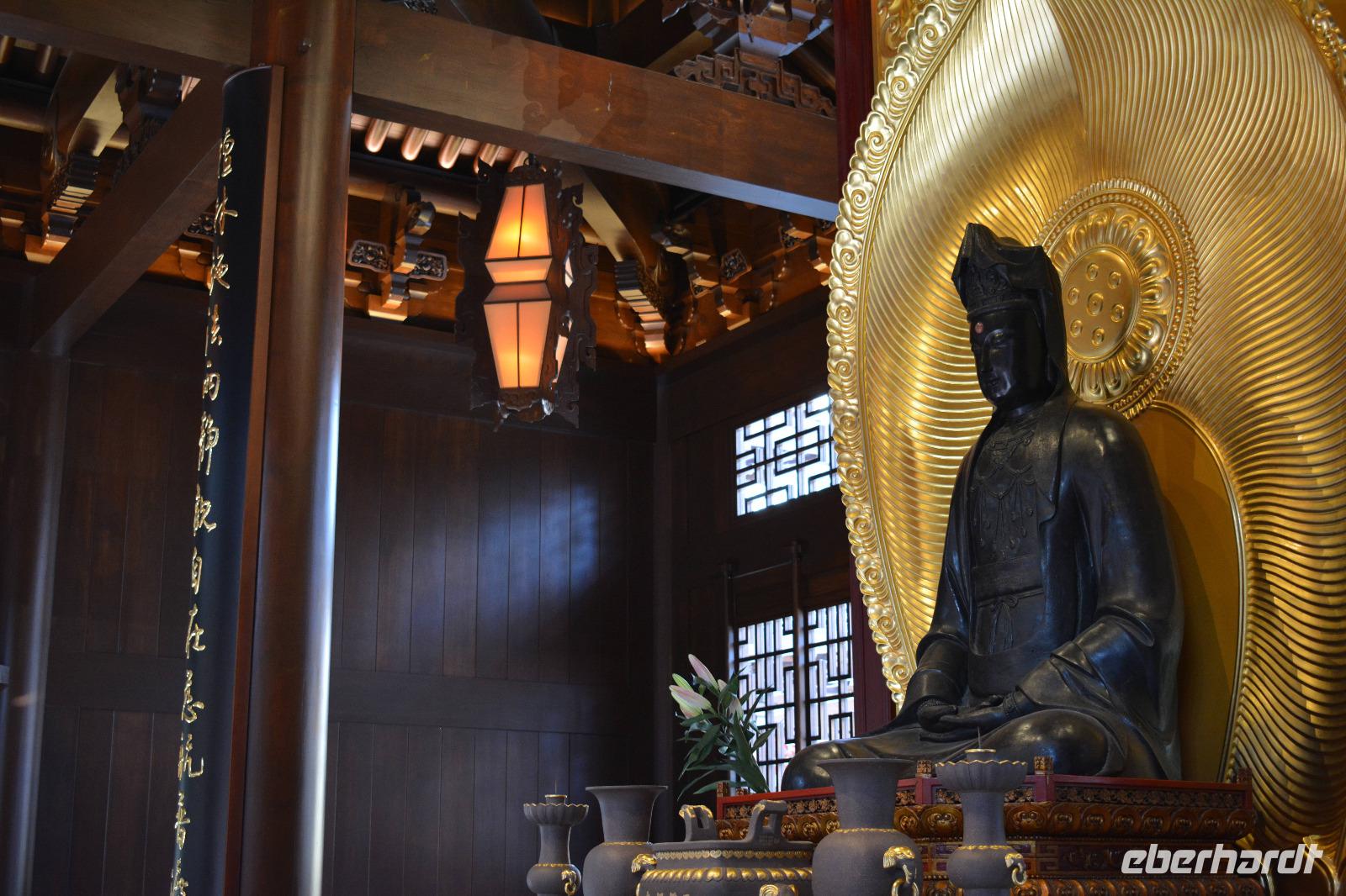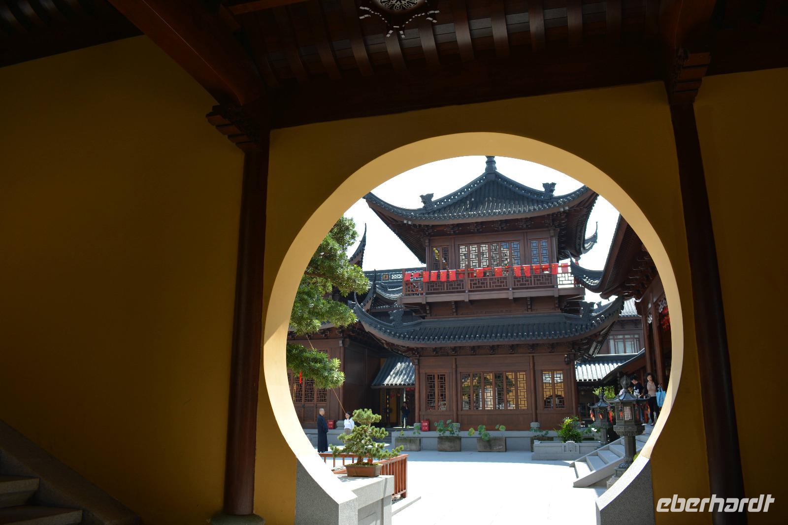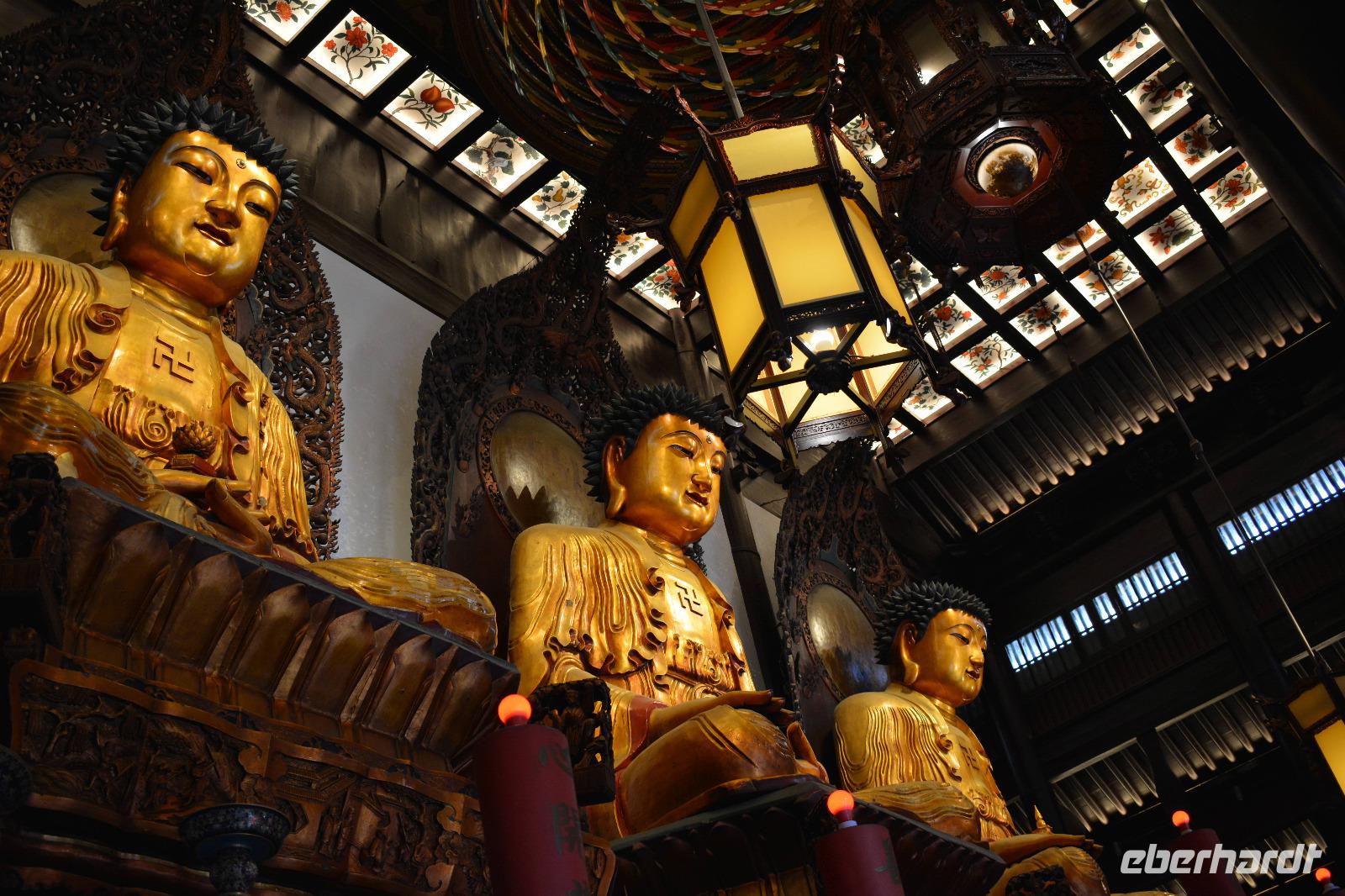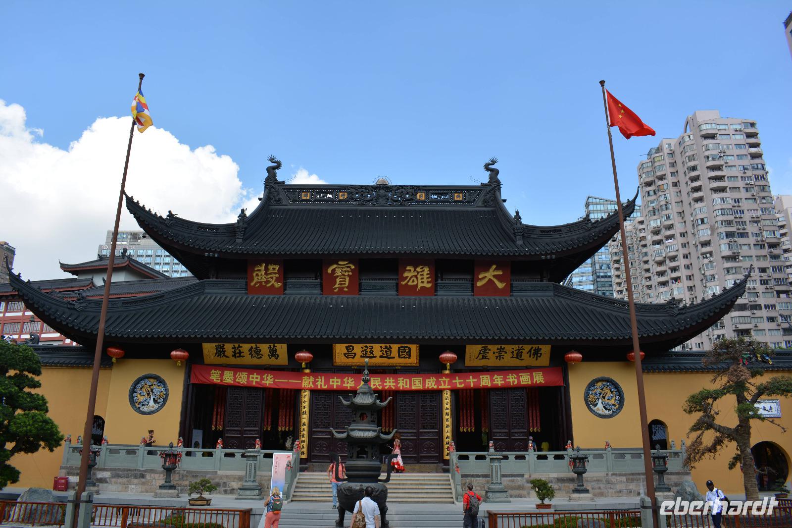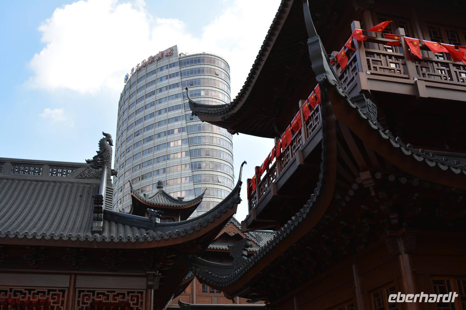 Ebenfalls einen drastischen Gegensatz bietet uns unser nächstes Ziel. Zwischen Hochhäusern und Wohnblocks wurde hier mitten in der Stadt eine buddhistische Tempelanlage aufgebaut. Wir sehen den originalen sitzenden Jade-Buddha, sowie den originalen liegenden Jade-Buddha mit seiner viel größeren Kopie. Viele Mönche leben und arbeiten hier und dieser Tempel ist auch ein beliebtes Ausflugsziel für inländische Gläubige vom Land. Und ganz nebenbei, auch Bill Clinton war vor einiger Zeit hier und extra für ihn wurde auch die „Harmoniehalle" saniert.