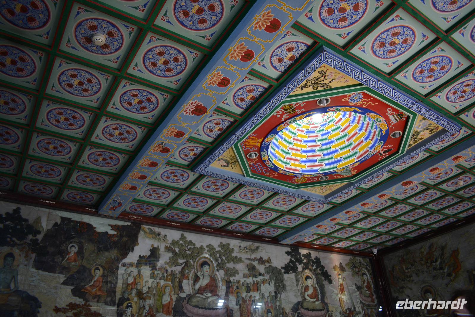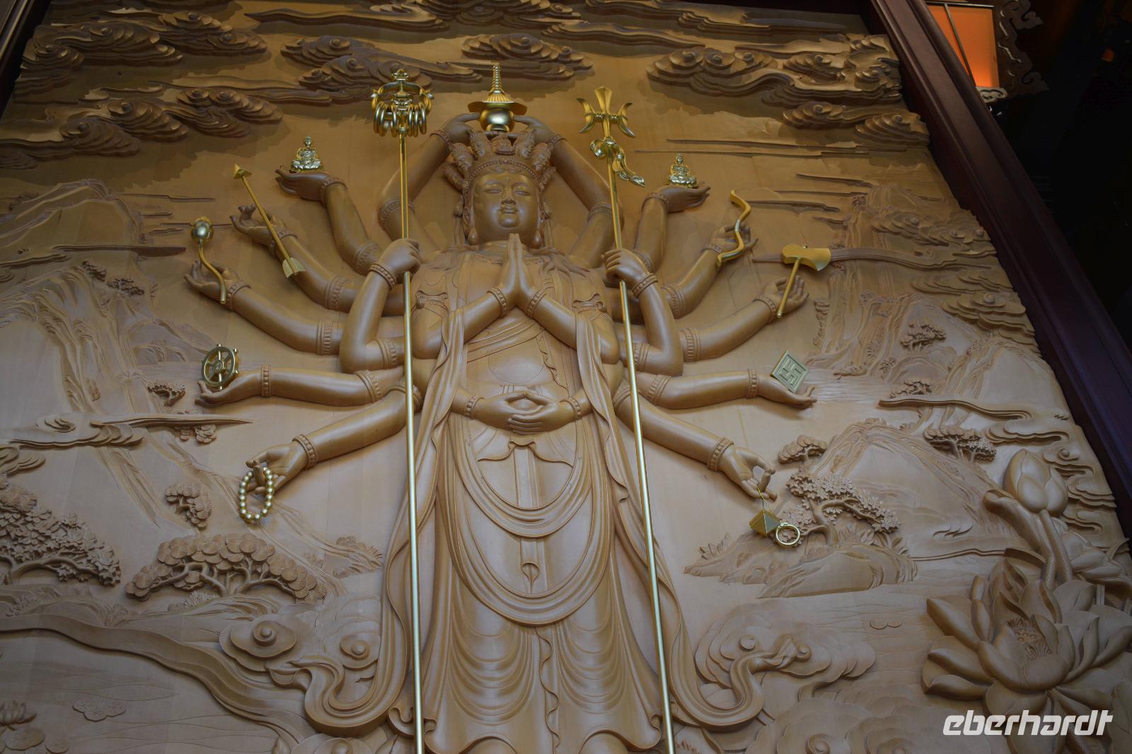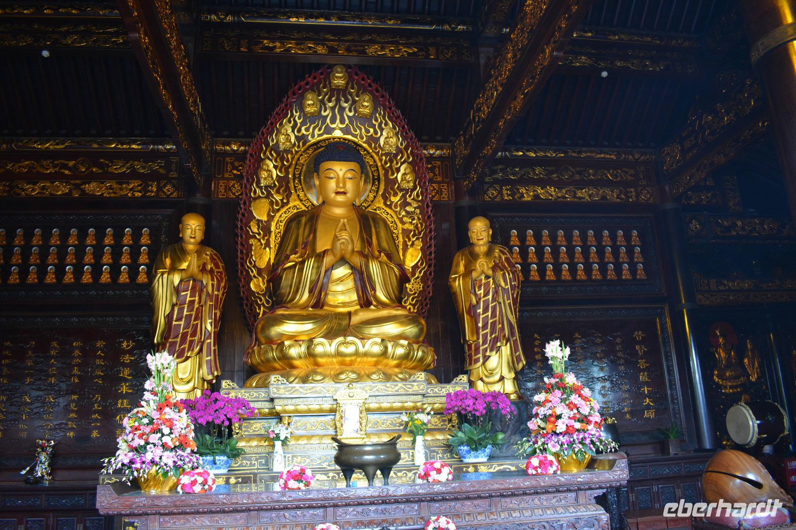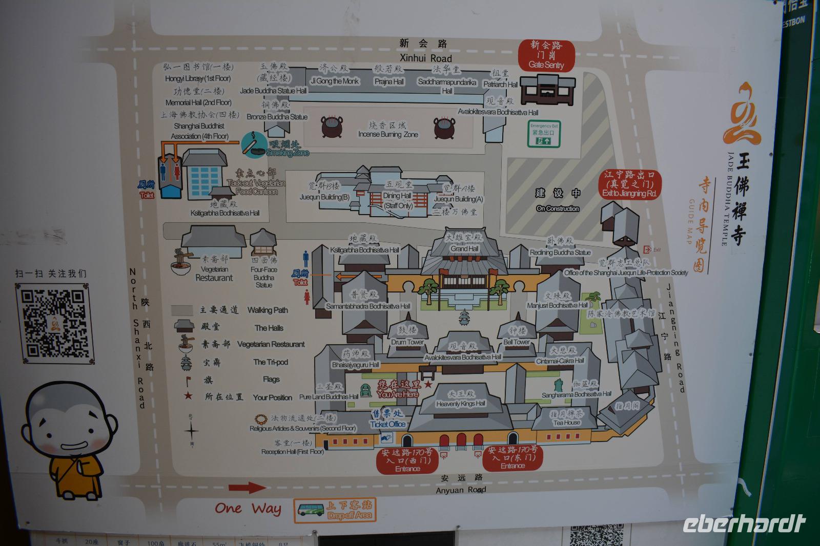 Ebenfalls einen drastischen Gegensatz bietet uns unser nächstes Ziel. Zwischen Hochhäusern und Wohnblocks wurde hier mitten in der Stadt eine buddhistische Tempelanlage aufgebaut. Wir sehen den originalen sitzenden Jade-Buddha, sowie den originalen liegenden Jade-Buddha mit seiner viel größeren Kopie. Viele Mönche leben und arbeiten hier und dieser Tempel ist auch ein beliebtes Ausflugsziel für inländische Gläubige vom Land. Und ganz nebenbei, auch Bill Clinton war vor einiger Zeit hier und extra für ihn wurde auch die „Harmoniehalle" saniert.