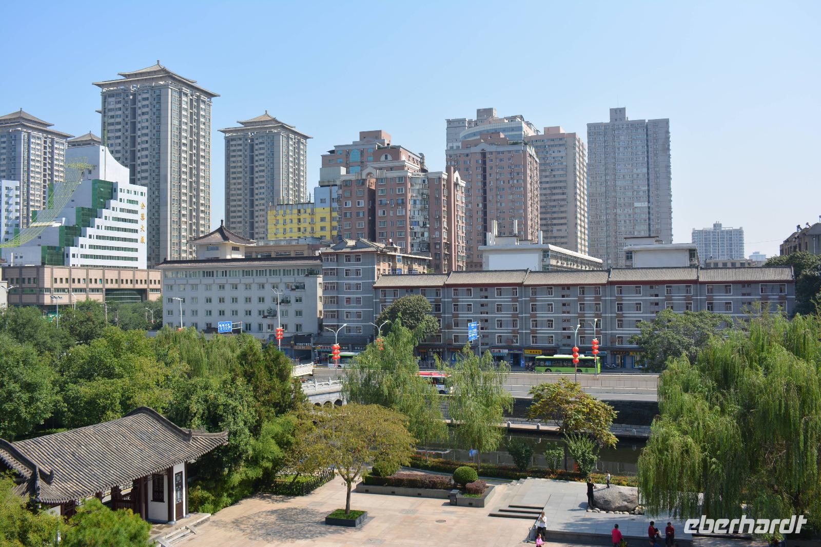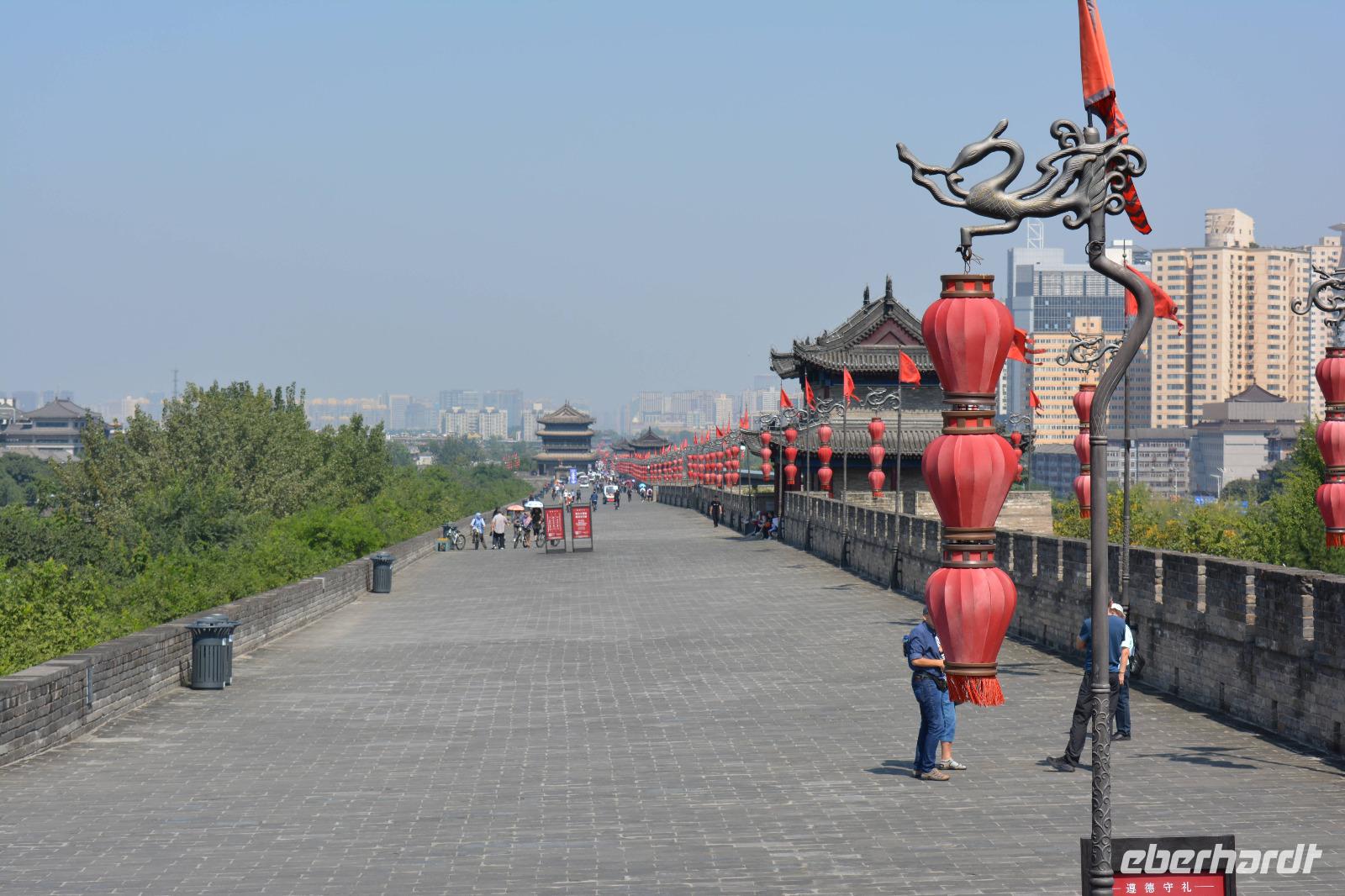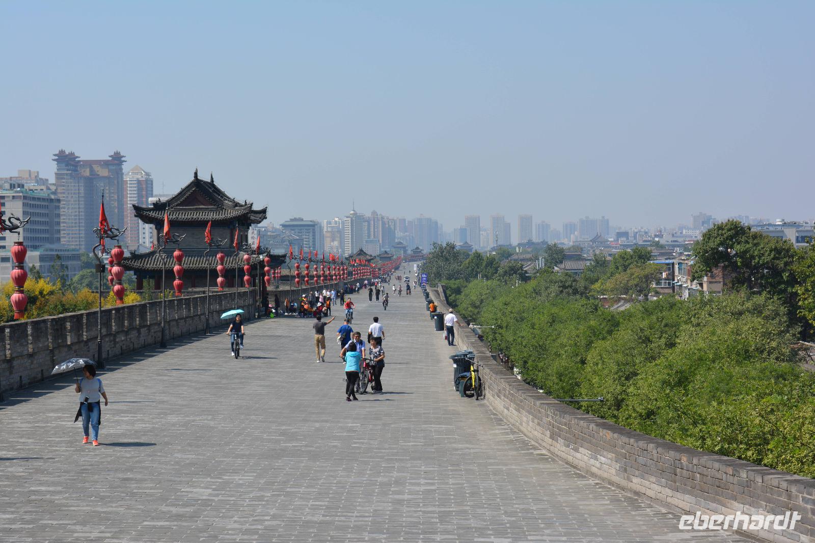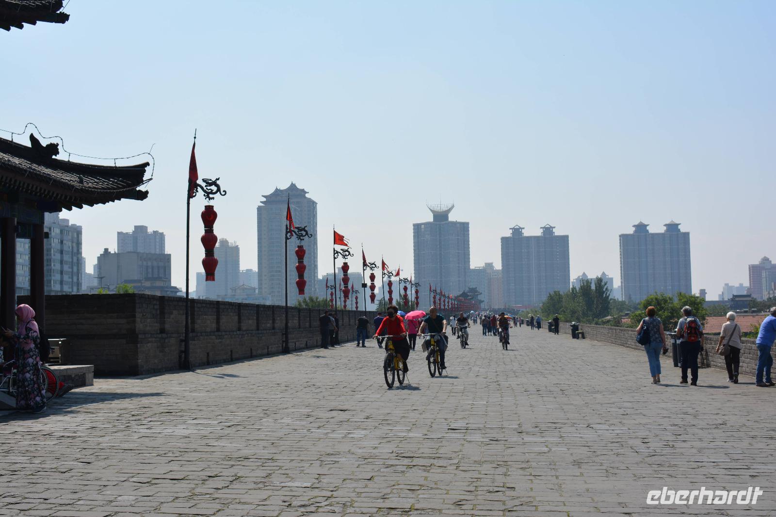 Nach dem Programm im Park wollen wir uns nun die Stadtmauer von Xi'an ansehen. Diese ist 14 km lang und führt um die historische Innenstadt. Man kann sie mit dem Fahrrad erfahren oder man lässt sich vom Elektromobil chauffieren. Uns reicht jedoch ein kurzer Spaziergang. Außerhalb der Mauer bestimmen vor allem viele Wolkenkratzer das Bild der Stadt.