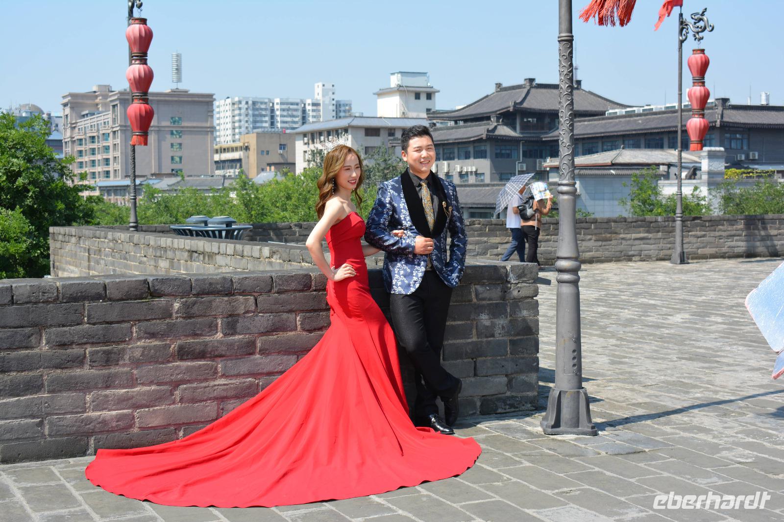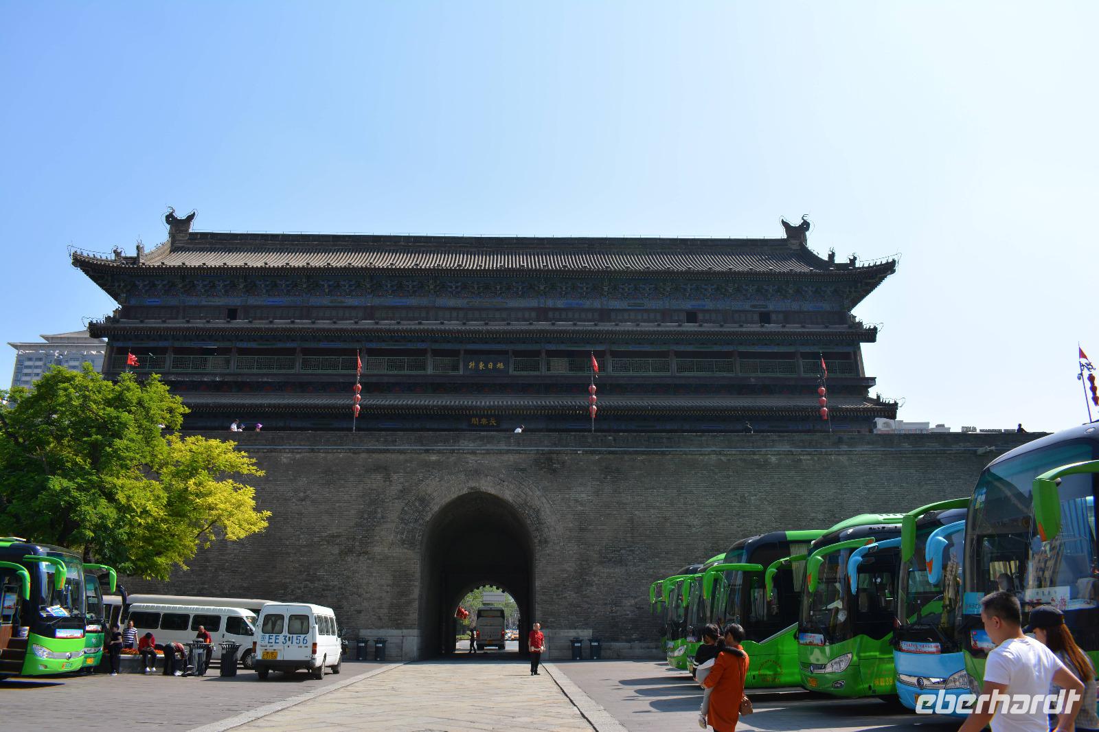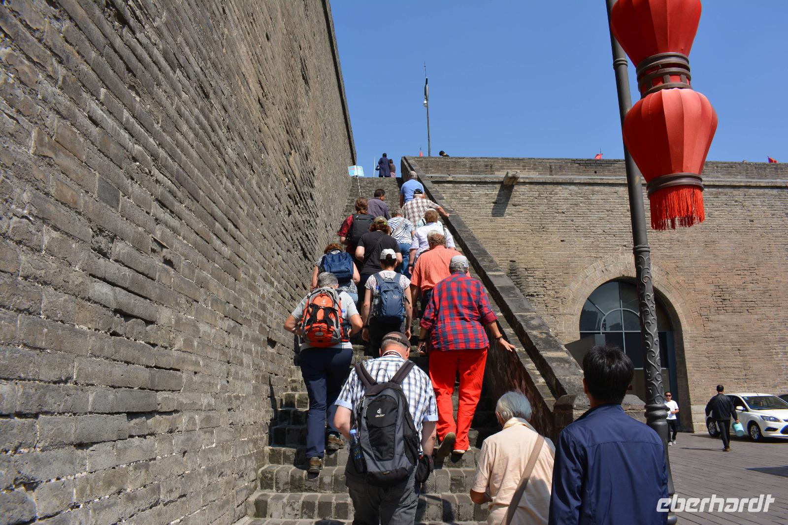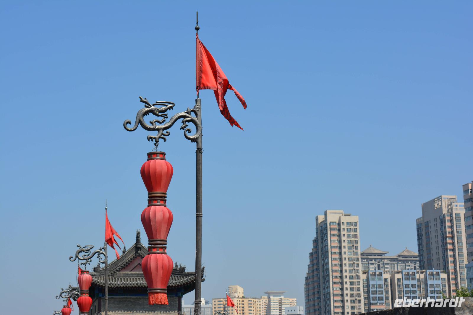 Nach dem Programm im Park wollen wir uns nun die Stadtmauer von Xi'an ansehen. Diese ist 14 km lang und führt um die historische Innenstadt. Man kann sie mit dem Fahrrad erfahren oder man lässt sich vom Elektromobil chauffieren. Uns reicht jedoch ein kurzer Spaziergang. Außerhalb der Mauer bestimmen vor allem viele Wolkenkratzer das Bild der Stadt.