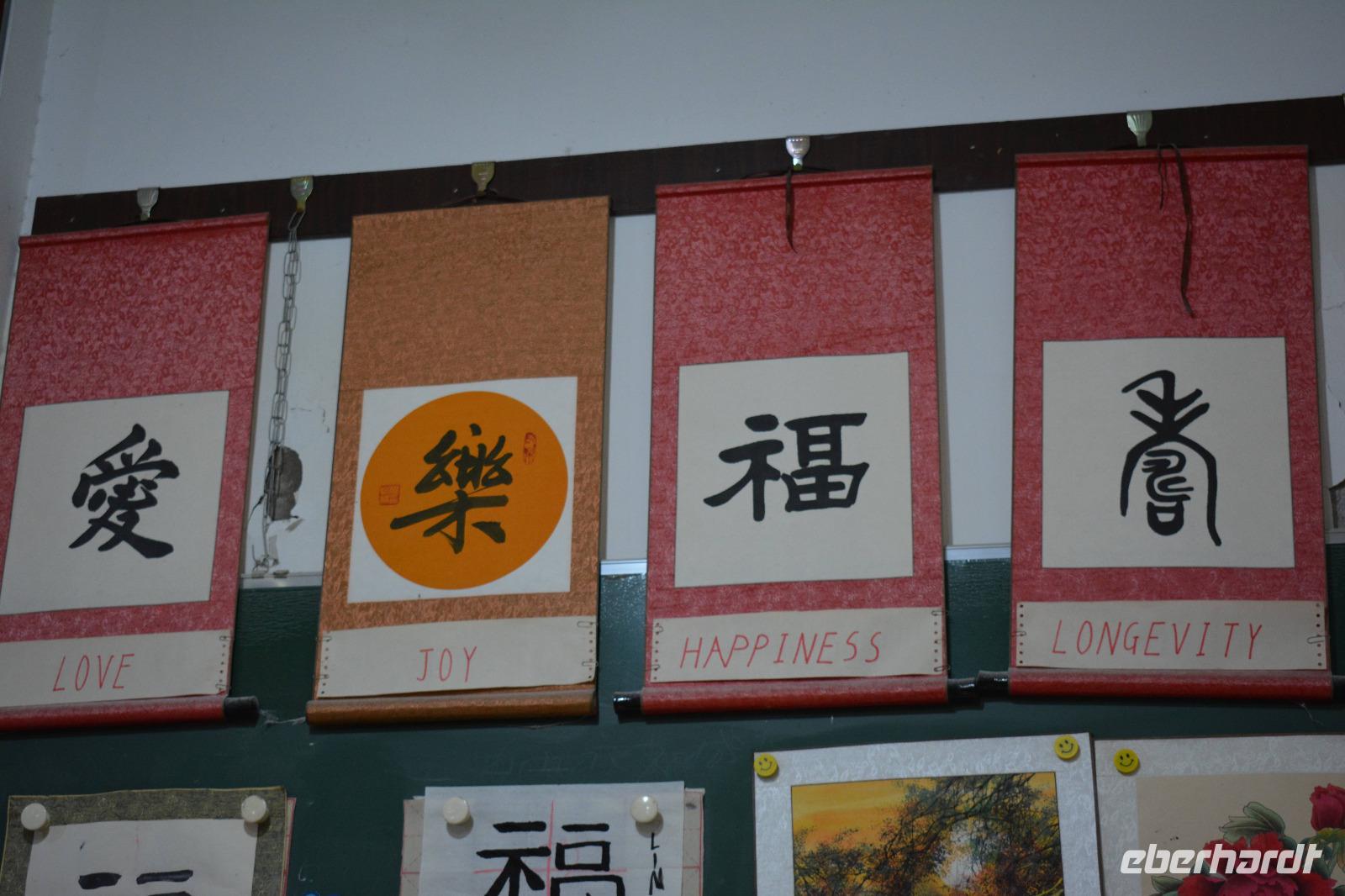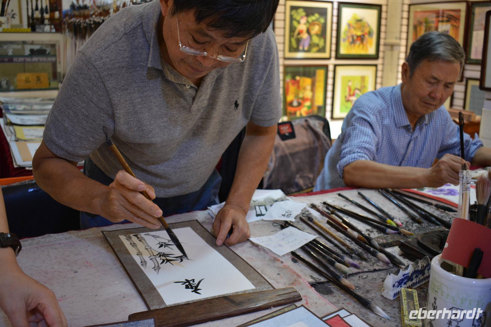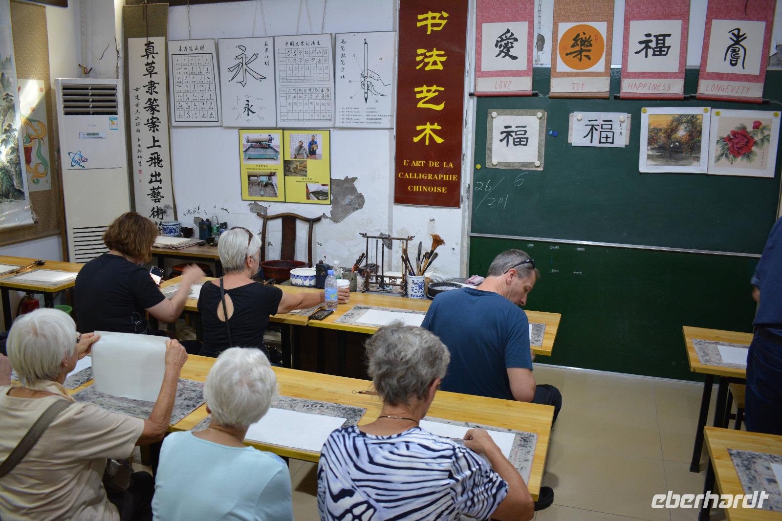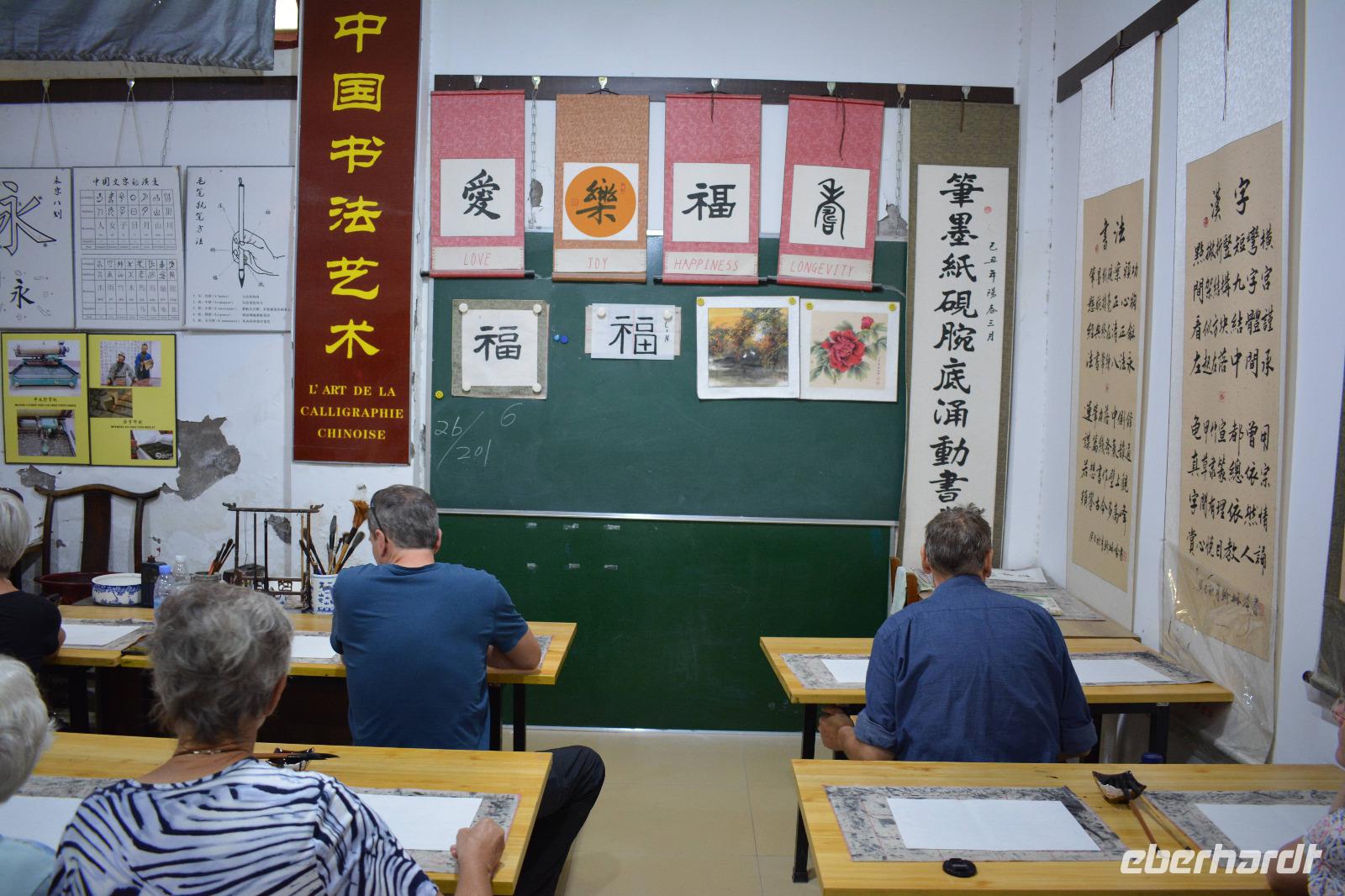 Auch am Nachmittag sind wir sehr gediegen unterwegs. Wir halten an einem Park, hier steht die kleine Wildganspagode, welche gar nicht mal so klein aussieht und vom Stadtbaum, der Akazie, sowie Bambus und Rosen umgeben ist. Als erstes erwartet uns hier eine Unterrichtsstunde zum Thema „chinesische Zeichen". Die Lehrerin erklärt uns, dass es 201 Zeichen gibt, welche als Art Alphabet gelten und die Kinder alle Zeichen innerhalb von sechs Jahren lernen. Wir dürfen mit Pinsel und Tinte auf ein Stück Reispapier das Wort „Glück" kalligraphieren. Das gelingt allen sehr gut. Außerdem hat jeder die Möglichkeit seinen eigenen Namen in chinesischen Schriftzeichen zu erwerben.