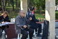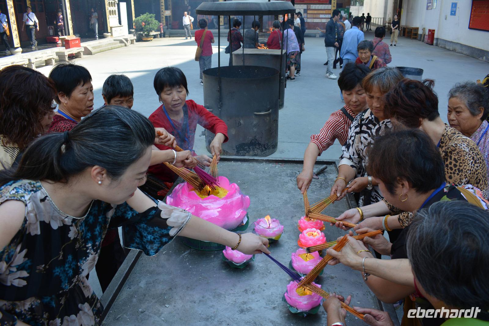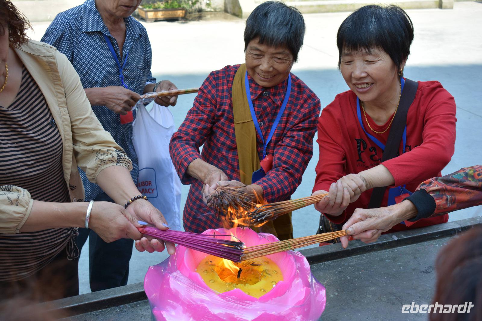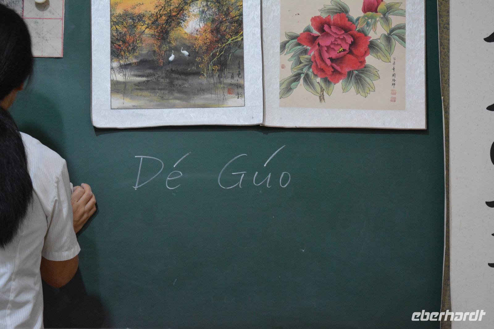 Auch am Nachmittag sind wir sehr gediegen unterwegs. Wir halten an einem Park, hier steht die kleine Wildganspagode, welche gar nicht mal so klein aussieht und vom Stadtbaum, der Akazie, sowie Bambus und Rosen umgeben ist. Als erstes erwartet uns hier eine Unterrichtsstunde zum Thema „chinesische Zeichen". Die Lehrerin erklärt uns, dass es 201 Zeichen gibt, welche als Art Alphabet gelten und die Kinder alle Zeichen innerhalb von sechs Jahren lernen. Wir dürfen mit Pinsel und Tinte auf ein Stück Reispapier das Wort „Glück" kalligraphieren. Das gelingt allen sehr gut. Außerdem hat jeder die Möglichkeit seinen eigenen Namen in chinesischen Schriftzeichen zu erwerben.
