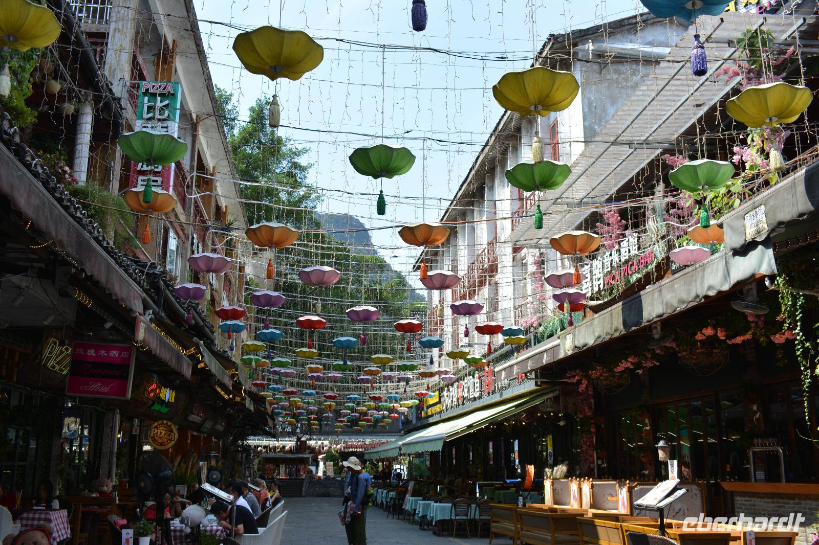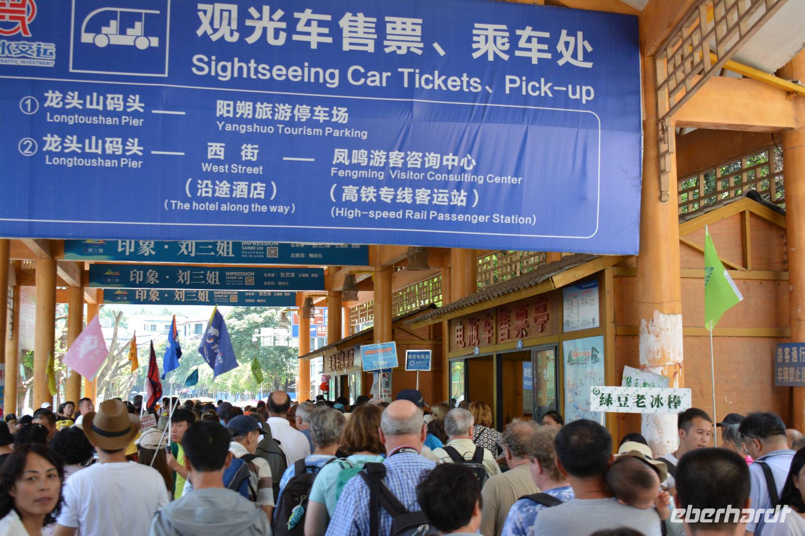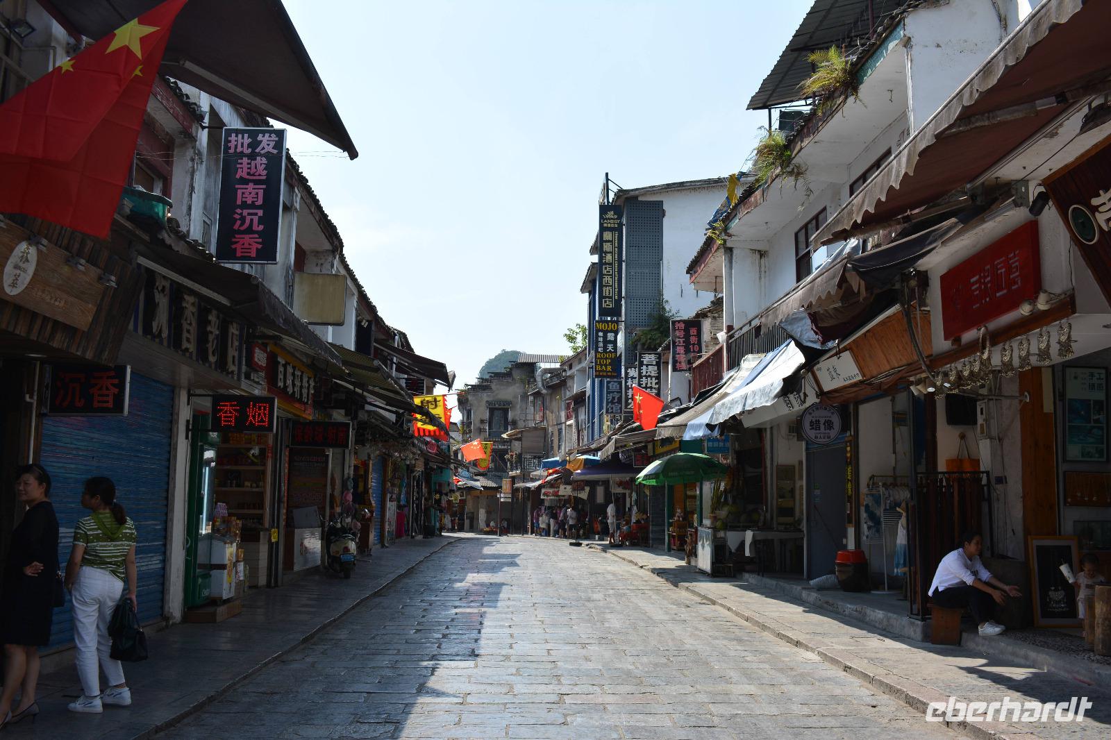 Heute lassen wir es etwas ruhiger angehen. Im Dunkeln sind wir in unserem Hotel angekommen, umso größer ist die Überraschung beim morgendlichen Blick aus dem Fenster. Nicht weit entfernt, bestimmen bereits die Karstberge das Landschaftsbild. Nach dem Frühstück wollen wir uns diese näher betrachten. Mit dem Bus geht es zum nahe gelegenen Bootsanleger und wir starten unsere vierstündige Tour mitten durch die schöne Natur. Unseren Zielort Yangshou erreichen wir zum frühen Nachmittag. Circa 20 Millionen Touristen kommen jährlich in dieses 600.00 Einwohner große Dorf. Wir laufen entlang der Halo- und der Weststraße, welche vom Tourismus geprägt sind. Am Abend werden einige von uns hierher zurückkehren, um die West-Straße am Abend zu erleben. Hier gibt es dann viele Menschen, volle Restaurants, laute Musik und Ladenbesitzer, die Ihre Ware übers Mikrofon anpreisen. Der Rest der Gruppe geht, zusammen mit Reiseleiter Deng, zum Theater. Auf einer großen Seebühne, direkt vor einigen Karstbergen, stellen rund 600 Schauspieler, das Leben der Südchinesen und ihrer Minderheiten vor. Die Gruppe verbringt einen schönen Abend und ist dankbar für ein wenig Ruhe nach den ereignisreichen Tagen.