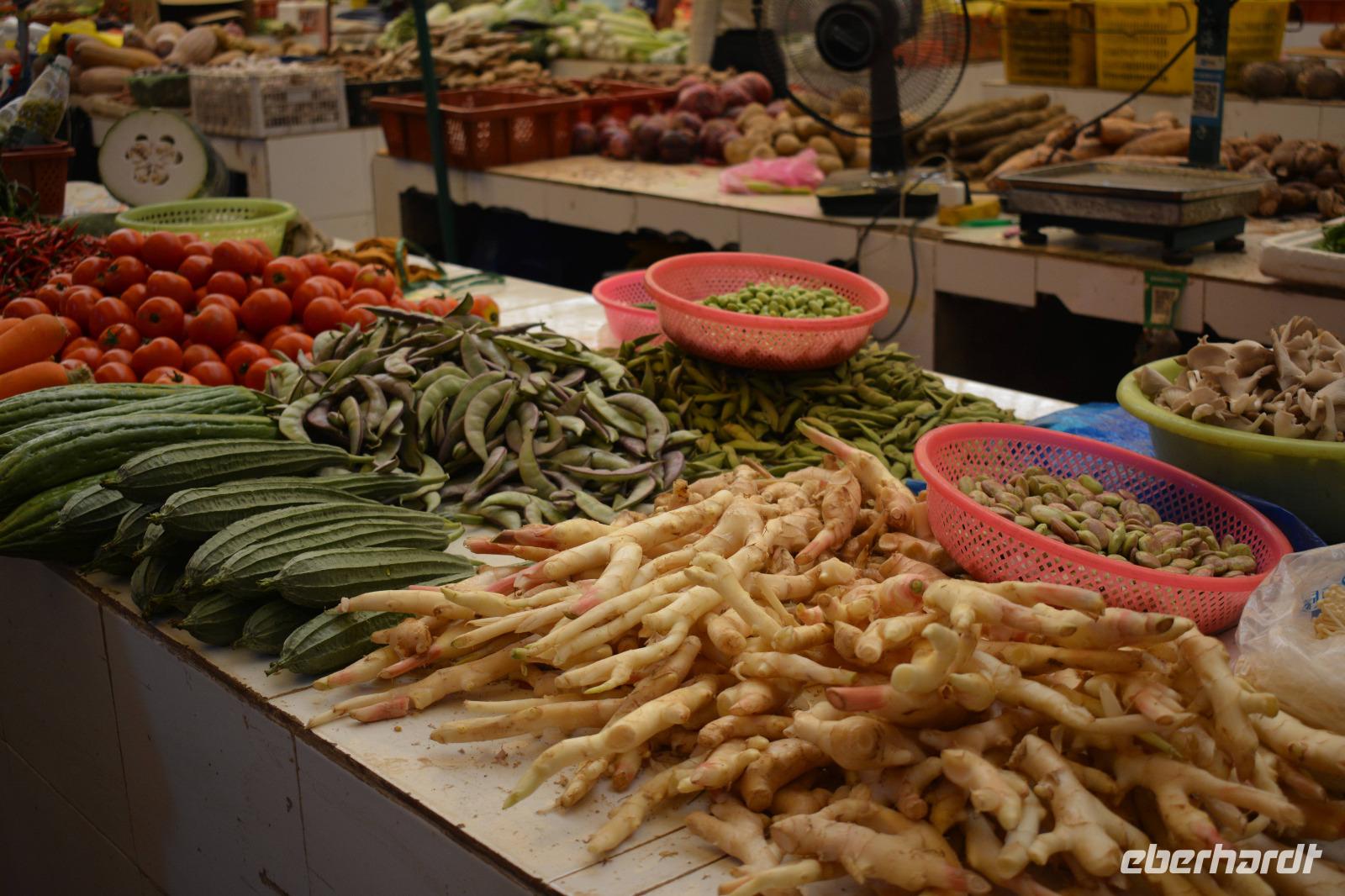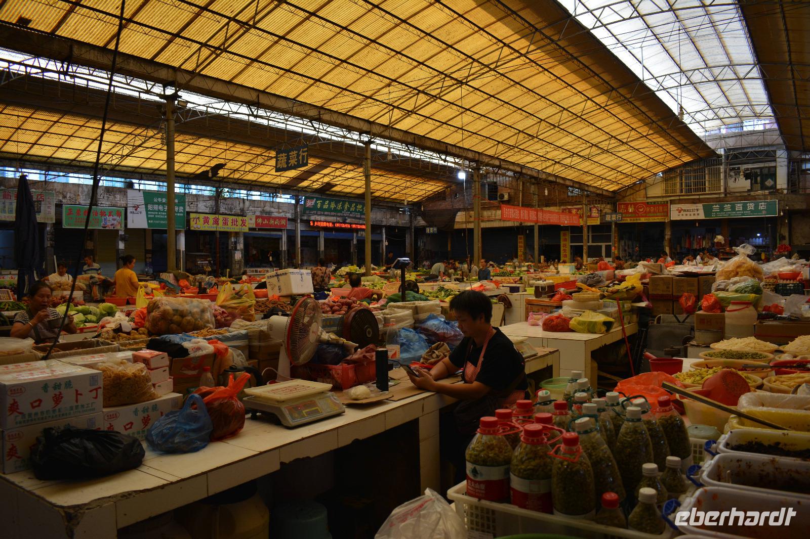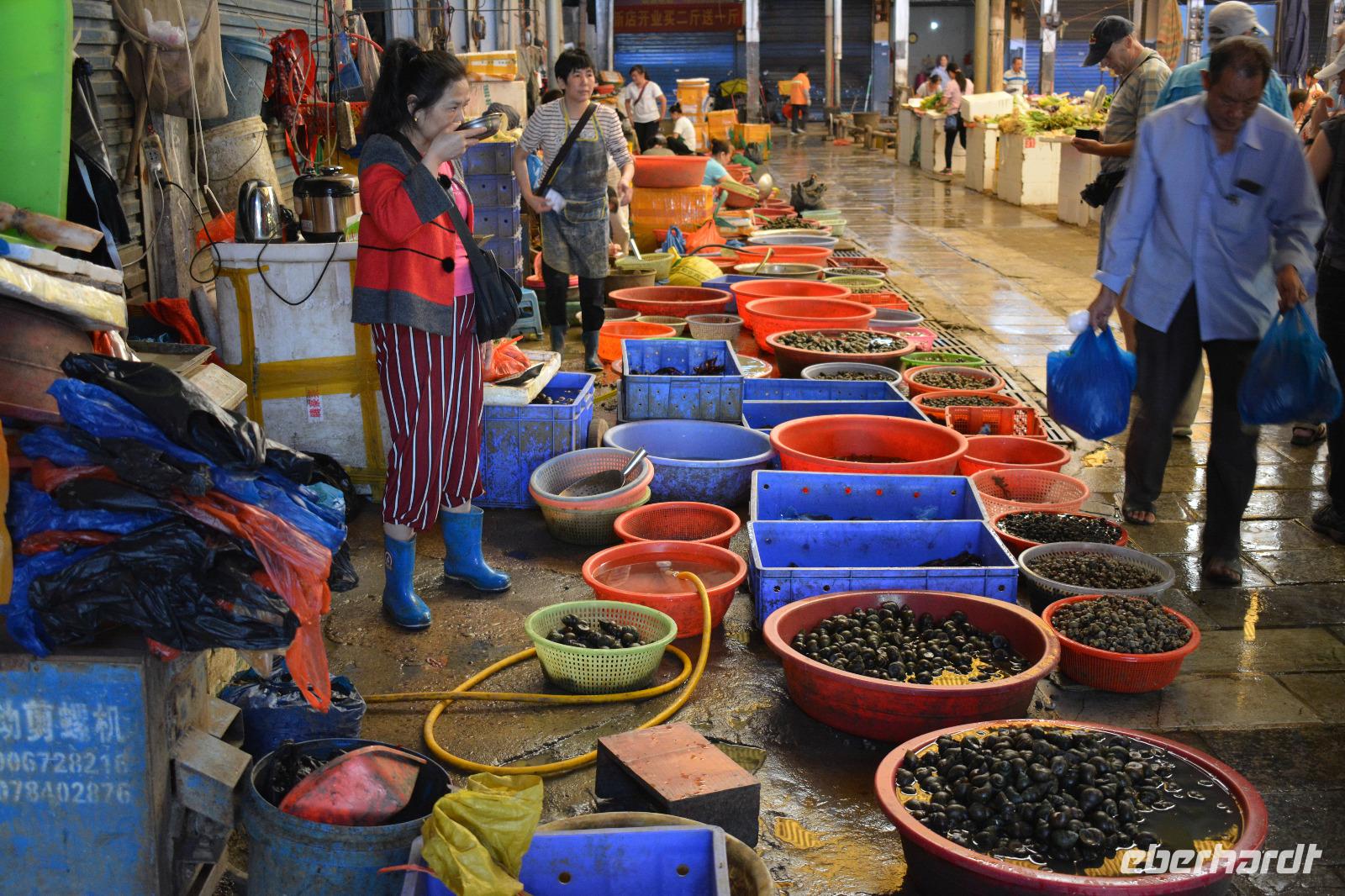 Wir fahren als erstes wieder zur West-Straße um ein wenig zu bummeln. Deng zeigt uns noch einen typischen Markt. Hier können die einheimischen alles bekommen was sie möchten. Die Südchinesen sagen auch: „Wir essen alles was schwimmen kann, außer Schiffe- alles was fliegen kann, außer Flugzeuge und alles, was Beine hat, außer Tische und Stühle." Genau davon können wir uns auf diesem Markt überzeugen. Der Weg über die West-Straße ist da deutlich harmloser, hier gibt es Tee, Süßigkeiten und viele weitere Souvenirs.