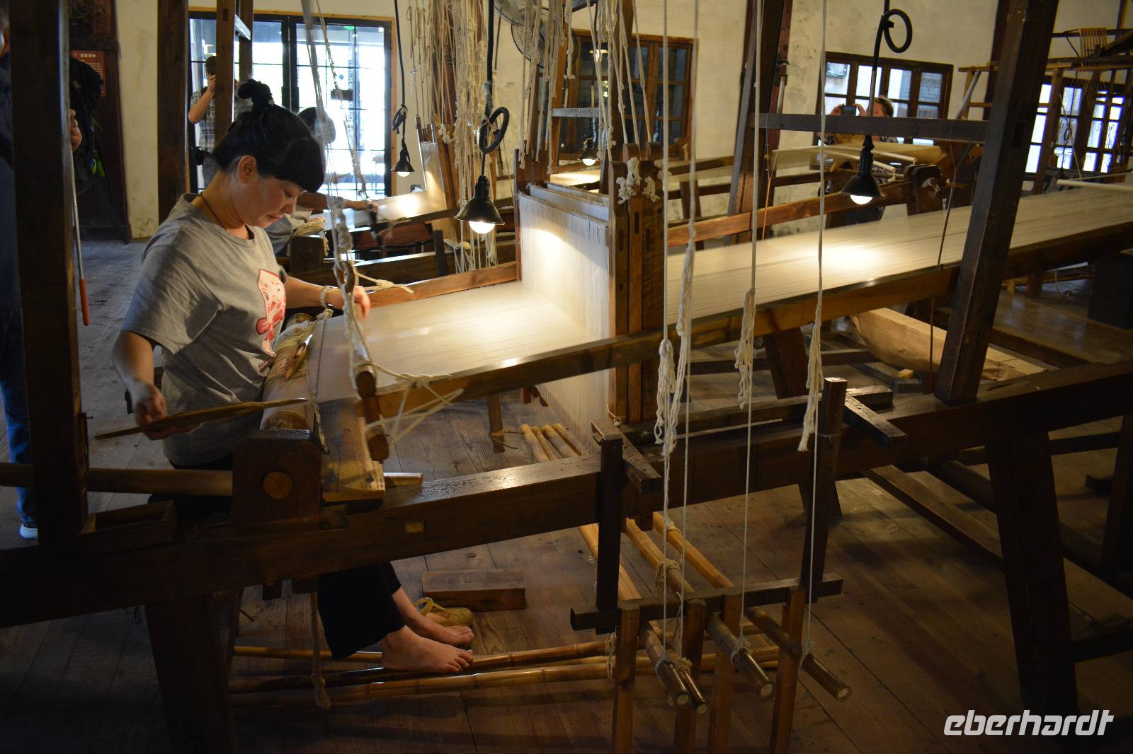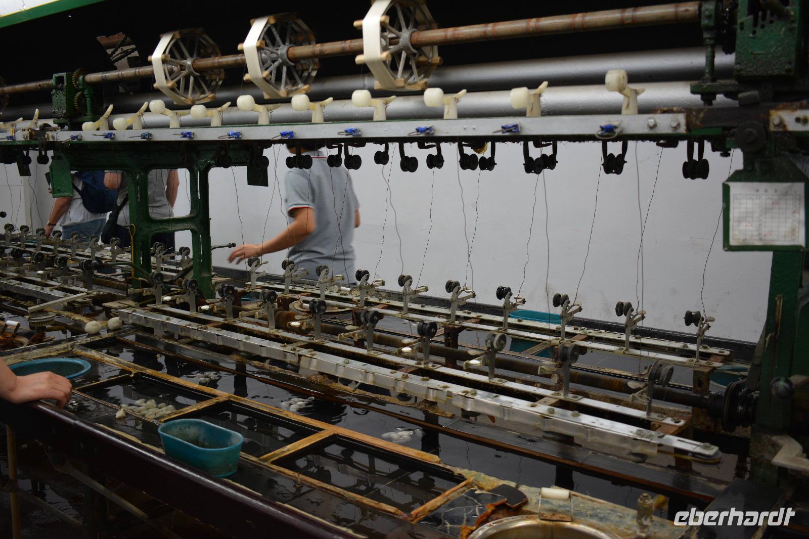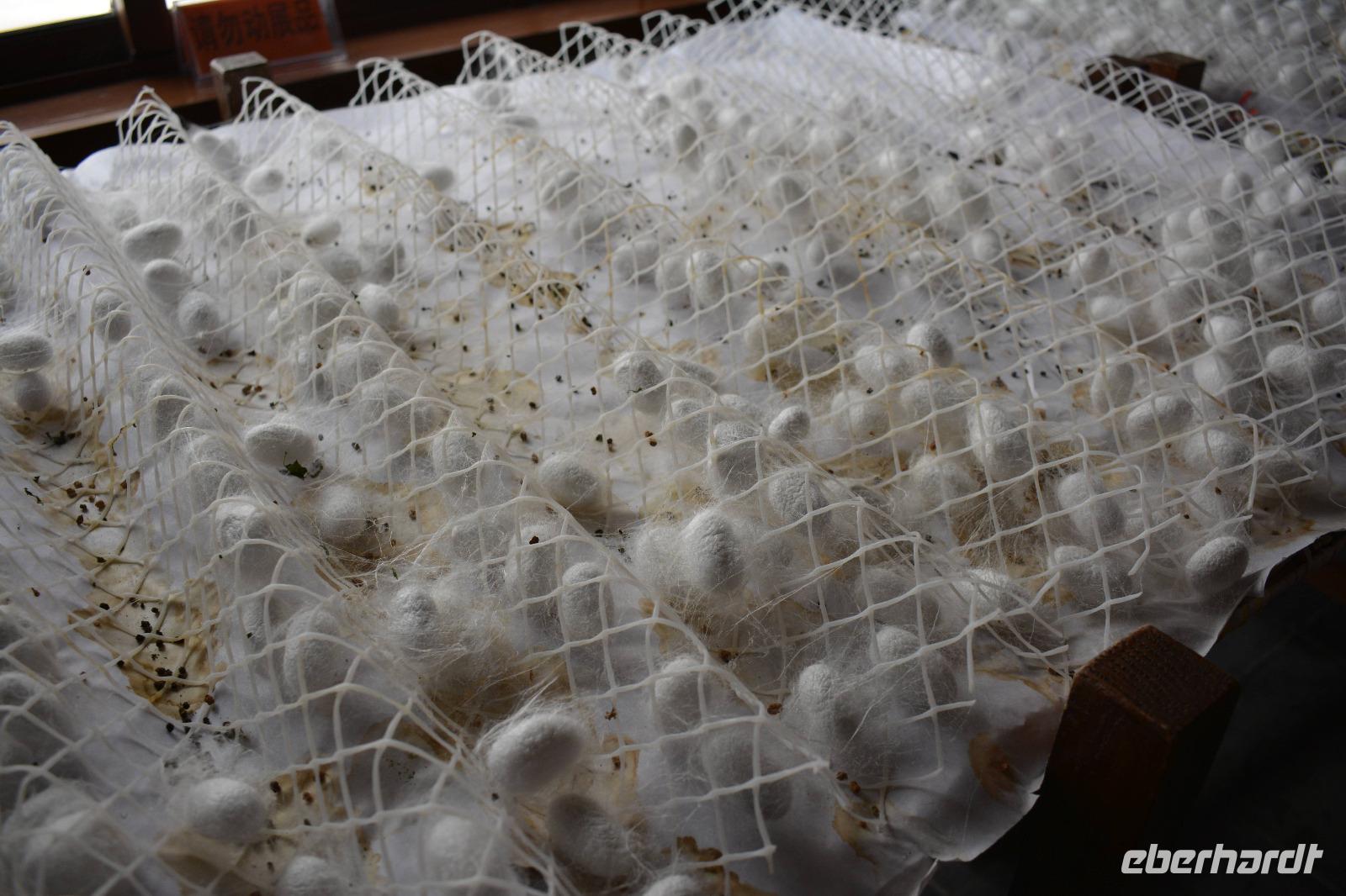 Gleich im Anschluss geht es zum nächsten „Meister", nämlich dem Seidenspinner. Mitten in Souzhou werden in einer Fabrik Seidenraupen gezüchtet und aus ihren Kokons werden Kleidung, Bettwäsche oder auch kleine Geldbeutel hergestellt. Am beliebtesten sind natürlich die Seidenschals. Aus einem Kokon entstehen circa 900 bis 1100 Meter Seide, und acht Kokons werden zu einem Faden zusammen gesponnen. Der längste Kokon war 1600 Meter lang!