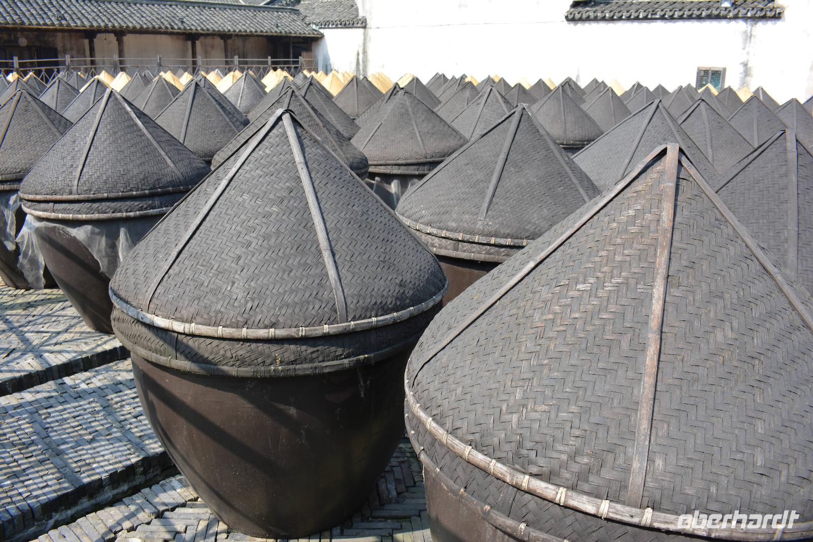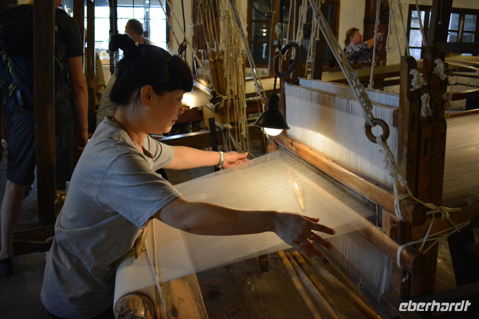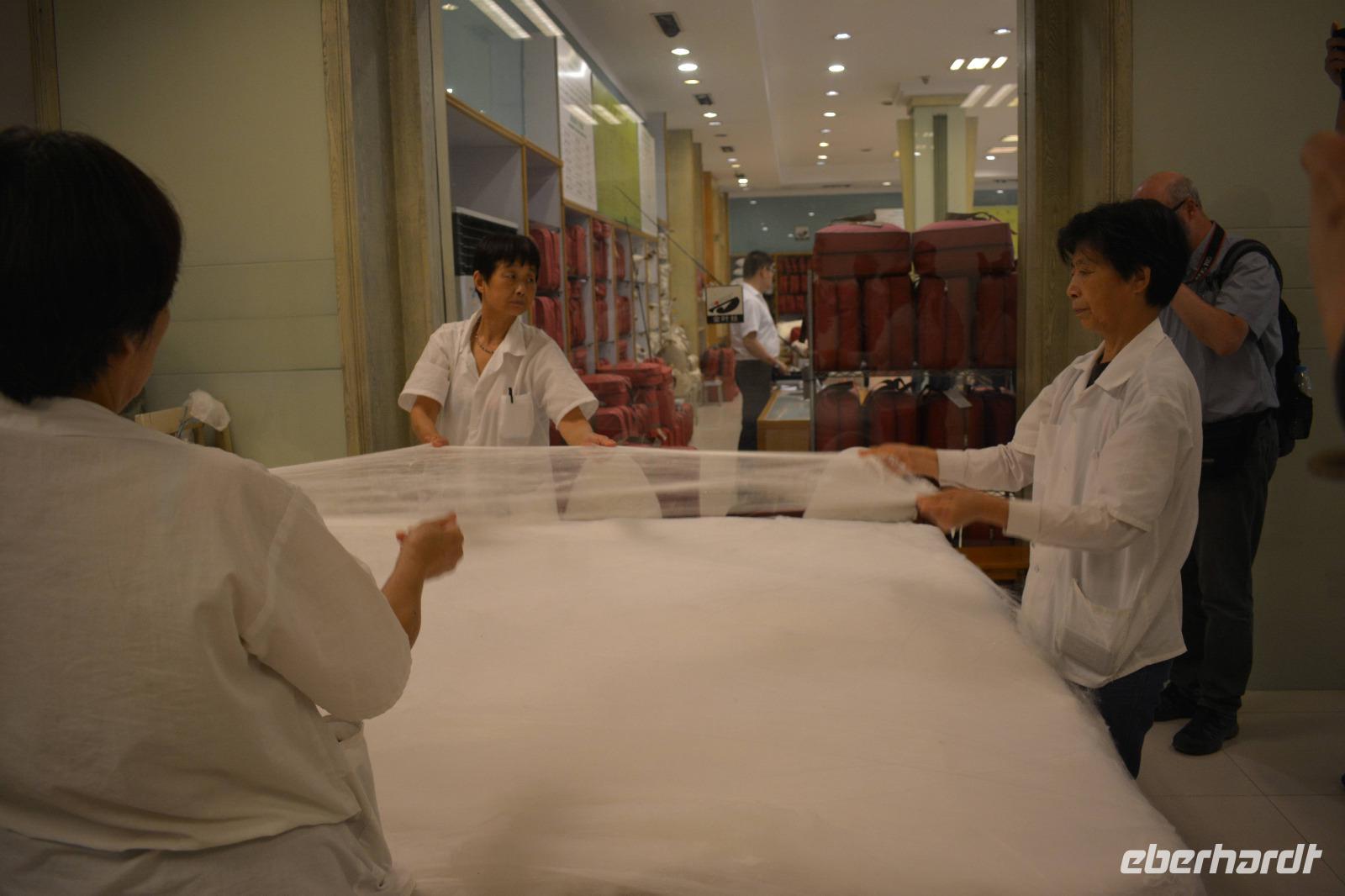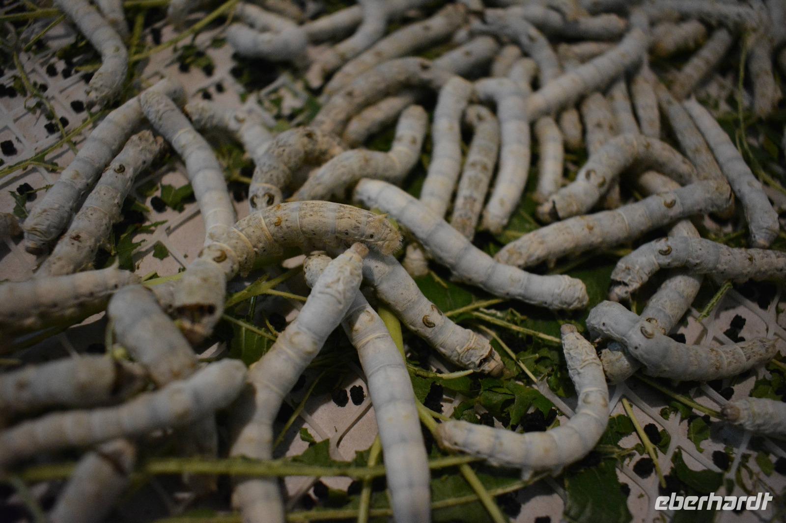 Gleich im Anschluss geht es zum nächsten „Meister", nämlich dem Seidenspinner. Mitten in Souzhou werden in einer Fabrik Seidenraupen gezüchtet und aus ihren Kokons werden Kleidung, Bettwäsche oder auch kleine Geldbeutel hergestellt. Am beliebtesten sind natürlich die Seidenschals. Aus einem Kokon entstehen circa 900 bis 1100 Meter Seide, und acht Kokons werden zu einem Faden zusammen gesponnen. Der längste Kokon war 1600 Meter lang!