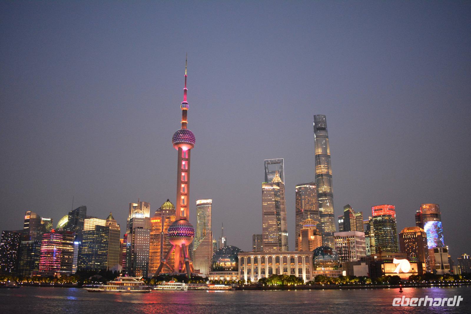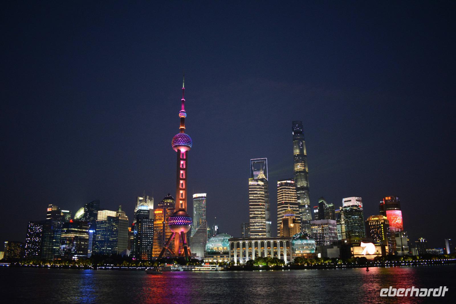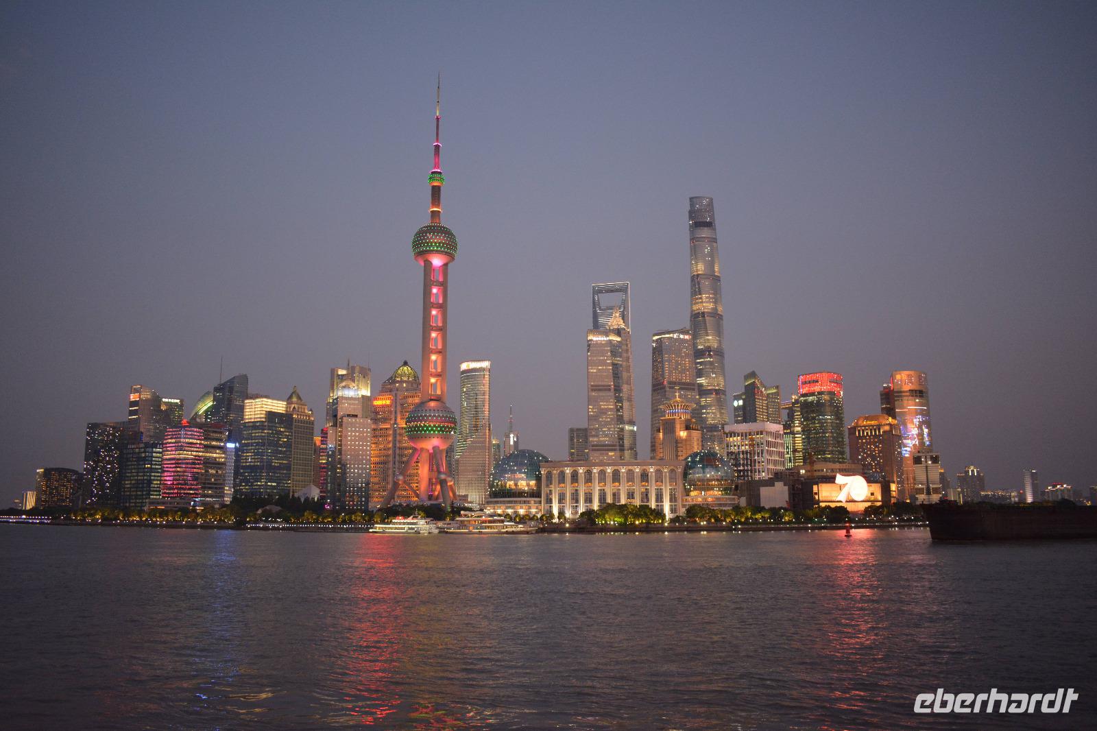 Auch wenn der Tag bereits lang war und wir schon viel gesehen haben, darf der Besuch des Bund, der Promenade von Shanghai, nicht fehlen. Und der Ausblick, der uns hier auf die Skyline östlichen Teil der Stadt gegeben wird, ist einfach unglaublich. Ein Haus überragt das andere. Besonders auffällig sind sowohl der Fernsehturm, als auch der „Flaschenöffner" und das höchste Gebäude von China, der Shanghai Tower.