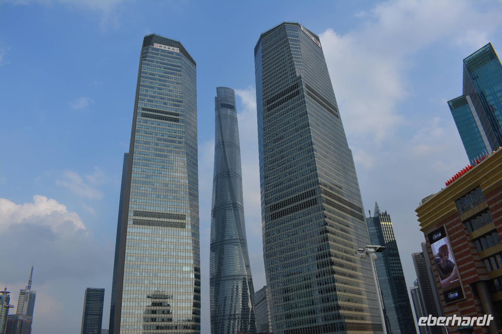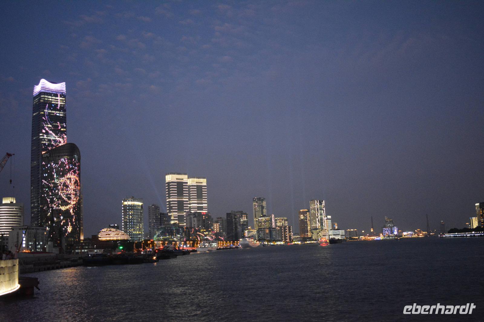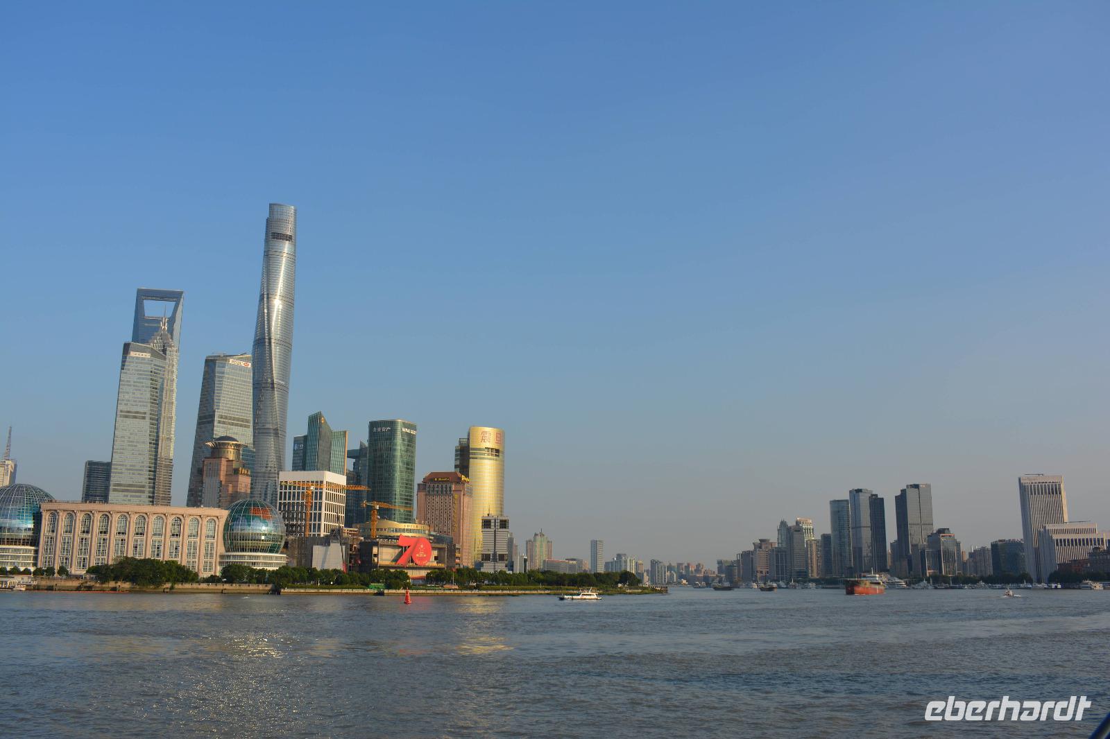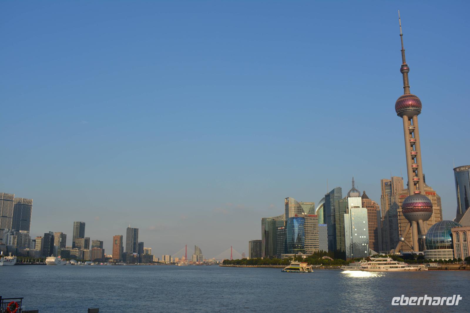 Auch wenn der Tag bereits lang war und wir schon viel gesehen haben, darf der Besuch des Bund, der Promenade von Shanghai, nicht fehlen. Und der Ausblick, der uns hier auf die Skyline östlichen Teil der Stadt gegeben wird, ist einfach unglaublich. Ein Haus überragt das andere. Besonders auffällig sind sowohl der Fernsehturm, als auch der „Flaschenöffner" und das höchste Gebäude von China, der Shanghai Tower.