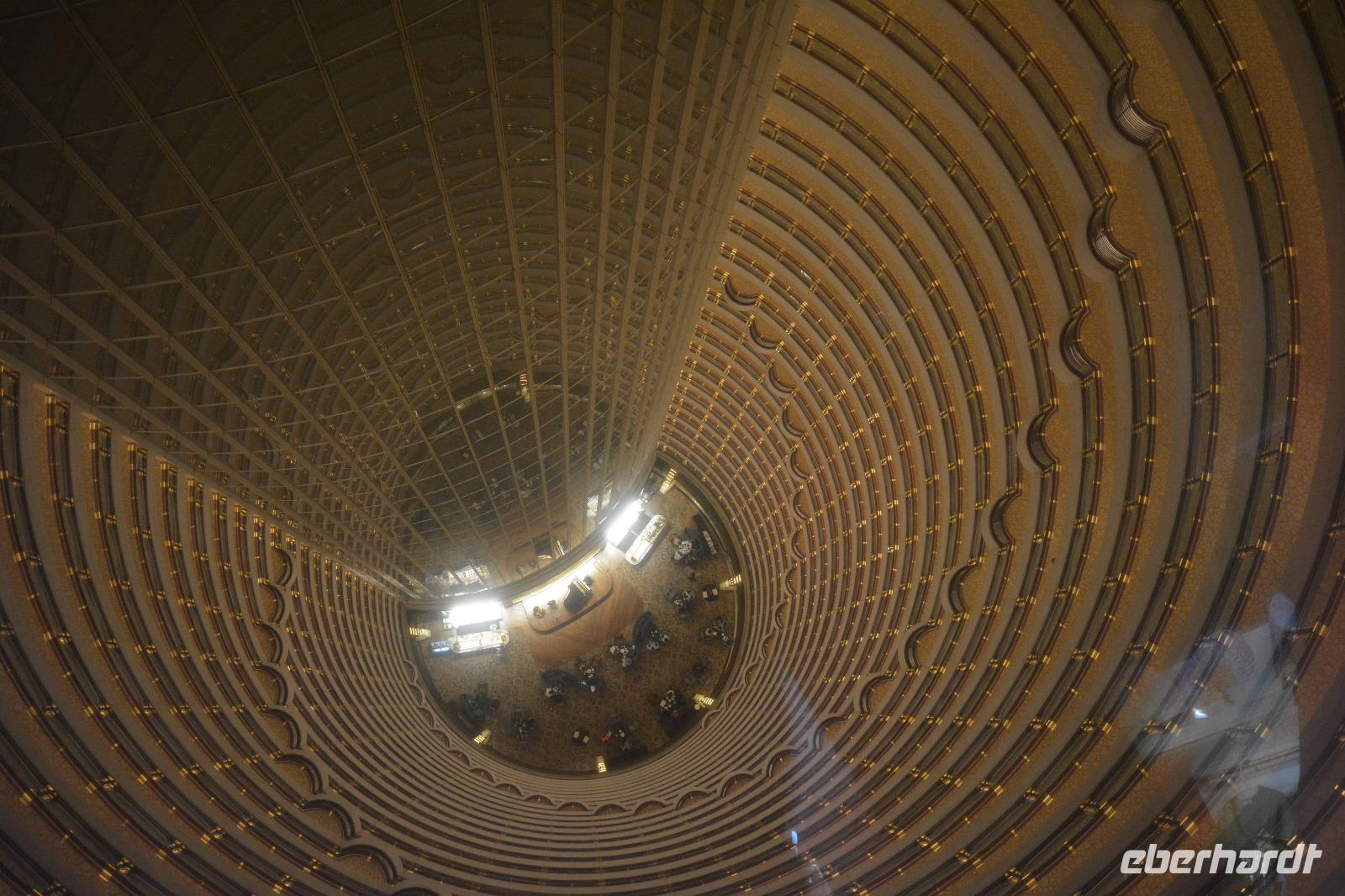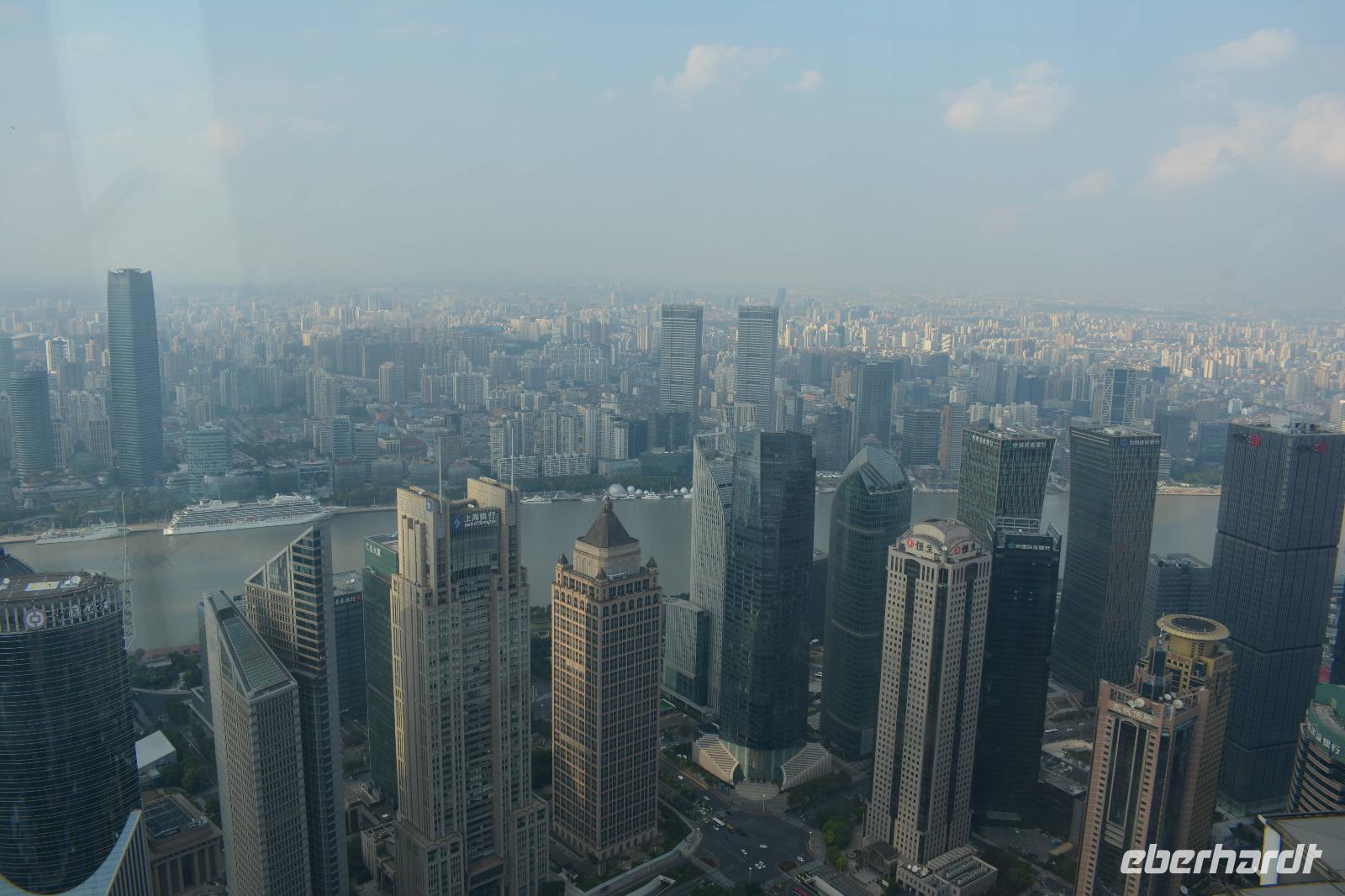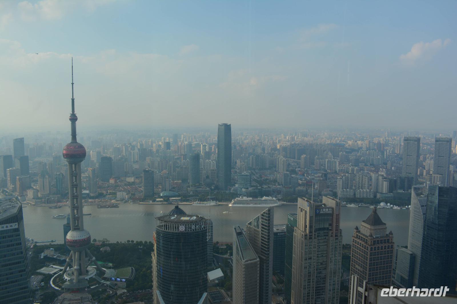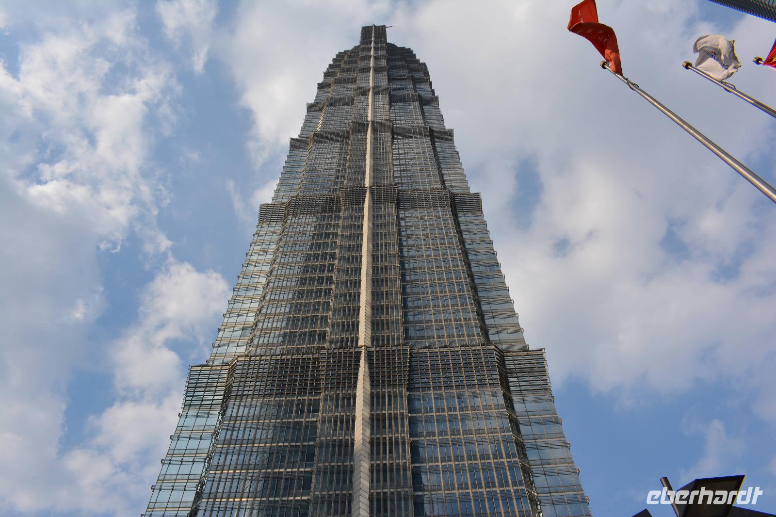 Am Nachmittag wollen wir hoch hinaus! Der Bus bringt uns in den östlichen Teil der Stadt, auf die andere Seite des Huangpu-Flusses. Mitten in die Skyline, die wir gestern nur von weitem betrachten konnten. Innerhalb von circa 50 Sekunden fahren wir den 421 Meter hohen Jin-Mao-Tower hoch. Bis in die 88 Etage und haben einen tollen Blick auf Shanghai.