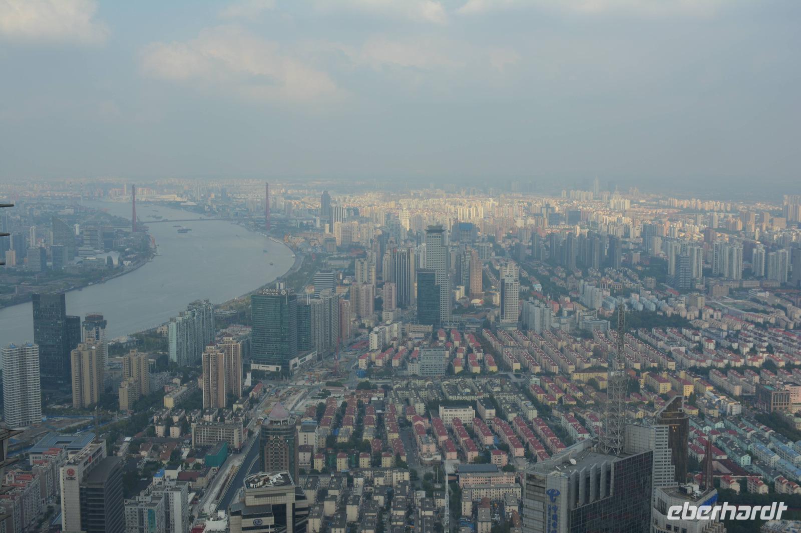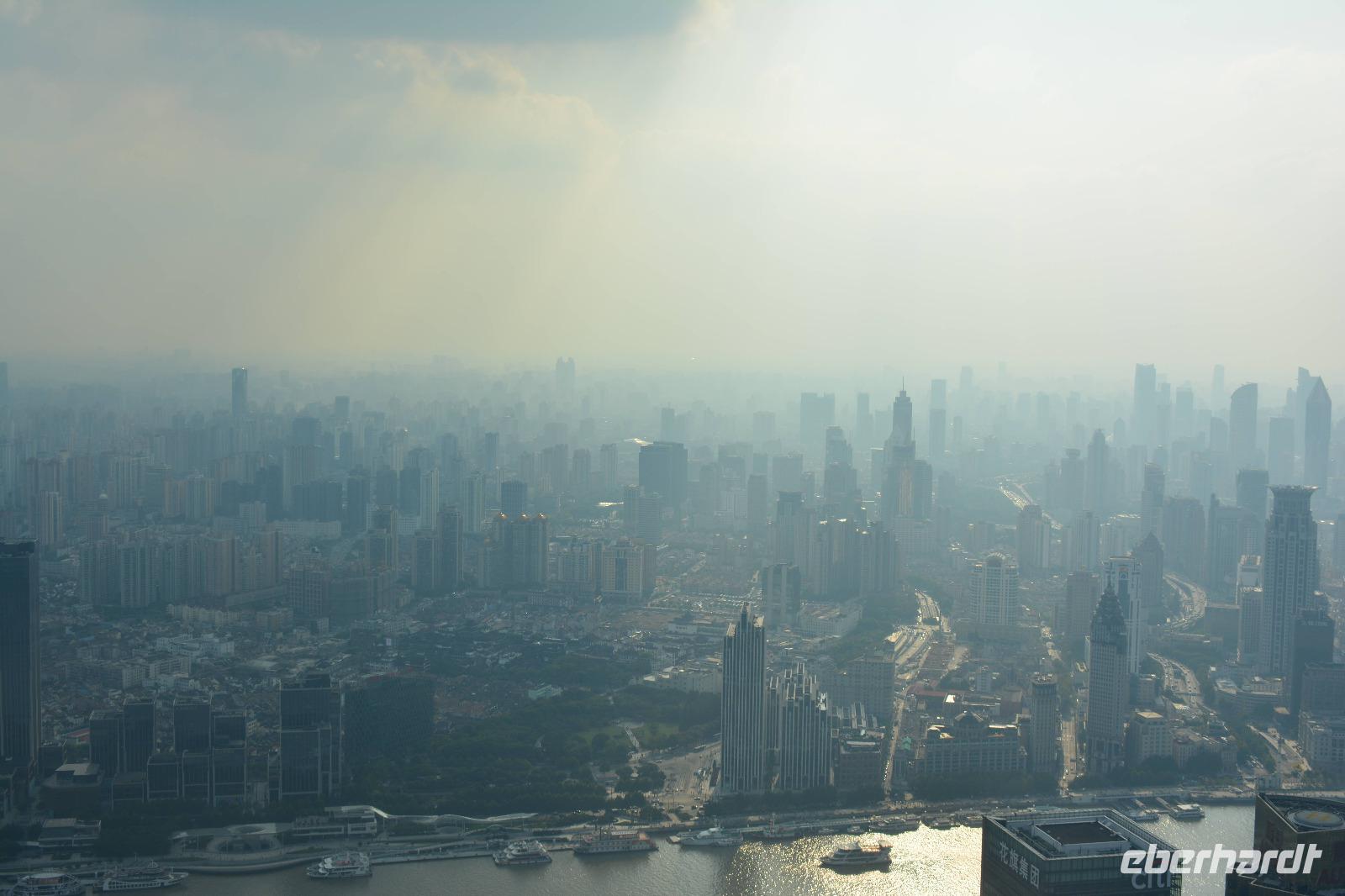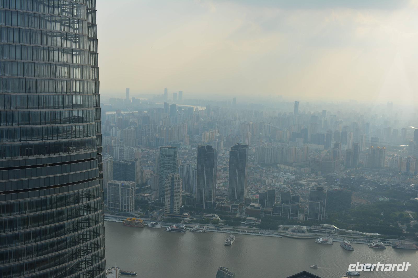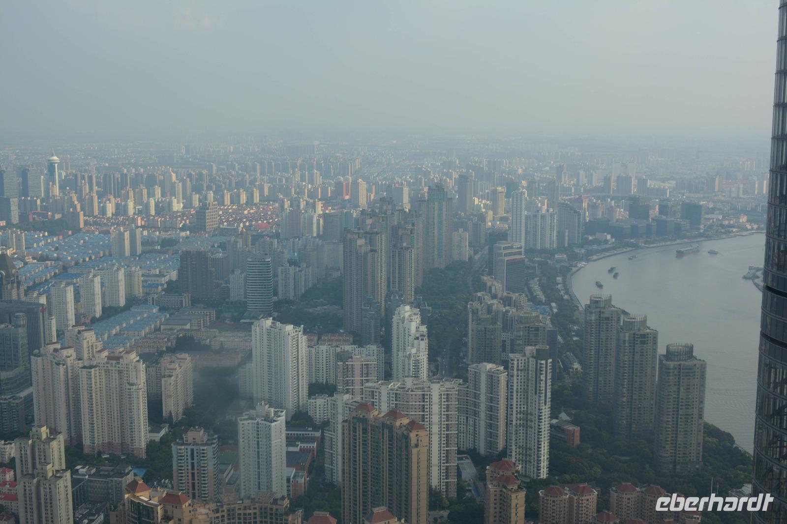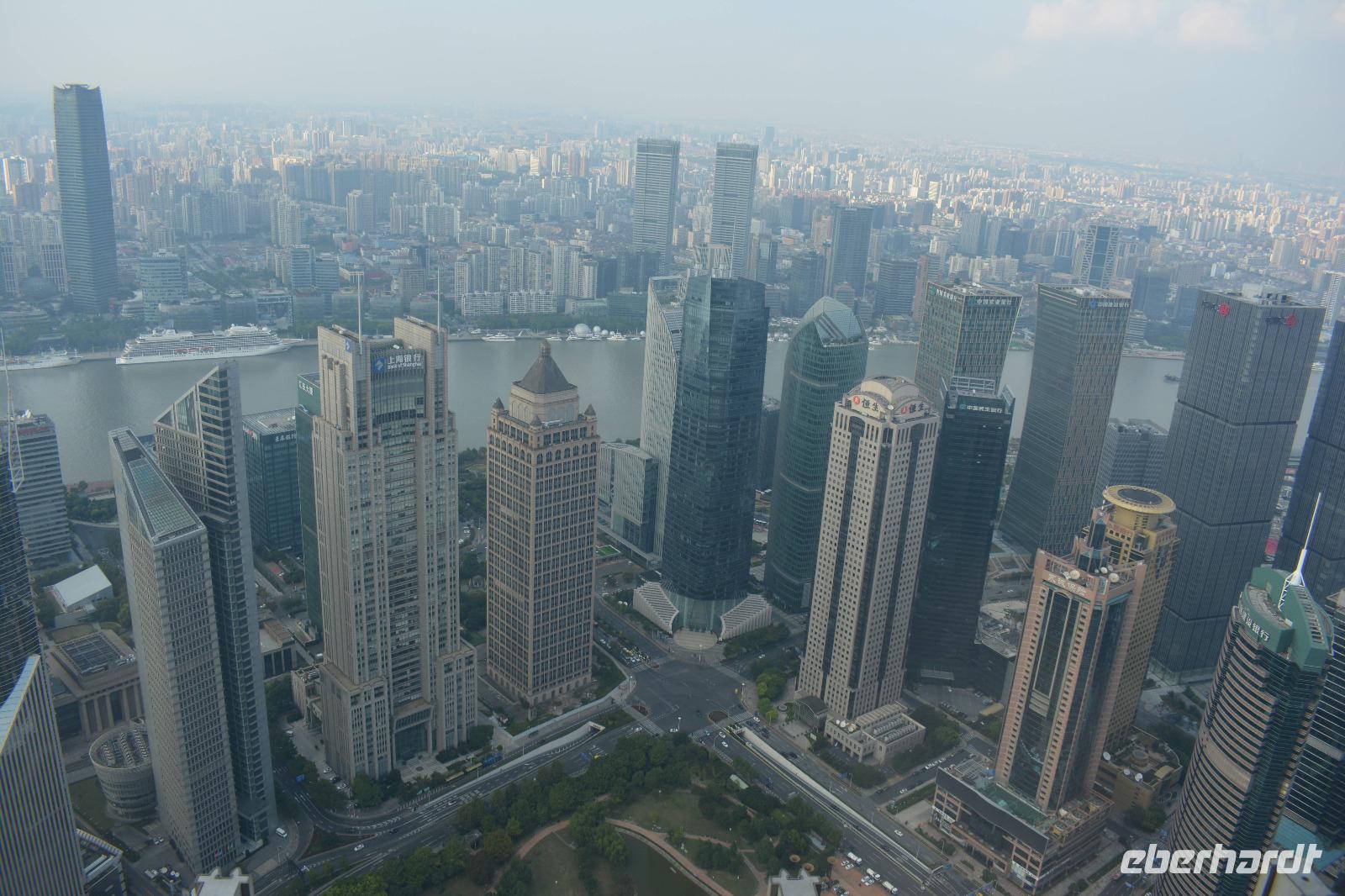 Am Nachmittag wollen wir hoch hinaus! Der Bus bringt uns in den östlichen Teil der Stadt, auf die andere Seite des Huangpu-Flusses. Mitten in die Skyline, die wir gestern nur von weitem betrachten konnten. Innerhalb von circa 50 Sekunden fahren wir den 421 Meter hohen Jin-Mao-Tower hoch. Bis in die 88 Etage und haben einen tollen Blick auf Shanghai.
