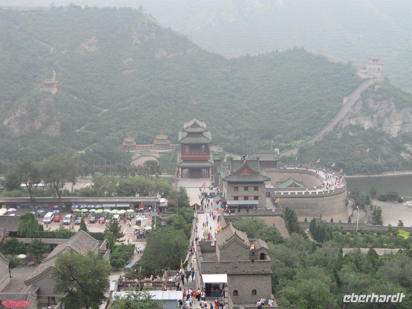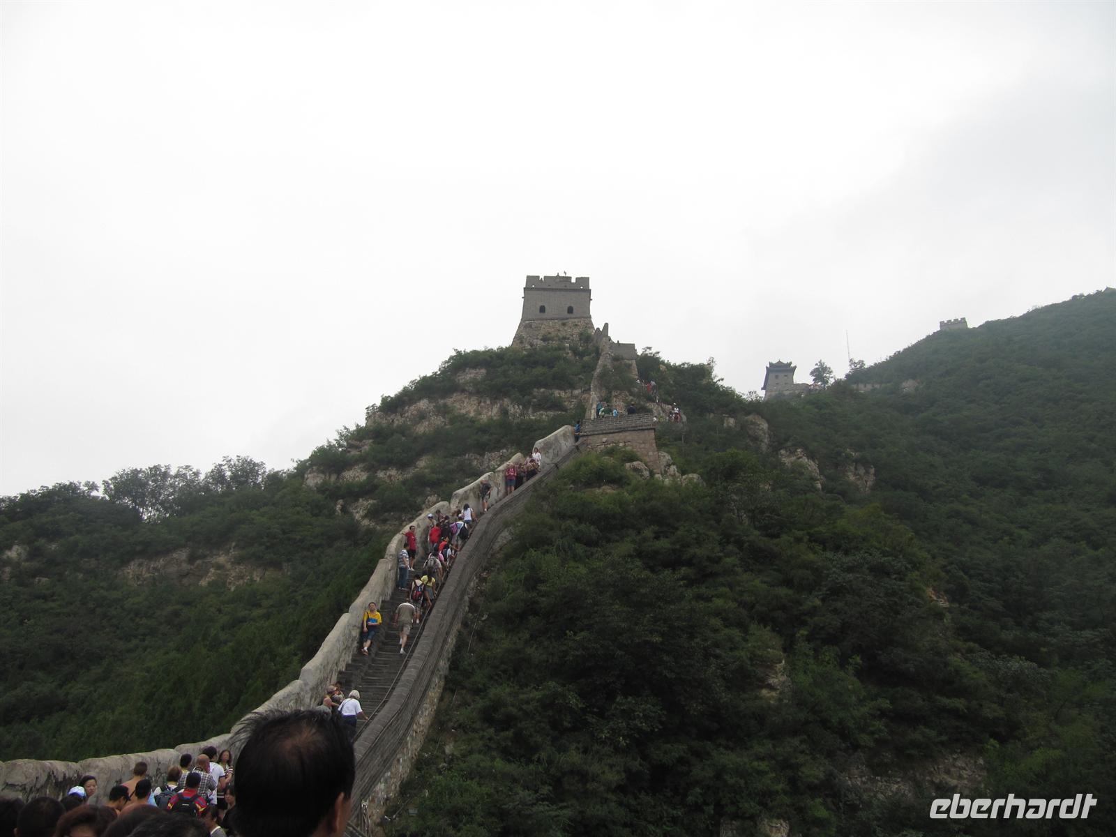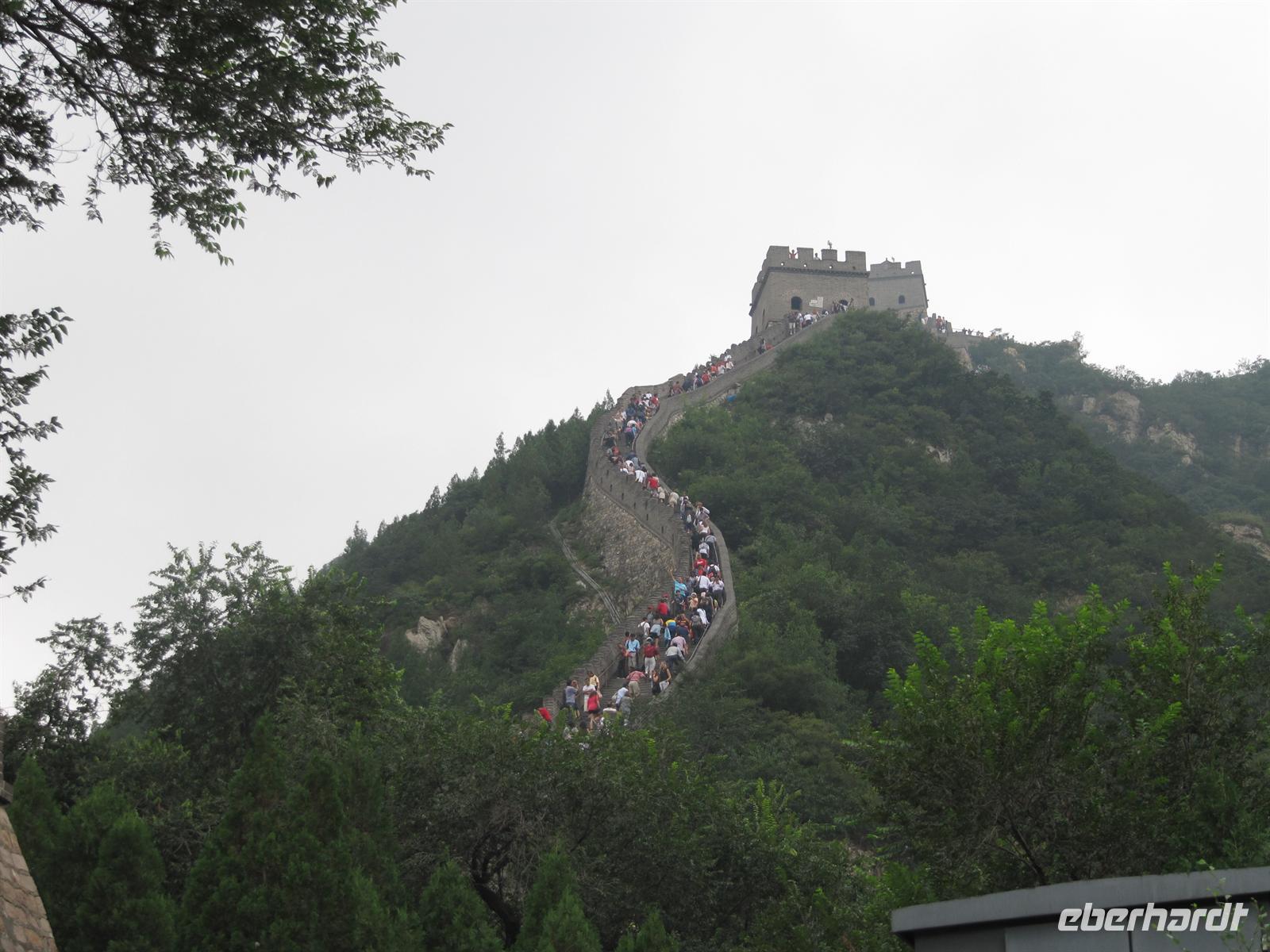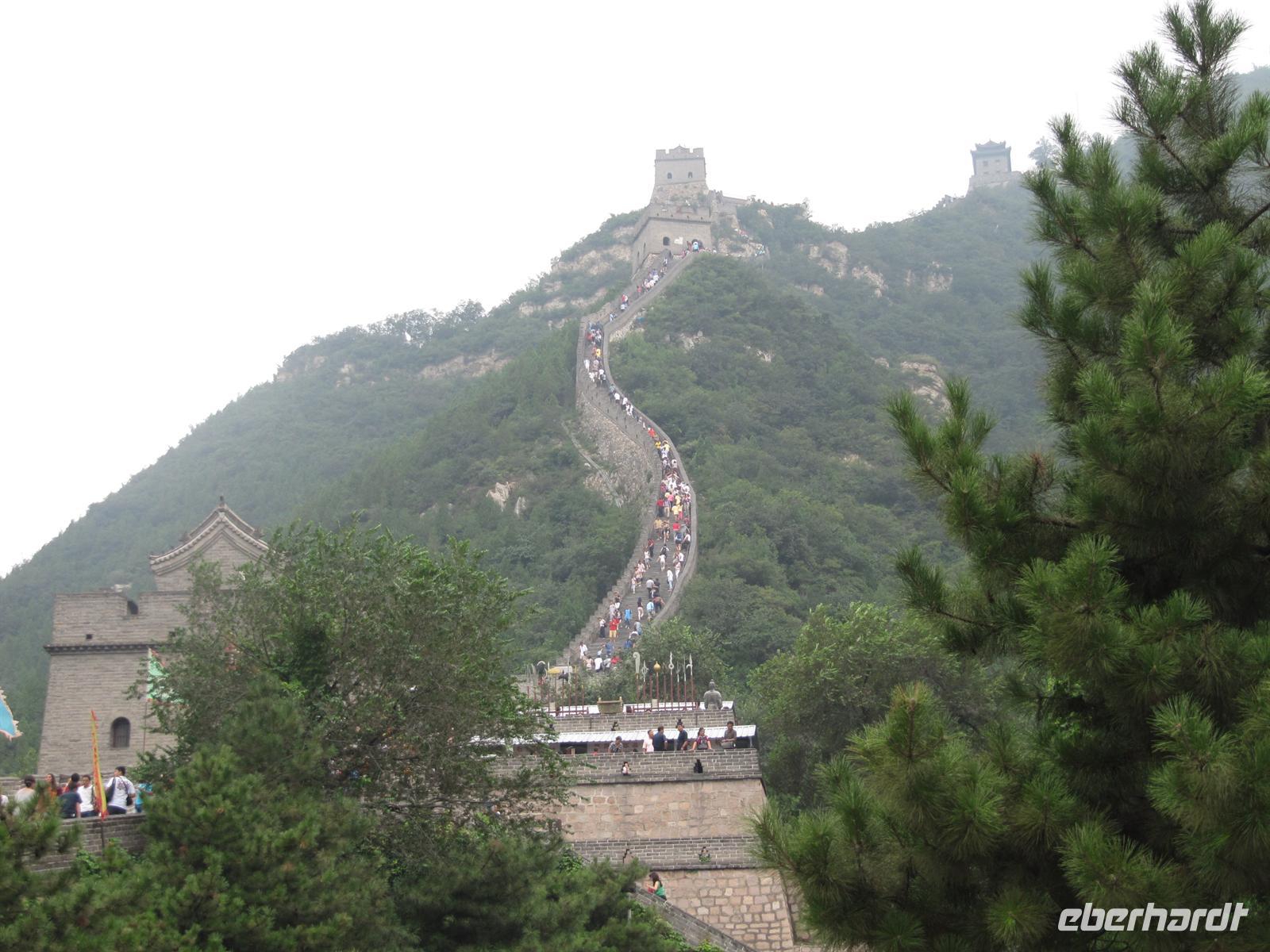 Unser nächstes Ziel ist an diesem Tag die mächtige , die sich über eine Länge von 6000 Kilometern von den Ufern des Gelben Meeres bis an den Rand der Wüste Gobi erstreckt. Sie ist ein Monument der wechselvollen Geschichte des Landes und entstand als Grenzbefestigung des chinesischen Kaiserreiches, um sich vor räuberischen nomadischen Reitervölkern zu schützen. Bevor wir uns trauen hinauf zu steigen machen wir noch ein vielleicht letztes Gruppenfoto