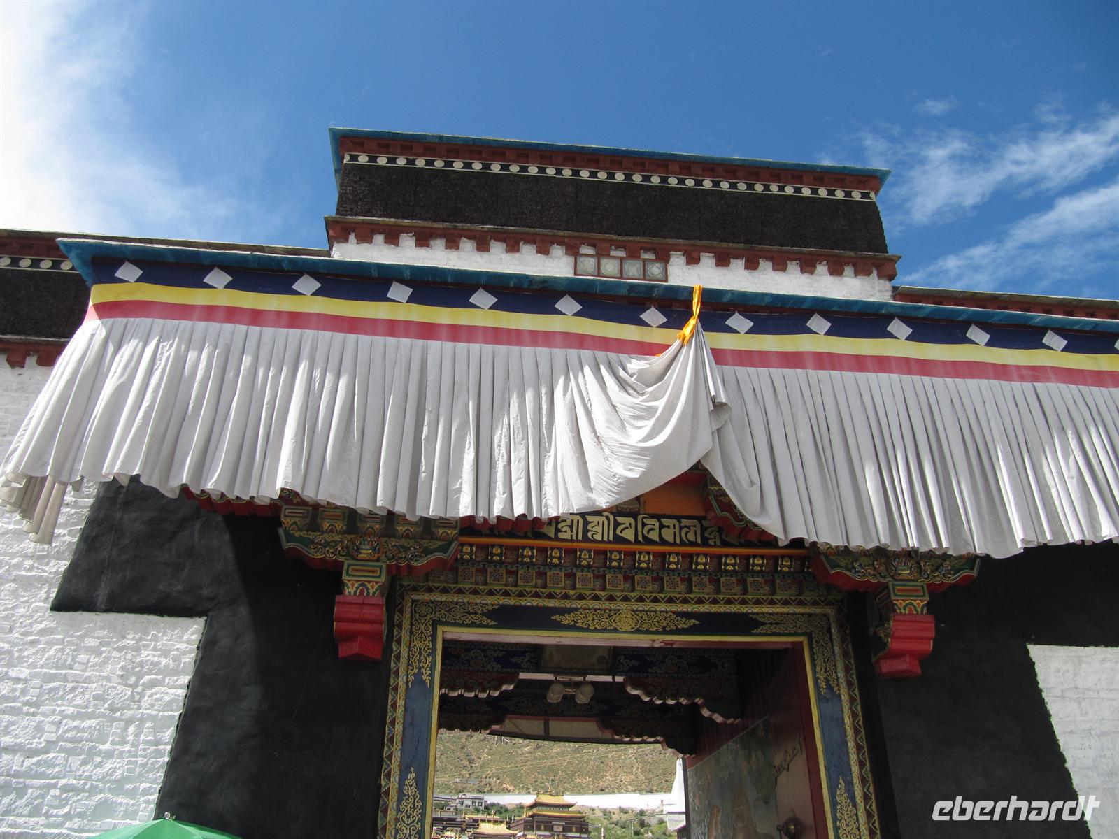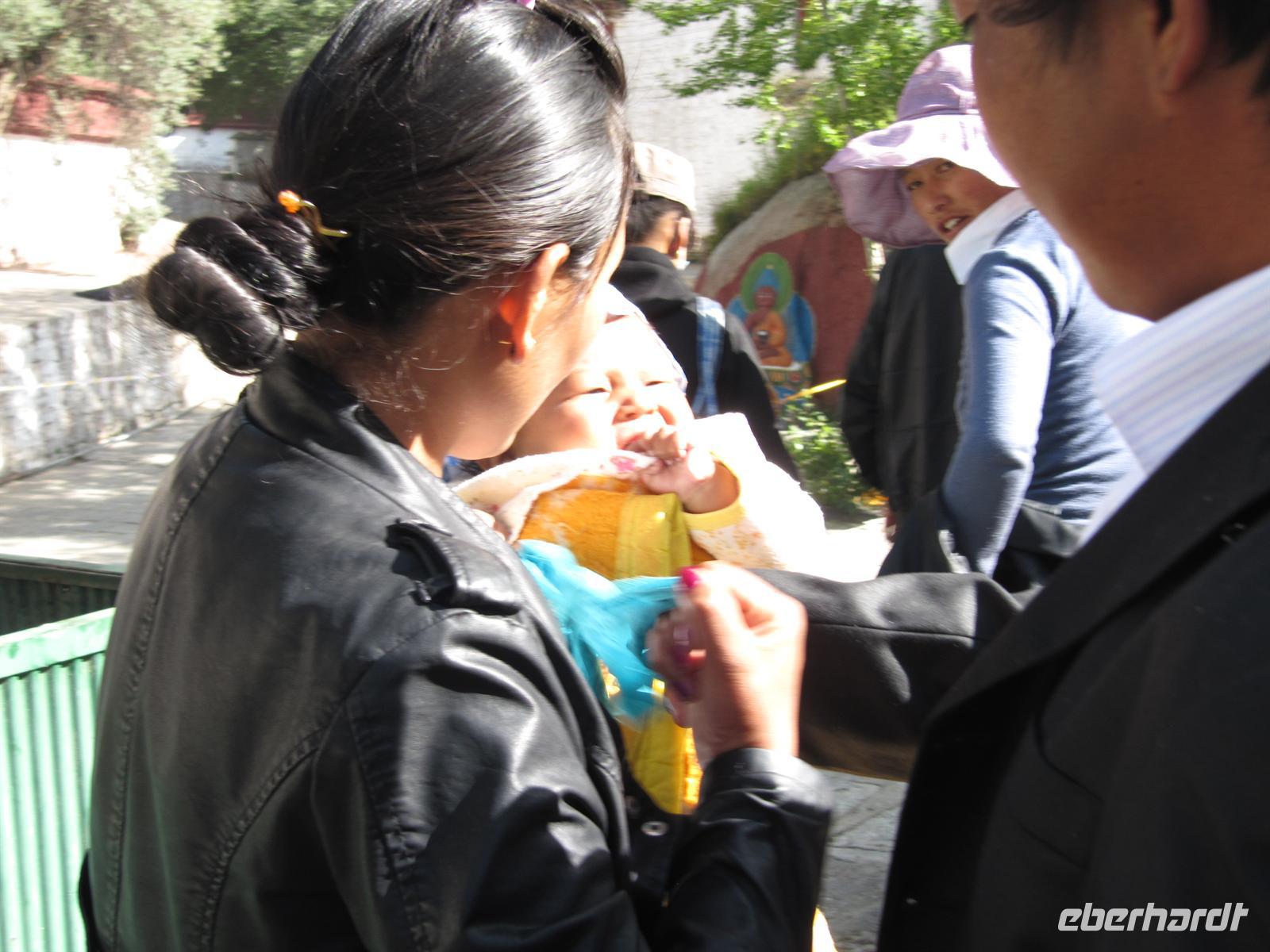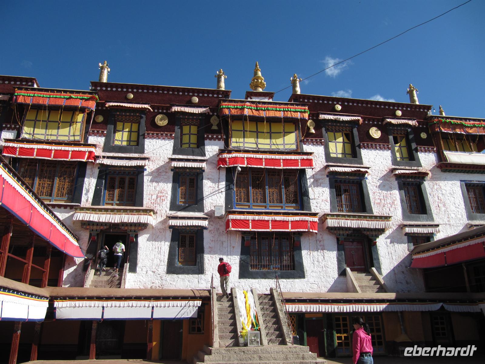 Es stimmt einen ein wenig traurig, wenn man bedenkt, dass die Buddhisten hier ihre Religion nicht frei ausleben dürfen. Wir suchen uns somit unseren Weg durch das Kloster und passen auf, dass Niemand in den Massen verloren geht. Fast werden wir hier schon selbst zu Pilgern. Überall ertönt das Gebetslied "Om mani padme hum", welcher uns noch lange auf unserer Reise begleiten wird.
