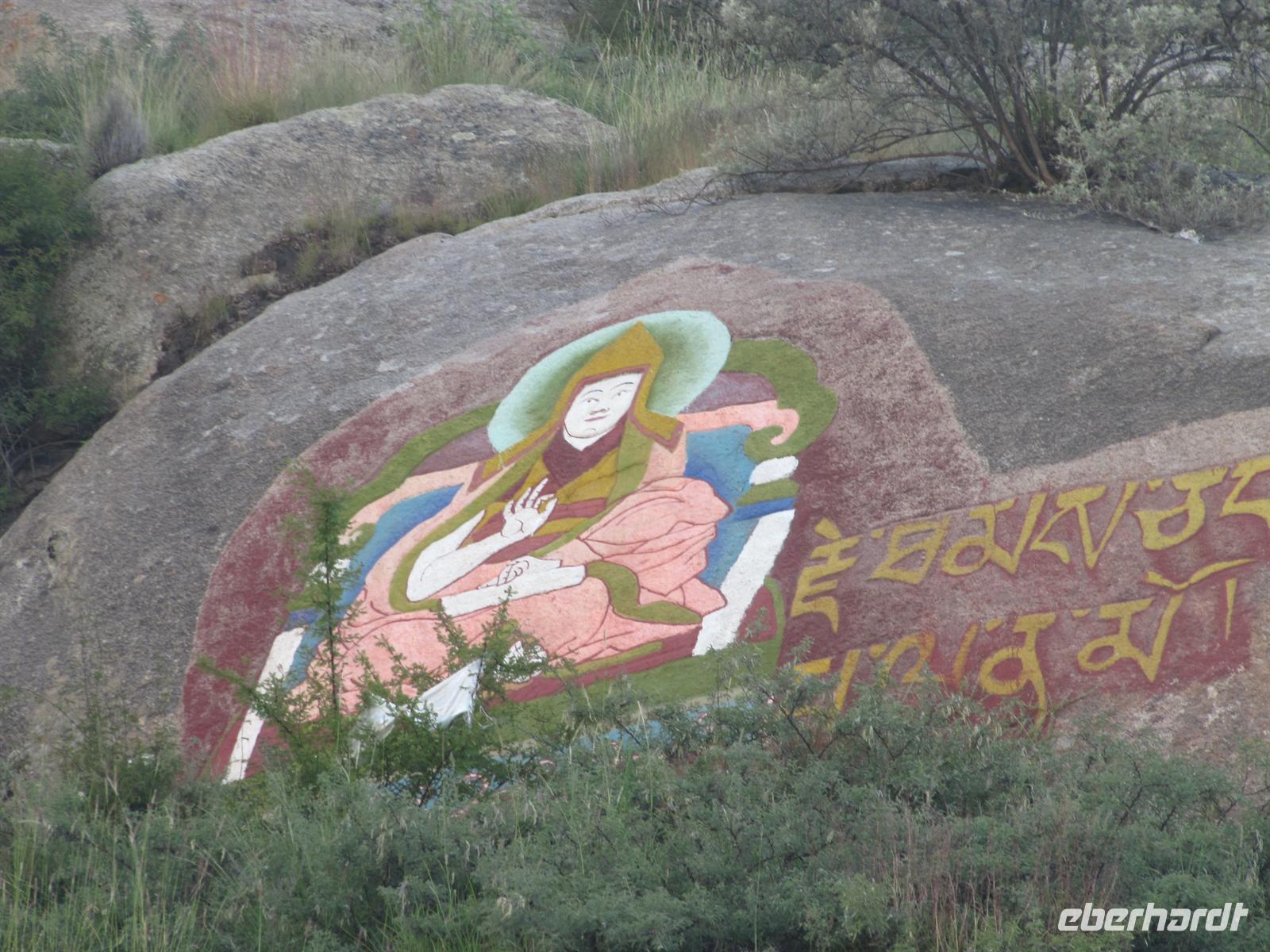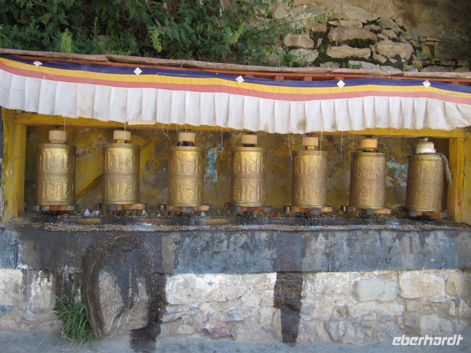 Die Worte stehen für die Zusammenfassung der 84.000 Lehrreden des Buddha. Es ist die Essenz aller Tathagata (die Qualitäten der Erleuchteten Wesen), aller Mantras (Gebete oder Hymnen) und aller Tantras (Buddhistische Mystik und Ritual). Es ist die Quelle allen Wissens und aller Errungenschaft. Wir sehen tausende Gebetstrommeln und zahlreiche Mönche, die hier leben. Noch nie haben wir solch eine religiöse Aura gespürt.