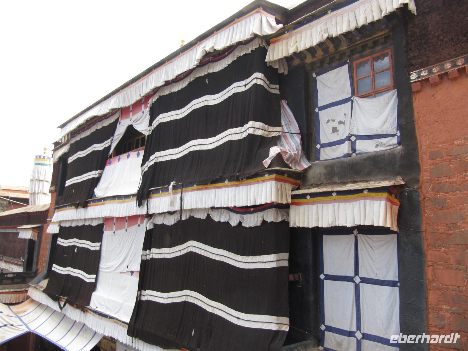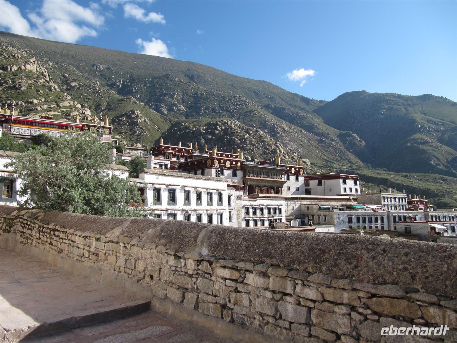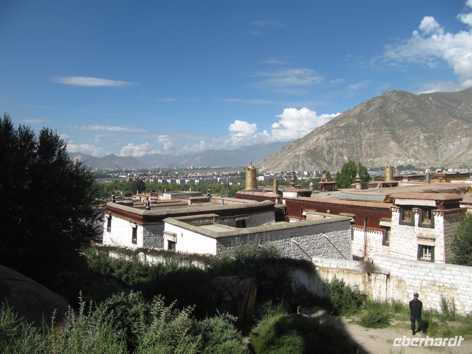 Heute erwartet uns das für gestern geplante . Auf unserem Weg dorthin sehen wir die Ausmaße des Pilgerfestes Etwas stürmisch muss es wohl zugegangen sein. Zumindest ist heute fast keine Menschenseele mehr auf den Straßen von Lhasa zu sehen. So genießen wir heute die Ruhe, die uns das Kloster bietet. So können wir uns doch besser einlassen auf dessen Anziehungskraft. Mit einer Fläche von 250,000 Quadratmetern wurde es 7700 Mönche bewohnt und besaß insgesamt 141 Prairien und 540 Weiden in seiner Blütezeit. Aus der Ferne sieht seine große, weiße Konstruktion wie ein Haufen Reis aus.