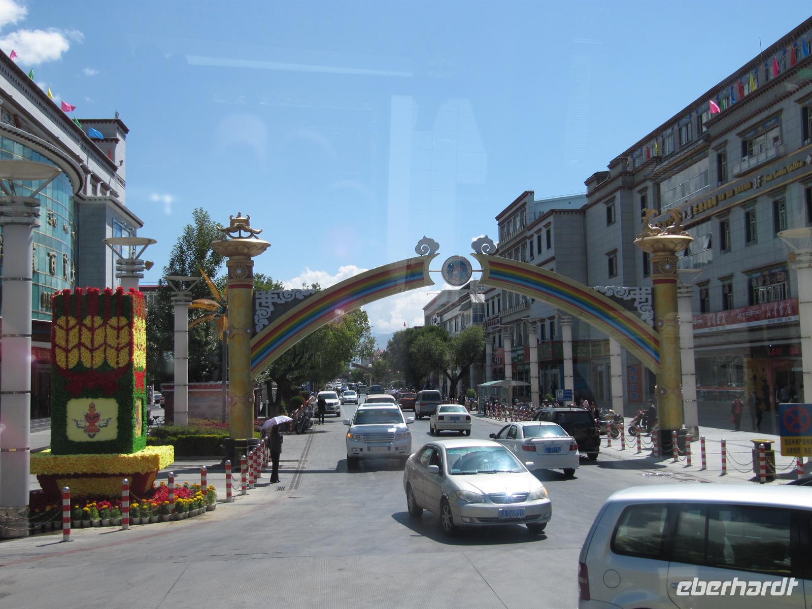 Gegen 17:00 Uhr erreichen wir die heilige Stätte Lhasa ist das politische, wirtschaftliche und kulturelle Zentrum sowie der Verkehrsknotenpunkt Tibets. Lhasa bedeutet auf tibetisch Götterort, denn hier lebte der als Gottkönig verehrte Dalai Lama. Schon bei der Ankunft spüren wir die unheimlich religiöse Aura der Stadt.
